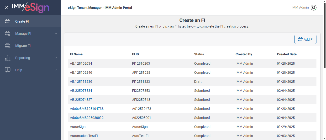 Manage FI title displayed in 'Manage FI' page [ScreenShot]