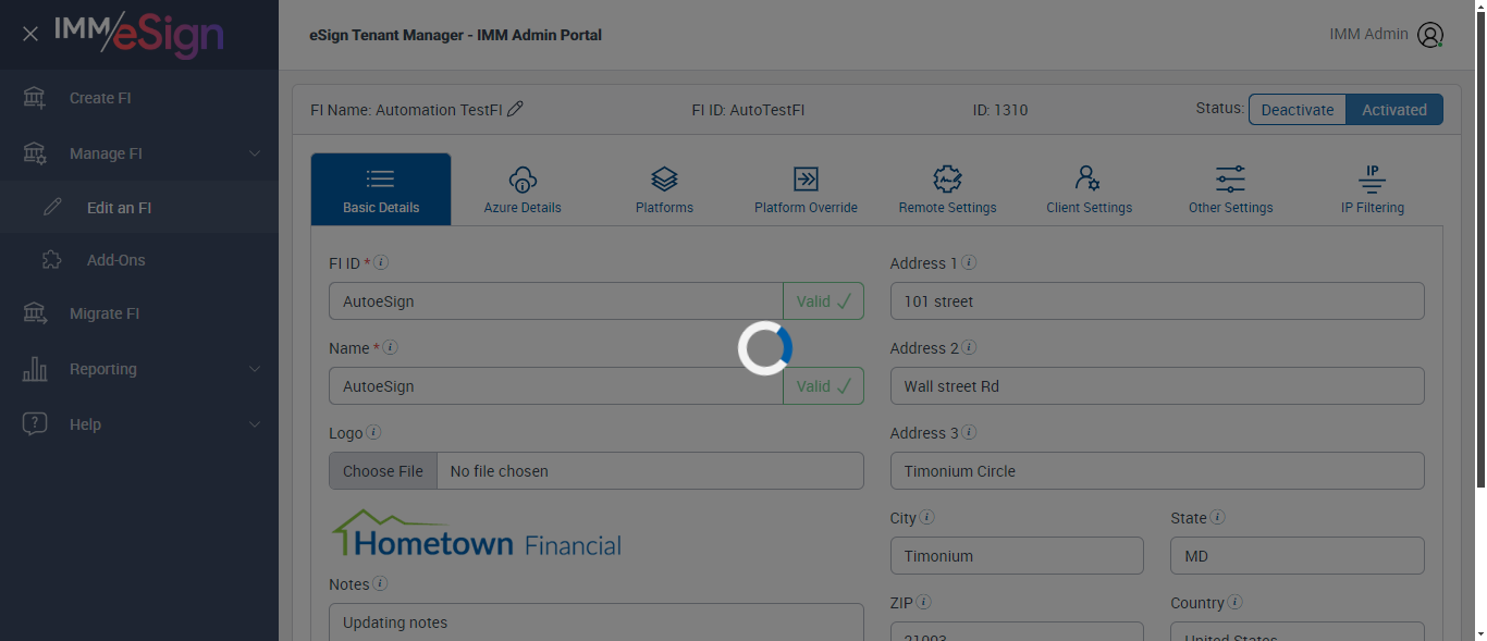({ZIP=0756, Description=Verify Swithing between FI's in ManageFI Page, Login_User_ID=IMMAdmin@immpartners.onmicrosoft.com, Platform=, ShortName=, Filepath=, Name=AUTest, LocalDomain=, TestID=verifySwitchingBetweenFIs, Dictionary Code=, createdFIStatus=, Notes=Test, Session URL=https://partners.immesign.com/tenantmanagerui/, GlobalAdmin=, eSign URL=, New Column=, TypeOfUser=HostAdmin, ErrorMsg=FI Id already exists;Must be up to 10 characters with no spaces and special characters.;Must be up to 10 characters with no spaces and special characters.;;, Address2=building 1, AZDomain=, Address3=123, FI_ID=AutoeSign, Address1=2 City hall Plaza, City=Rahway, Dictionary Description=, Logo=, NameDescription=, WrongAZDomain=, Tab=, State=NJ, Login_Password=Baxu003107, FullName=, Country=USA, Dictionaries To Be Select=, ButtonToClick=, FIID=espxml;Test Fi;Fi&2;ABCDCompany})