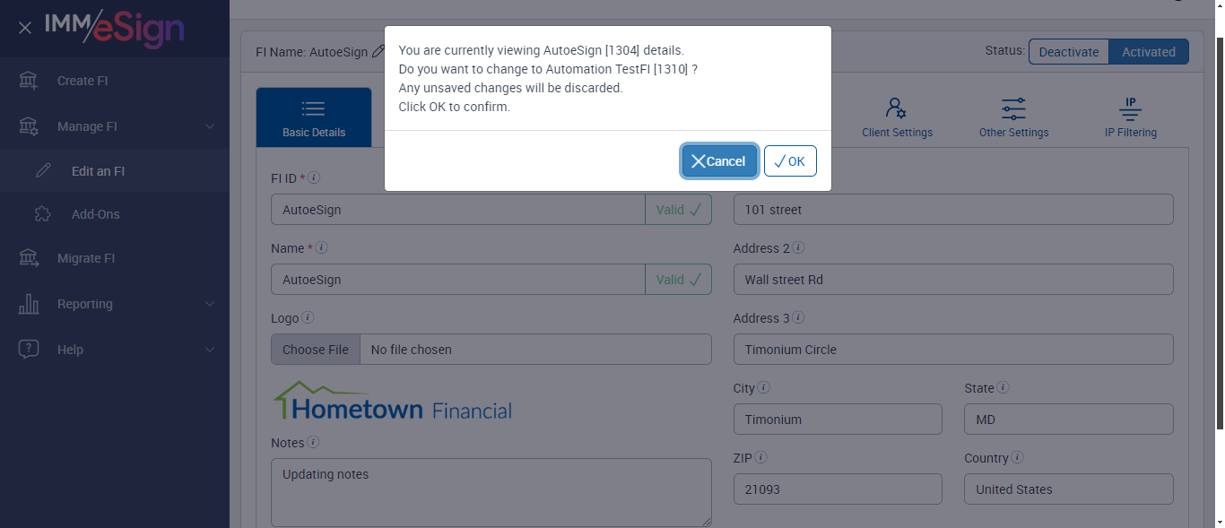 verifySwitchingBetweenFIs({ZIP=0756, Description=Verify Swithing between FI's in ManageFI Page, Login_User_ID=IMMAdmin@immpart...)