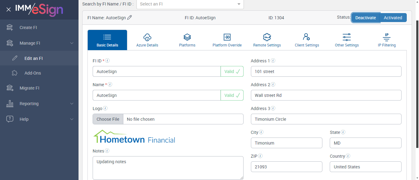Manage FI title displayed in 'Manage FI' page [ScreenShot]