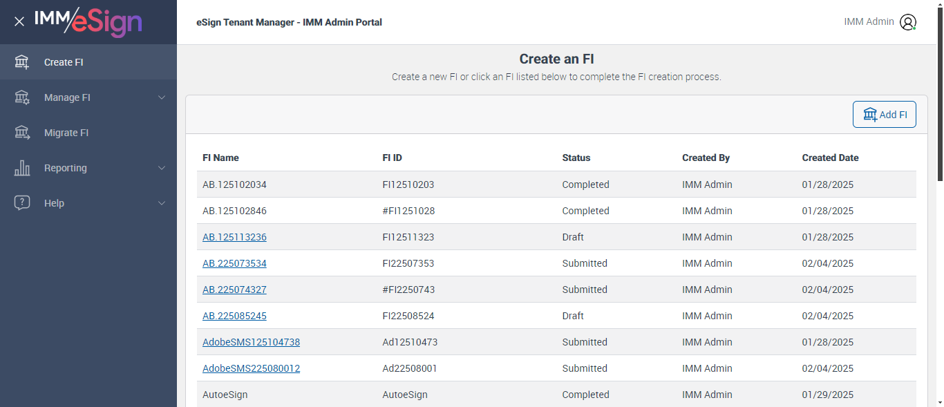 Manage FI title displayed in 'Manage FI' page [ScreenShot]