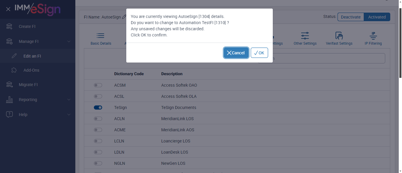 Manage FI title displayed in 'Manage FI' page [ScreenShot]