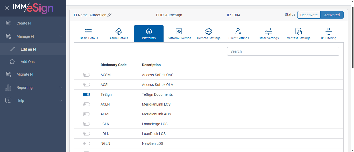 (Verify Swithing between FI's in Platforms tab ManageFI Page)