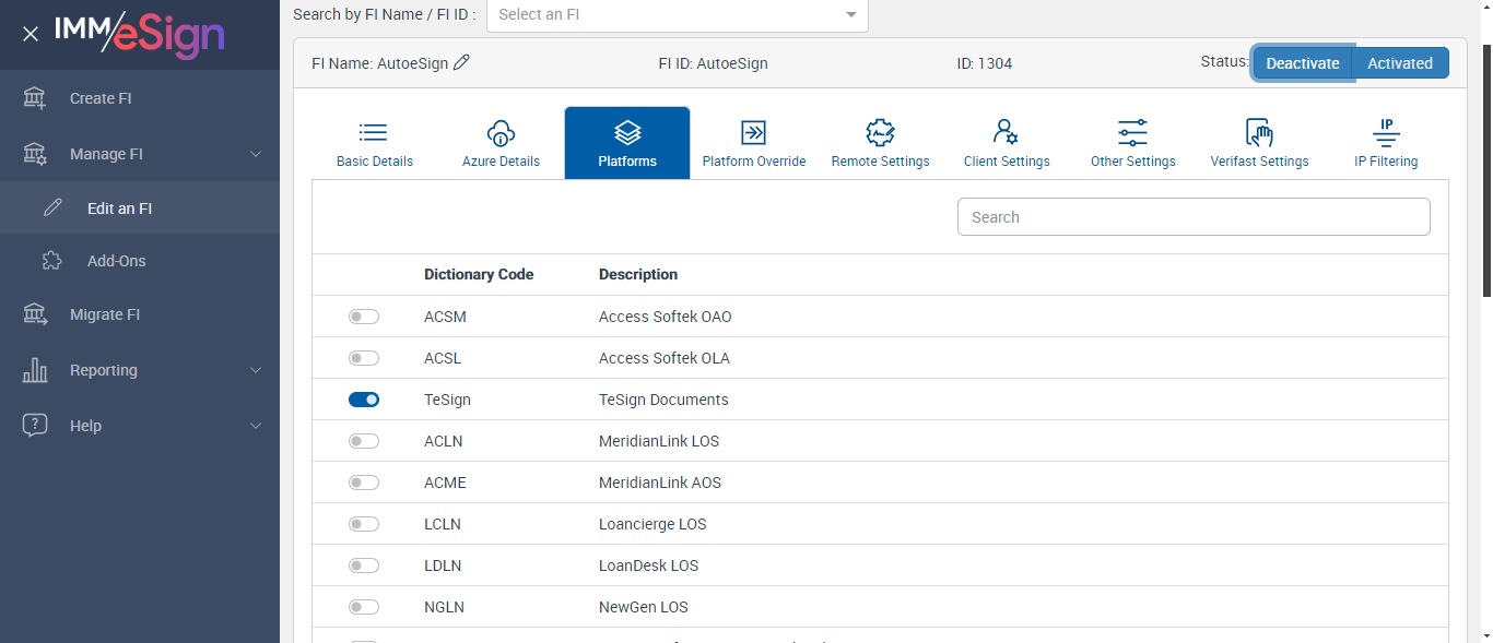 (Verify Swithing between FI's in Platforms tab ManageFI Page)