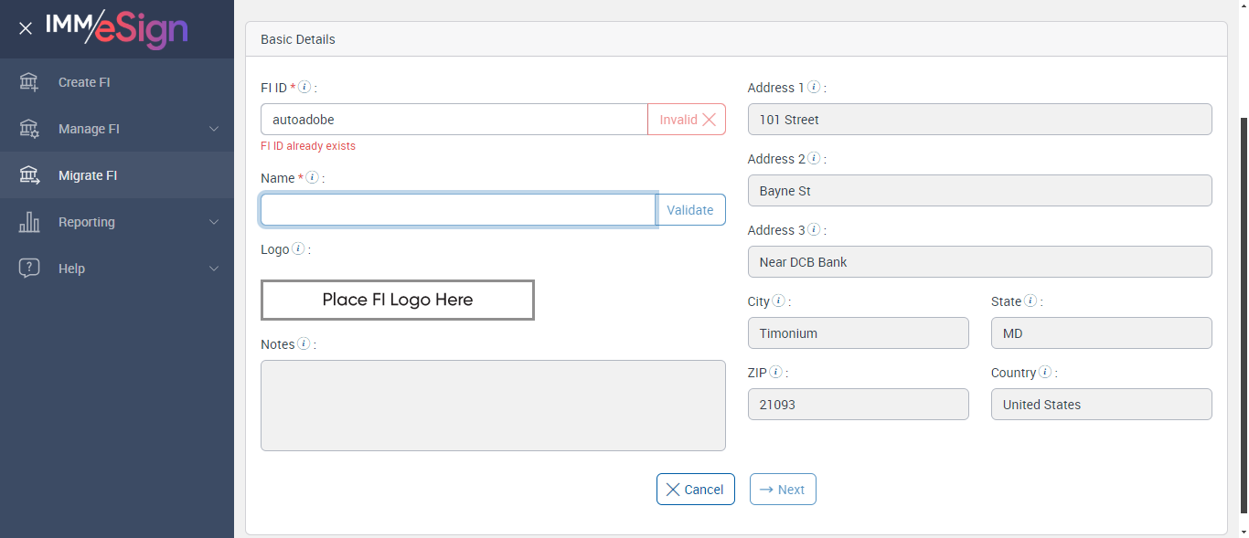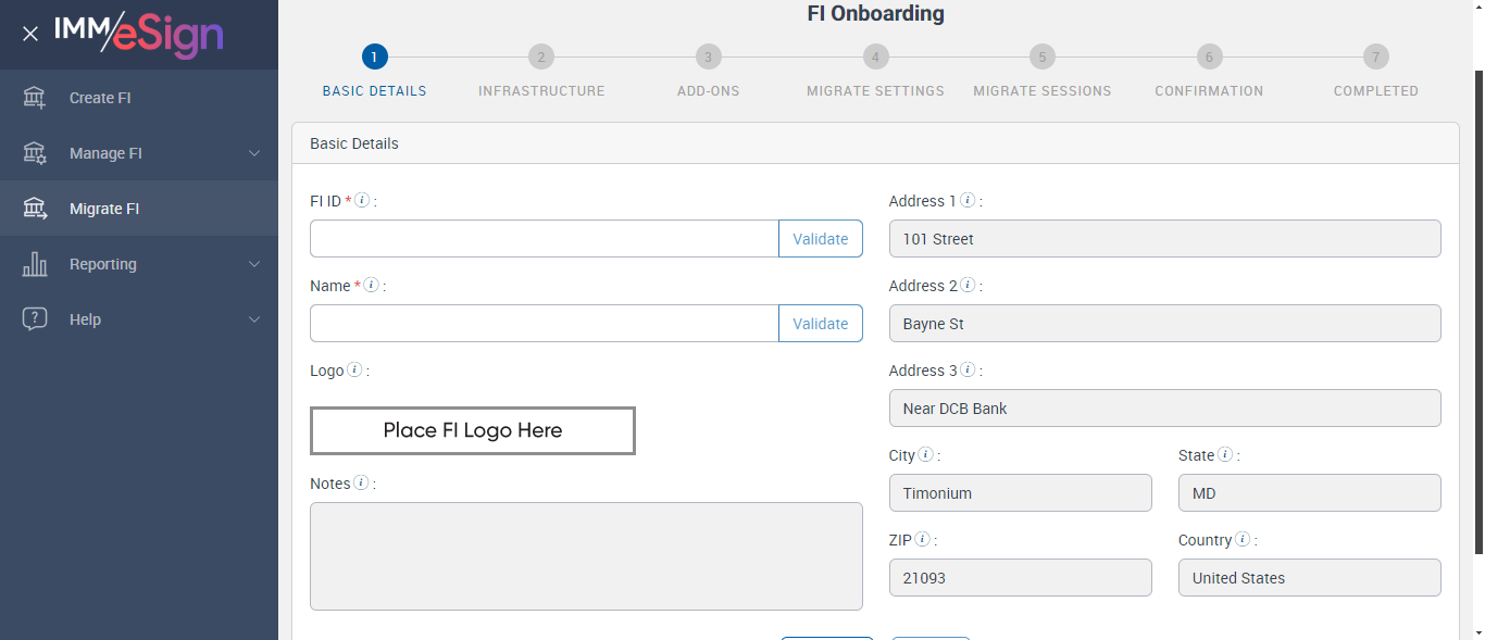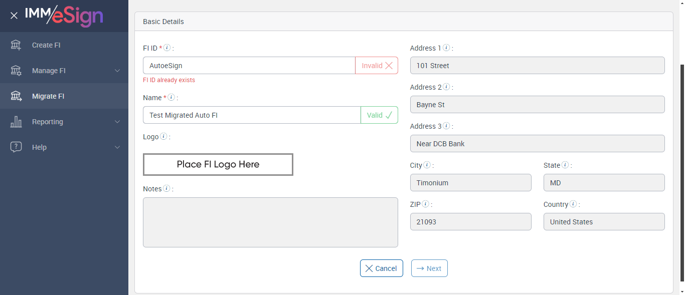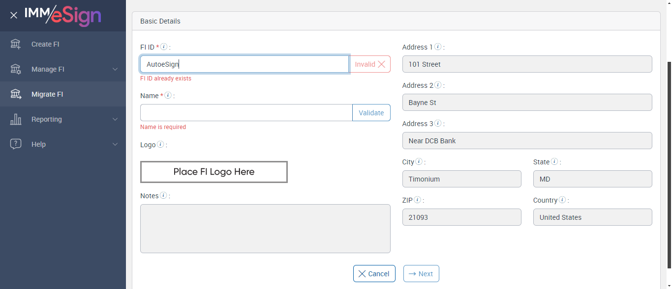 basicDetailsValues [AutoeSign, Test Migrated Auto FI, , 101 Street, Bayne St, Near DCB Bank, Timonium, MD, United States, 21093]
