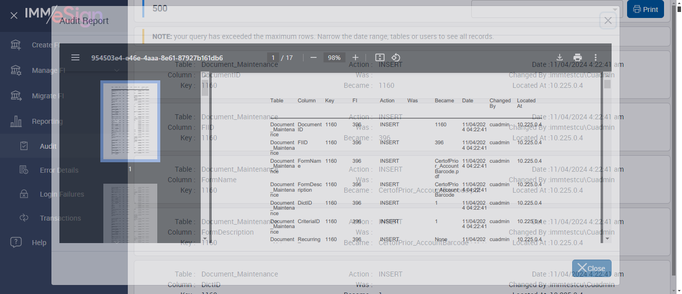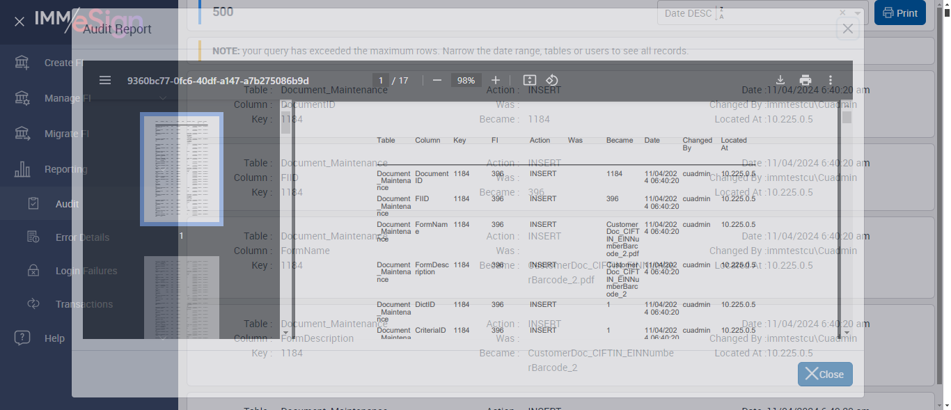 ({Description=Verify Audit report, Login_User_ID=immadmin2@immesignqa.onmicrosoft.com, dateRange=Past 3 Days,Past 7 Days,Past 14 Days,Past 21 Days,Past 30 Days,Previous Week,Previous Month, FI_ID=AutoTestFI, CreateFI URL=, Name=AUTest, StartDate=, indexValues=ClientWorkstations,Contacts,Criteria,Dictionaries,Document_Maintenance,Document_Sets,Document_Sets_Detail,eSignClientSettings,FI,FIHOSTSystems,FISettings,GroupDocuments,GroupDocumentSets,GroupPermissions,GroupPermissionSets,Groups,HostSettings,HostSystem,IndexFields,IndexFieldTypes,UserGroups,UserPermissions,UserPermissionSets,Users, TestID=verifyAuditReport, Login_Password=iMM@2022, user=cuadmin, ManageFI URL=, Session URL=https://esignnonprod.immesign.com/qa/tenantmanager/})