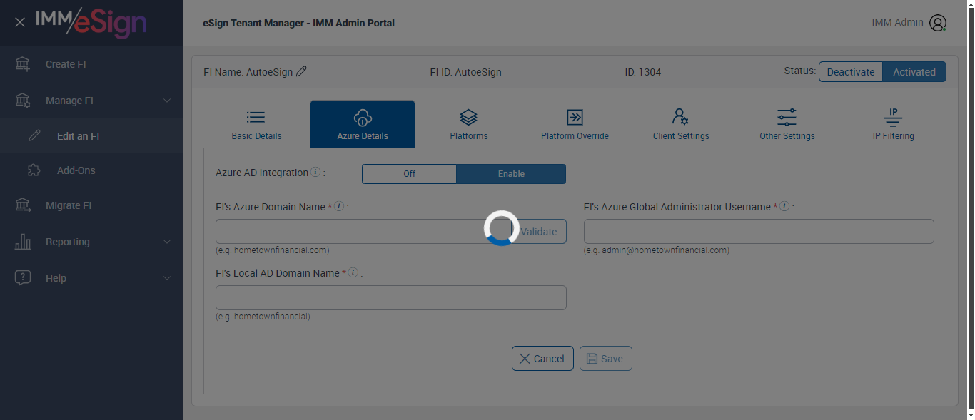({ZIP=0756, Description=Verify Addon Page, Login_User_ID=IMMAdmin@immpartners.onmicrosoft.com, Platform=, ShortName=, Filepath=, Name=AUTest, LocalDomain=, TestID=VerifyAddonPage, Dictionary Code=TeSign,XPLN,MSP,ACSM,ACSL,LCLN,LDLN,SENR,UMEM,ULEN,ACLN,ACME,OSISSM,CRME,CRLN,SYLN,SYMS,SLEN,NSME, createdFIStatus=Draft, Notes=Test, Session URL=https://partners.immesign.com/tenantmanagerui/, GlobalAdmin=, eSign URL=https://esignplusqa.immesign.com/teaasp/login.aspx, New Column=, TypeOfUser=HostAdmin, ErrorMsg=Do you want to discard the changes?,Changes saved successfully., Address2=building 1, AZDomain=, Address3=123, FI_ID=AutoeSign, Address1=2 City hall Plaza, City=Rahway, Dictionary Description=TeSign Documents,XP2 LOS,XP2 Core,Access Softek OAO,Access Softek OLA,Loancierge LOS,LoanDesk LOS,Dictionary for SymApp Membership Dictionary,DataSafe Core,DataSafe LOS,MeridianLink LOS,MeridianLink AOS,DNA Core,KeyStone Core,KeyStone LOS,Symitar LOS,Symitar Core,Spectrum LOS,Spectrum Core, Logo=, NameDescription=, WrongAZDomain=, Tab=Basic Details,Azure Details,Platforms,Platform Override,Remote Settings,Client Settings,Other Settings,Verifast Settings,IP Filtering, State=NJ, Login_Password=Baxu003107, FullName=, Country=USA, Dictionaries To Be Select=TeSign,XPLN,MSP,ACSM,ACSL,LCLN,LDLN,SENR,UMEM,ULEN,ACLN, ButtonToClick=Cancel, FIID=espRTS,,Test Fi})