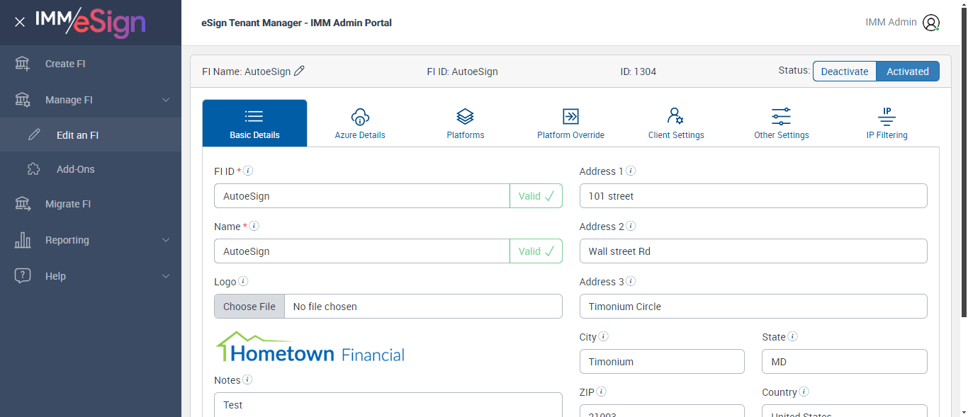 ({ZIP=0756, Description=Verify Addon Page, Login_User_ID=IMMAdmin@immpartners.onmicrosoft.com, Platform=, ShortName=, Filepath=, Name=AUTest, LocalDomain=, TestID=VerifyAddonPage, Dictionary Code=TeSign,XPLN,MSP,ACSM,ACSL,LCLN,LDLN,SENR,UMEM,ULEN,ACLN,ACME,OSISSM,CRME,CRLN,SYLN,SYMS,SLEN,NSME, createdFIStatus=Draft, Notes=Test, Session URL=https://partners.immesign.com/tenantmanagerui/, GlobalAdmin=, eSign URL=https://esignplusqa.immesign.com/teaasp/login.aspx, New Column=, TypeOfUser=HostAdmin, ErrorMsg=Do you want to discard the changes?,Changes saved successfully., Address2=building 1, AZDomain=, Address3=123, FI_ID=AutoeSign, Address1=2 City hall Plaza, City=Rahway, Dictionary Description=TeSign Documents,XP2 LOS,XP2 Core,Access Softek OAO,Access Softek OLA,Loancierge LOS,LoanDesk LOS,Dictionary for SymApp Membership Dictionary,DataSafe Core,DataSafe LOS,MeridianLink LOS,MeridianLink AOS,DNA Core,KeyStone Core,KeyStone LOS,Symitar LOS,Symitar Core,Spectrum LOS,Spectrum Core, Logo=, NameDescription=, WrongAZDomain=, Tab=Basic Details,Azure Details,Platforms,Platform Override,Remote Settings,Client Settings,Other Settings,Verifast Settings,IP Filtering, State=NJ, Login_Password=Baxu003107, FullName=, Country=USA, Dictionaries To Be Select=TeSign,XPLN,MSP,ACSM,ACSL,LCLN,LDLN,SENR,UMEM,ULEN,ACLN, ButtonToClick=Cancel, FIID=espRTS,,Test Fi})