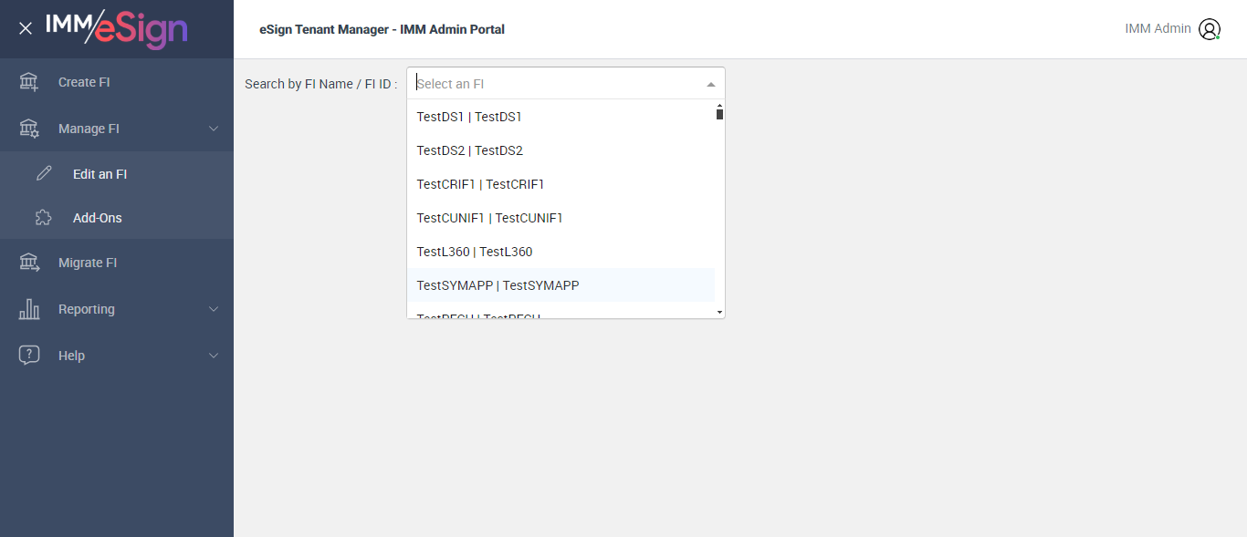 'Search by FI Name/Host FIID' displayed in 'Manage FI' page [ScreenShot]