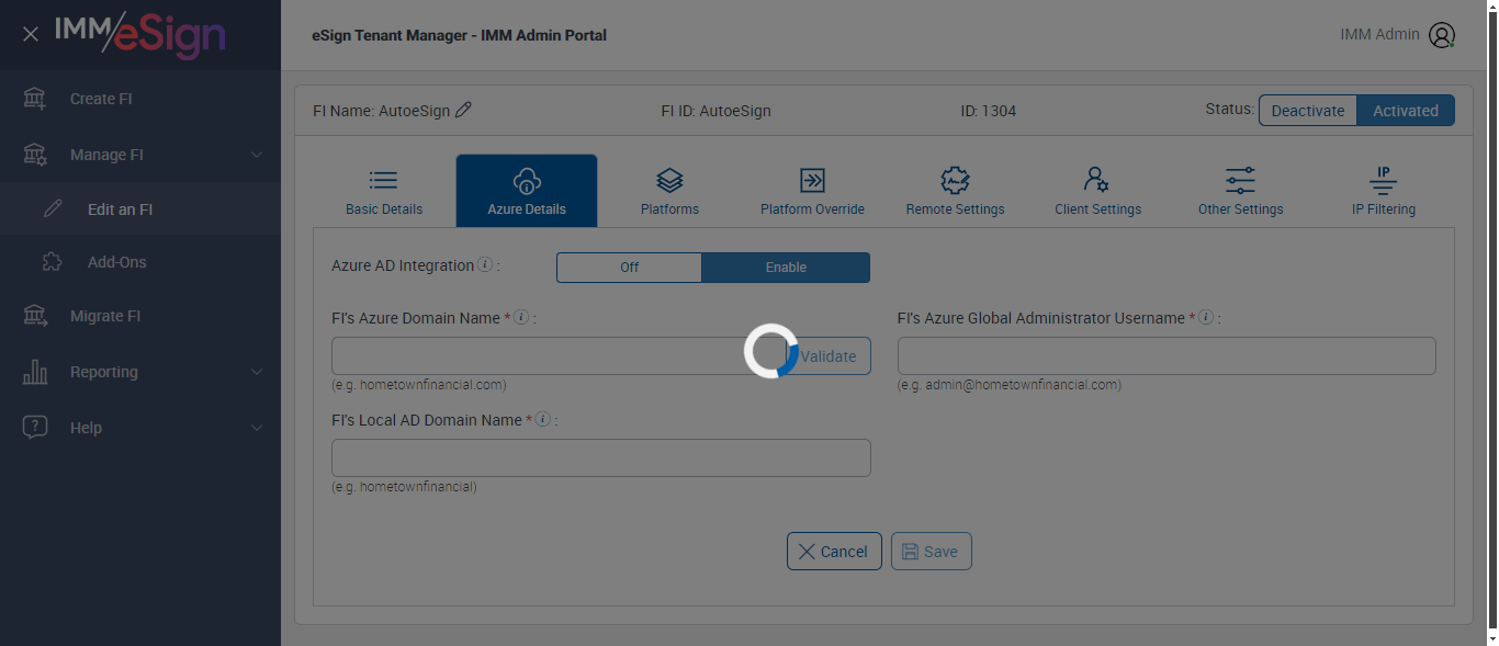({ZIP=0756, Description=Verify Addon Page, Login_User_ID=IMMAdmin@immpartners.onmicrosoft.com, Platform=, ShortName=, Filepath=, Name=AUTest, LocalDomain=, TestID=VerifyAddonPage, Dictionary Code=TeSign,XPLN,MSP,ACSM,ACSL,LCLN,LDLN,SENR,UMEM,ULEN,ACLN,ACME,OSISSM,CRME,CRLN,SYLN,SYMS,SLEN,NSME, createdFIStatus=Draft, Notes=Test, Session URL=https://partners.immesign.com/tenantmanagerui/, GlobalAdmin=, eSign URL=https://esignplusqa.immesign.com/teaasp/login.aspx, New Column=, TypeOfUser=HostAdmin, ErrorMsg=Do you want to discard the changes?,Changes saved successfully., Address2=building 1, AZDomain=, Address3=123, FI_ID=AutoeSign, Address1=2 City hall Plaza, City=Rahway, Dictionary Description=TeSign Documents,XP2 LOS,XP2 Core,Access Softek OAO,Access Softek OLA,Loancierge LOS,LoanDesk LOS,Dictionary for SymApp Membership Dictionary,DataSafe Core,DataSafe LOS,MeridianLink LOS,MeridianLink AOS,DNA Core,KeyStone Core,KeyStone LOS,Symitar LOS,Symitar Core,Spectrum LOS,Spectrum Core, Logo=, NameDescription=, WrongAZDomain=, Tab=Basic Details,Azure Details,Platforms,Platform Override,Remote Settings,Client Settings,Other Settings,Verifast Settings,IP Filtering, State=NJ, Login_Password=Baxu003107, FullName=, Country=USA, Dictionaries To Be Select=TeSign,XPLN,MSP,ACSM,ACSL,LCLN,LDLN,SENR,UMEM,ULEN,ACLN, ButtonToClick=Cancel, FIID=espRTS,,Test Fi})