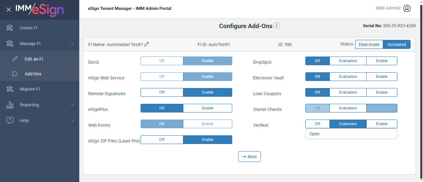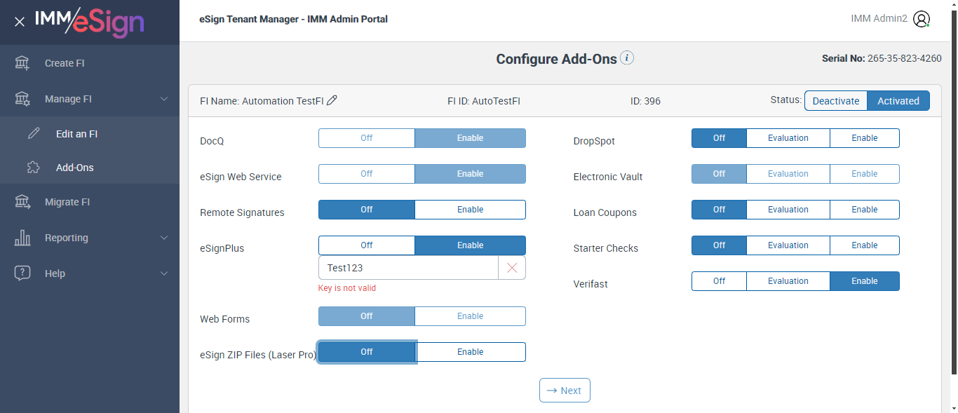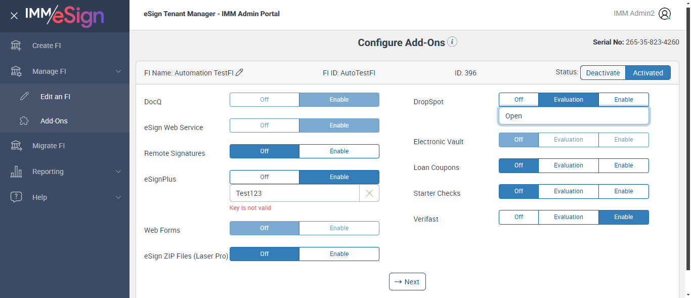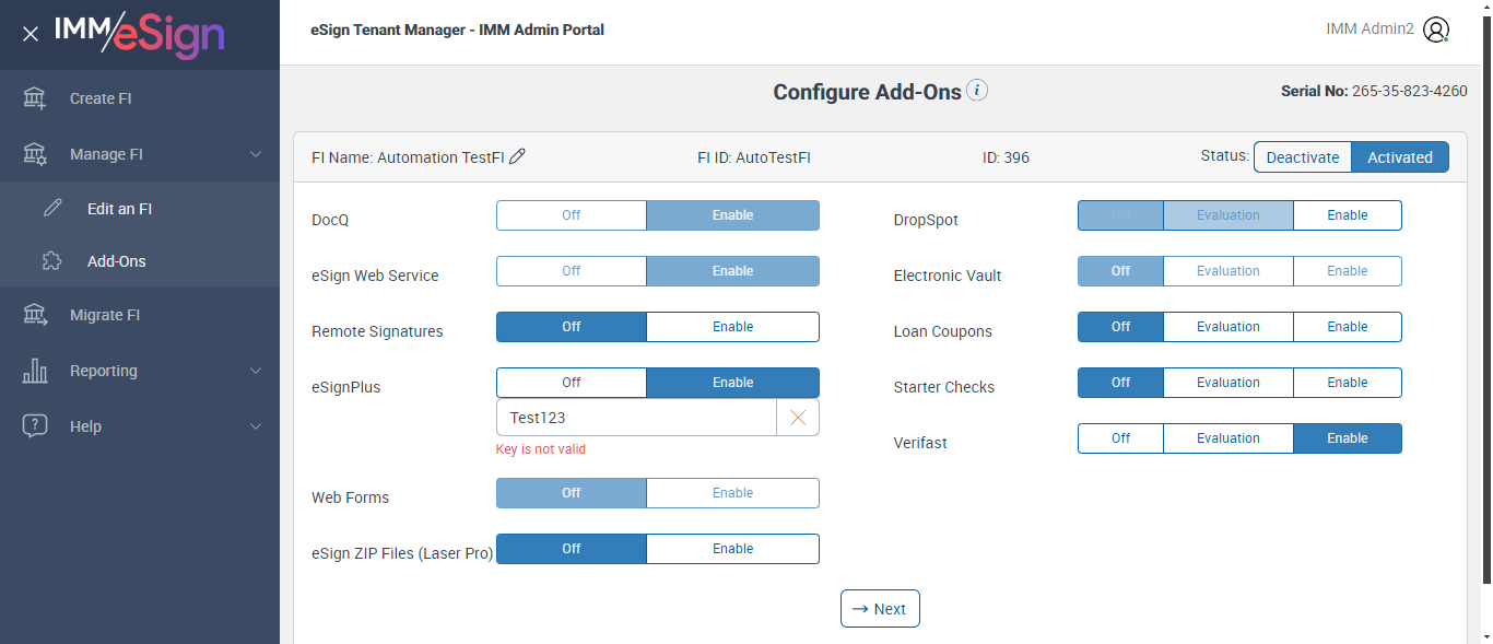 ({ZIP=0756, Description=Verify Addon Page, Login_User_ID=immadmin2@immesignqa.onmicrosoft.com, Platform=, ShortName=, Filepath=, Name=AUTest, LocalDomain=, TestID=VerifyAddonPage, Dictionary Code=TeSign,XPLN,MSP,ACSM,ACSL,LCLN,LDLN,SENR,UMEM,ULEN,ACLN,ACME,OSISSM,CRME,CRLN,SYLN,SYMS,SLEN,NSME, createdFIStatus=Draft, Notes=Test, Session URL=https://esignnonprod.immesign.com/qa/tenantmanager/, GlobalAdmin=, eSign URL=https://esignplusqa.immesign.com/teaasp/login.aspx, New Column=, TypeOfUser=HostAdmin, ErrorMsg=Do you want to discard the changes?,Changes saved successfully., Address2=building 1, AZDomain=, Address3=123, FI_ID=AutoTestFI, Address1=2 City hall Plaza, City=Rahway, Dictionary Description=TeSign Documents,XP2 LOS,XP2 Core,Access Softek OAO,Access Softek OLA,Loancierge LOS,LoanDesk LOS,Dictionary for SymApp Membership Dictionary,DataSafe Core,DataSafe LOS,MeridianLink LOS,MeridianLink AOS,DNA Core,KeyStone Core,KeyStone LOS,Symitar LOS,Symitar Core,Spectrum LOS,Spectrum Core, Logo=, NameDescription=, WrongAZDomain=, Tab=Basic Details,Azure Details,Platforms,Platform Override,Remote Settings,Client Settings,Other Settings,Verifast Settings,IP Filtering, State=NJ, Login_Password=iMM@2022, FullName=, Country=USA, Dictionaries To Be Select=TeSign,XPLN,MSP,ACSM,ACSL,LCLN,LDLN,SENR,UMEM,ULEN,ACLN, ButtonToClick=Cancel, FIID=espRTS,,Test Fi})