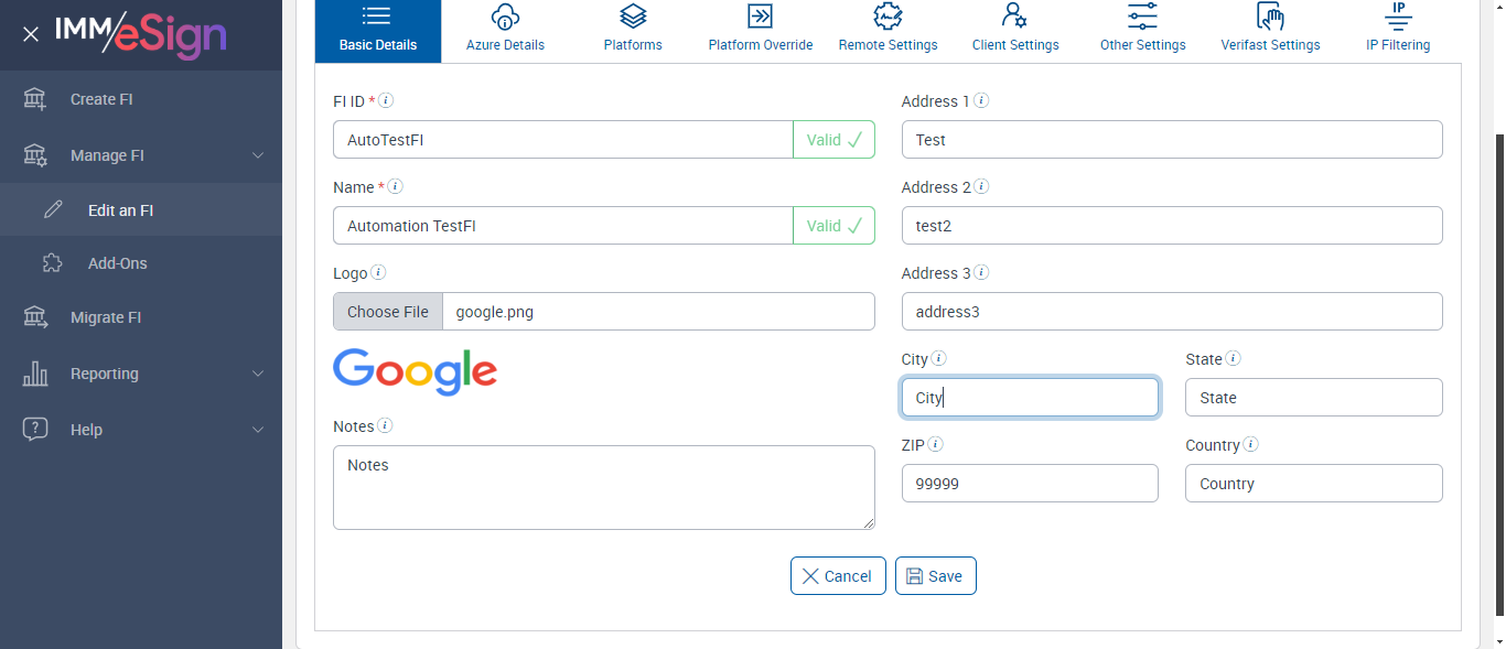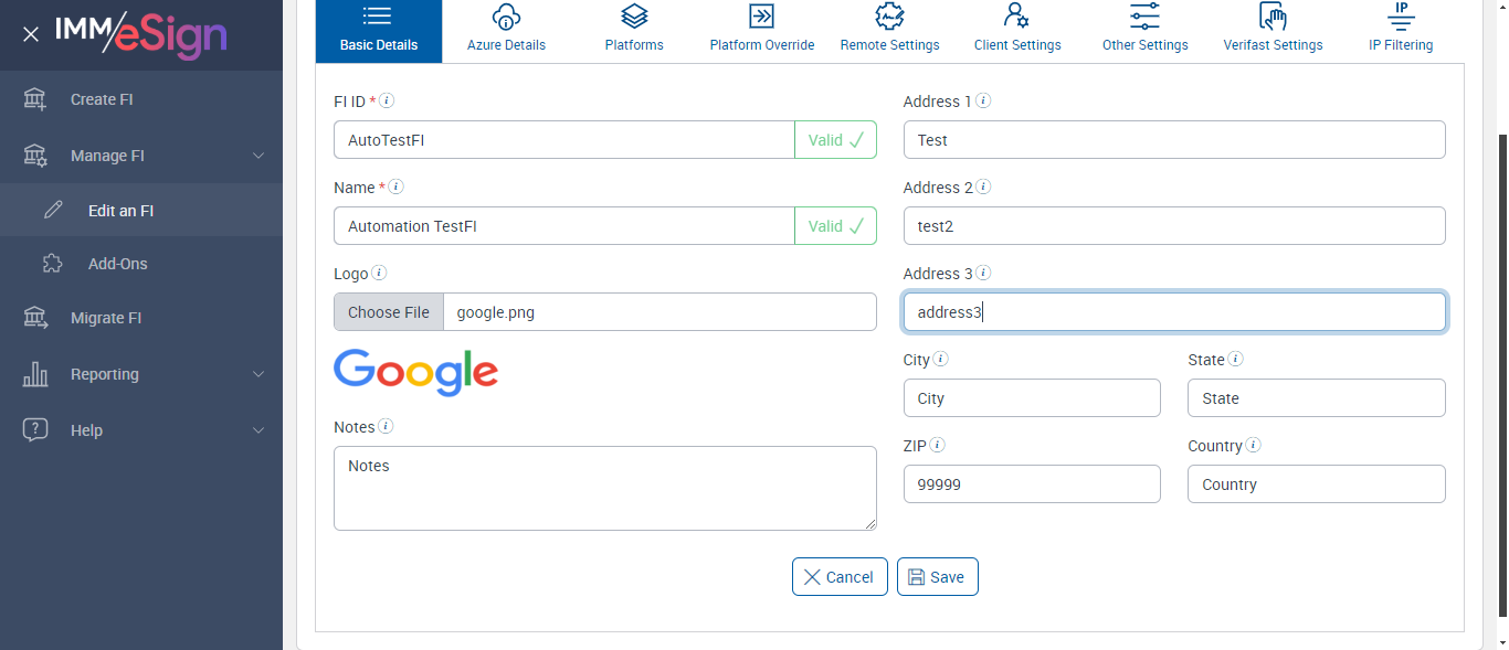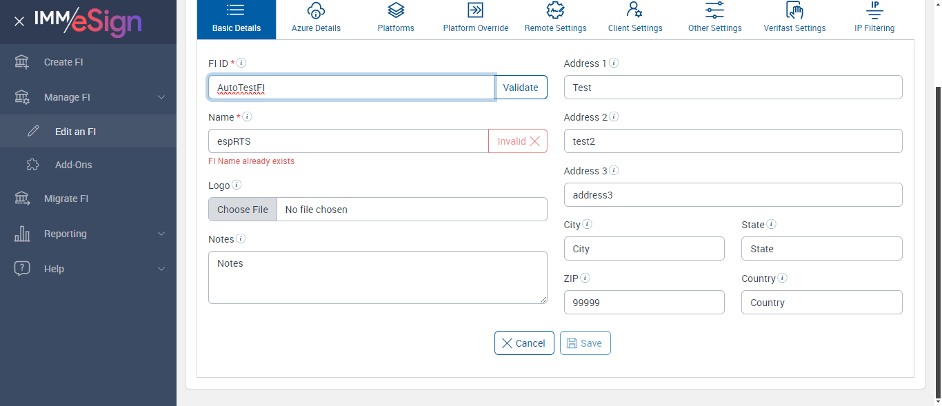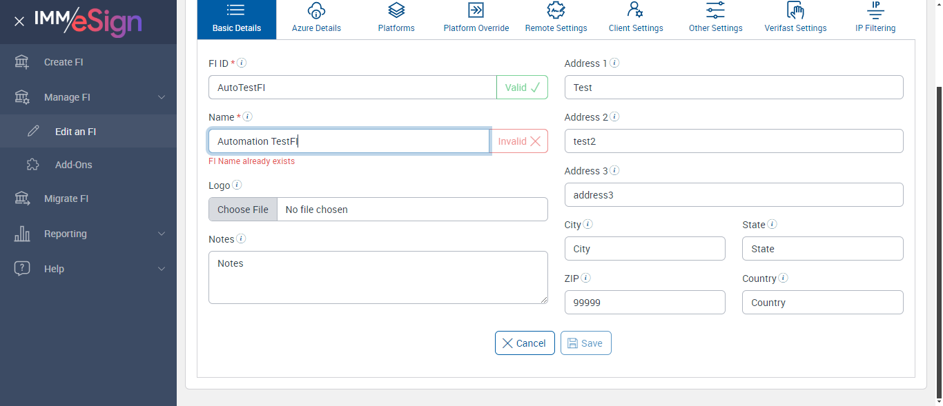 ({ZIP=0756, Description=Verify FI Details and Settings should be categorized into a logical grouping, Login_User_ID=immadmin2@immesignqa.onmicrosoft.com, Platform=, ShortName=, Filepath=, Name=AUTest, LocalDomain=, TestID=verifyFIDetailsInDifferentSettingsTabs, Dictionary Code=, createdFIStatus=Draft, Notes=Test, Session URL=https://esignnonprod.immesign.com/qa/tenantmanager/, GlobalAdmin=, eSign URL=https://esignplusqa.immesign.com/teaasp/login.aspx, New Column=, TypeOfUser=HostAdmin, ErrorMsg=FI Id already exists;Must be up to 10 characters with no spaces and special characters.;Must be up to 10 characters with no spaces and special characters.;;, Address2=building 1, AZDomain=, Address3=123, FI_ID=AutoTestFI, Address1=2 City hall Plaza, City=Rahway, Dictionary Description=, Logo=, NameDescription=, WrongAZDomain=, Tab=Basic Details,Azure Details,Platforms,Platform Override,Remote Settings,Client Settings,Other Settings,Verifast Settings,IP Filtering, State=NJ, Login_Password=iMM@2022, FullName=, Country=USA, Dictionaries To Be Select=, ButtonToClick=Save, FIID=espxml;Test Fi;Fi&2;ABCDCompany})