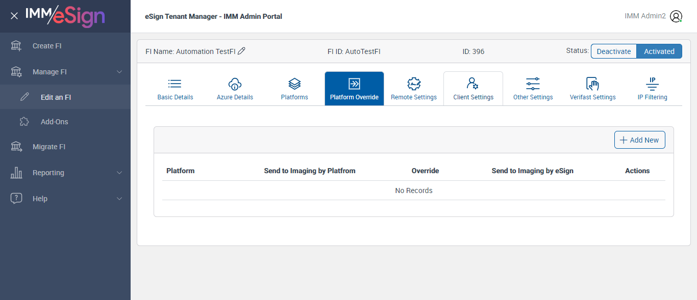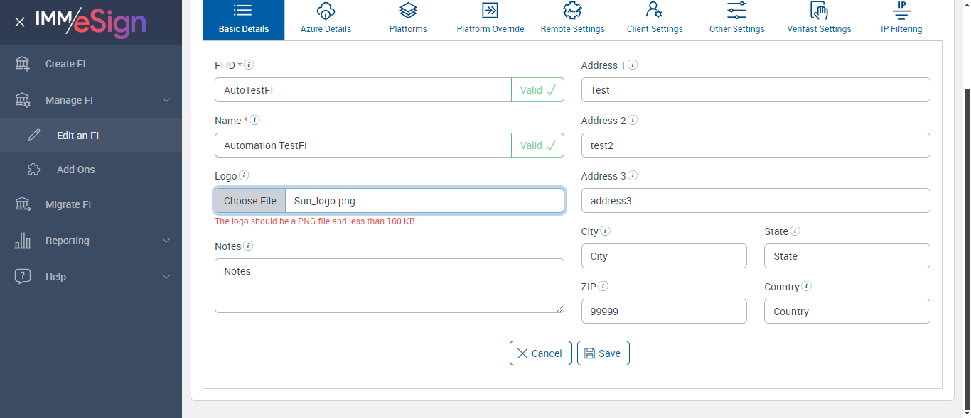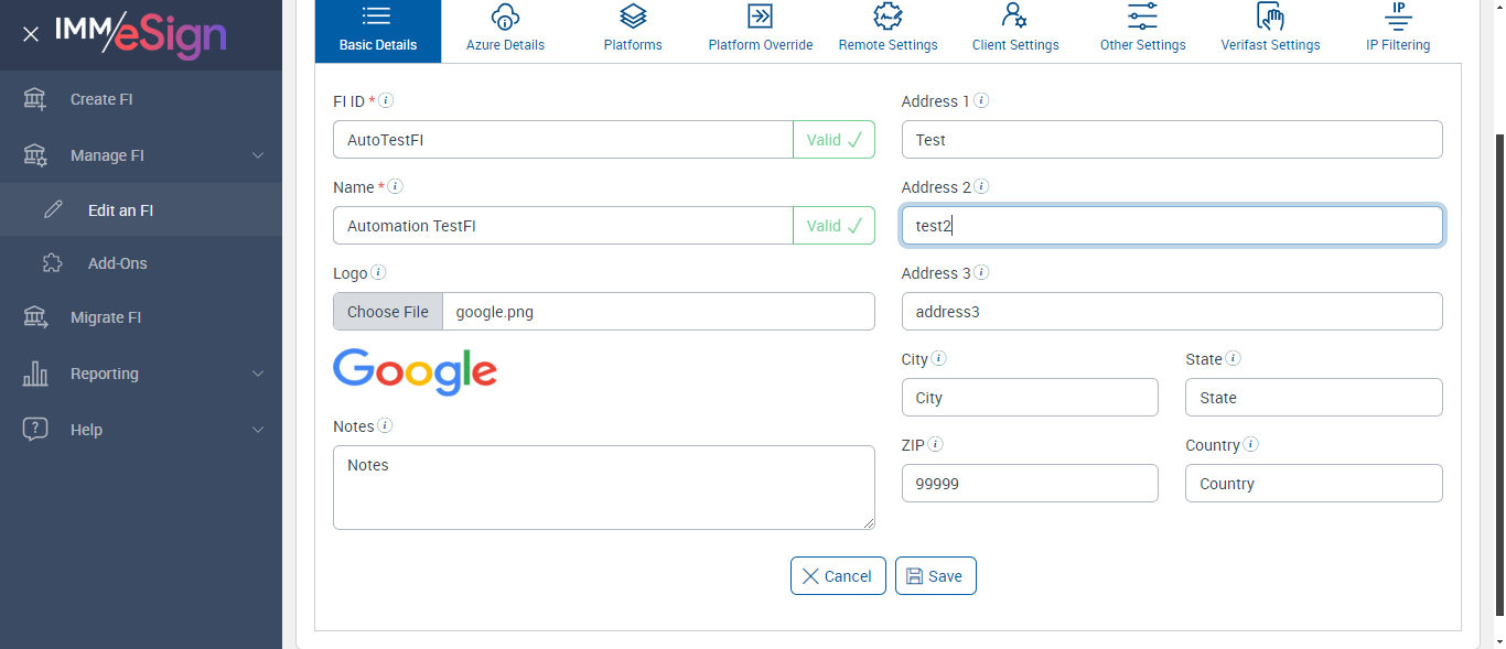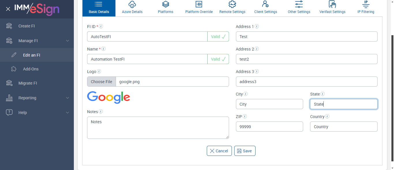 ({ZIP=0756, Description=Verify FI Details and Settings should be categorized into a logical grouping, Login_User_ID=immadmin2@immesignqa.onmicrosoft.com, Platform=, ShortName=, Filepath=, Name=AUTest, LocalDomain=, TestID=verifyFIDetailsInDifferentSettingsTabs, Dictionary Code=, createdFIStatus=Draft, Notes=Test, Session URL=https://esignnonprod.immesign.com/qa/tenantmanager/, GlobalAdmin=, eSign URL=https://esignplusqa.immesign.com/teaasp/login.aspx, New Column=, TypeOfUser=HostAdmin, ErrorMsg=FI Id already exists;Must be up to 10 characters with no spaces and special characters.;Must be up to 10 characters with no spaces and special characters.;;, Address2=building 1, AZDomain=, Address3=123, FI_ID=AutoTestFI, Address1=2 City hall Plaza, City=Rahway, Dictionary Description=, Logo=, NameDescription=, WrongAZDomain=, Tab=Basic Details,Azure Details,Platforms,Platform Override,Remote Settings,Client Settings,Other Settings,Verifast Settings,IP Filtering, State=NJ, Login_Password=iMM@2022, FullName=, Country=USA, Dictionaries To Be Select=, ButtonToClick=Save, FIID=espxml;Test Fi;Fi&2;ABCDCompany})