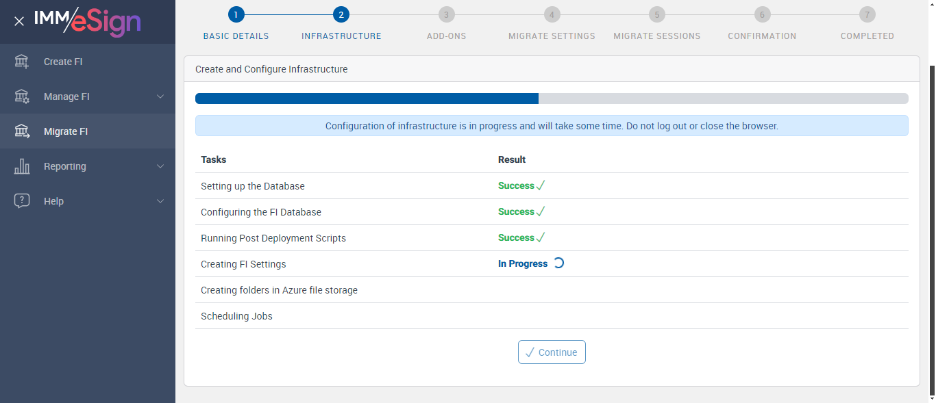 Must be in 99999 or 99999-9999 format.] * * FI ID * : equals FI ID * : Name * : equals Name * : Logo : equals Logo : Notes : equals Notes : Address 1 : equals Address 1 : Address 2 : equals Address 2 : Address 3 : equals Address 3 : City : equals City : State : equals State : ZIP : equals ZIP : Country : equals Country : Successfully validated Basic Details labels [ScreenShot] --- 07 May 14:42:50 613 - Element is displayed:: [[RemoteWebDriver: chrome on Windows 10 (a57c686b7fde976ce3f7811debce0752)] -> id: btnNext] --- 07 May 14:42:52 935 - Page URL:: https://esignnonprod.immesign.com/qa/tenantmanager/#/fi/migrate/basic --- 07 May 14:42:52 935 - 0 - Page Load Wait: (Sync) - com.imm.support.Utils.waitForPageLoad(Utils.java:136) --- 07 May 14:42:53 024 - Page URL:: https://esignnonprod.immesign.com/qa/tenantmanager/#/fi/migrate/basic --- 07 May 14:42:53 024 - 0 - Page Load Wait: (Sync) - com.imm.support.Utils.waitForPageLoad(Utils.java:136) --- 07 May 14:42:54 224 - Element is displayed:: [[RemoteWebDriver: chrome on Windows 10 (a57c686b7fde976ce3f7811debce0752)] -> xpath: //*[contains(text(),'Configure Infrastructure')]] --- 07 May 14:42:54 285 - Page URL:: https://esignnonprod.immesign.com/qa/tenantmanager/#/fi/migrate/infrastructure --- 07 May 14:42:54 285 - 0 - Page Load Wait: (Sync) - com.imm.support.Utils.waitForPageLoad(Utils.java:136) --- 07 May 14:42:54 356 - Element is displayed:: [[RemoteWebDriver: chrome on Windows 10 (a57c686b7fde976ce3f7811debce0752)] -> css selector: .header] ...........Migrate Fi - infrastructure Page............. Successfully navigated to the 'InfrastructurePage' page [ScreenShot] --- 07 May 14:42:54 564 - Element is displayed:: [[RemoteWebDriver: chrome on Windows 10 (a57c686b7fde976ce3f7811debce0752)] -> id: infraMessage] Verified Configuration message Continue button is disabled Found Result for Setting up the Database - Success [ScreenShot] Successfully Configured 'Setting up the Databse' FoundResult for Configuring the FI Database -Success [ScreenShot] Successfully Configured 'Configuring the FI Database' Found Result for Running Post Deployment ScriptsSuccess [ScreenShot] Successfully Configured 'Running Post Deployment Scripts' Found Result for Creating FI SettingsSuccess [ScreenShot] Successfully Configured 'Creating FI Settings' Found Result fotr Creating folders in Azure file storageSuccess [ScreenShot] Successfully Configured 'Creating folders in Azure file storage' Found Result for Scheduling JobsSuccess [ScreenShot] Successfully Configured 'Scheduling Jobs' Retry Button is not showing --- 07 May 14:46:39 195 - Element is displayed:: [[RemoteWebDriver: chrome on Windows 10 (a57c686b7fde976ce3f7811debce0752)] -> id: btnCompleteInfra] --- 07 May 14:46:46 321 - Element is displayed:: [[RemoteWebDriver: chrome on Windows 10 (a57c686b7fde976ce3f7811debce0752)] -> id: btnCompleteInfra] --- 07 May 14:46:46 389 - Element is displayed:: [[RemoteWebDriver: chrome on Windows 10 (a57c686b7fde976ce3f7811debce0752)] -> id: btnCompleteInfra] --- 07 May 14:46:46 564 - Page URL:: https://esignnonprod.immesign.com/qa/tenantmanager/#/fi/migrate/addons --- 07 May 14:46:46 565 - 0 - Page Load Wait: (Sync) - com.imm.support.Utils.waitForPageLoad(Utils.java:136) --- 07 May 14:46:46 623 - Element is displayed:: [[RemoteWebDriver: chrome on Windows 10 (a57c686b7fde976ce3f7811debce0752)] -> id: step_title] --- 07 May 14:46:46 705 - Page URL:: https://esignnonprod.immesign.com/qa/tenantmanager/#/fi/migrate/addons --- 07 May 14:46:46 705 - 0 - Page Load Wait: (Sync) - com.imm.support.Utils.waitForPageLoad(Utils.java:136) --- 07 May 14:46:46 781 - Element is displayed:: [[RemoteWebDriver: chrome on Windows 10 (a57c686b7fde976ce3f7811debce0752)] -> css selector: .header] Clicked 'Next' button .......Add-Ons Page.......... --- 07 May 14:46:46 867 - Page URL:: https://esignnonprod.immesign.com/qa/tenantmanager/#/fi/migrate/addons --- 07 May 14:46:46 867 - 0 - Page Load Wait: (Sync) - com.imm.support.Utils.waitForPageLoad(Utils.java:136) --- 07 May 14:46:46 921 - Element is displayed:: [[RemoteWebDriver: chrome on Windows 10 (a57c686b7fde976ce3f7811debce0752)] -> id: step_title] --- 07 May 14:46:47 002 - Page URL:: https://esignnonprod.immesign.com/qa/tenantmanager/#/fi/migrate/addons --- 07 May 14:46:47 002 - 0 - Page Load Wait: (Sync) - com.imm.support.Utils.waitForPageLoad(Utils.java:136) --- 07 May 14:46:47 069 - Element is displayed:: [[RemoteWebDriver: chrome on Windows 10 (a57c686b7fde976ce3f7811debce0752)] -> css selector: .header] ...........Migrate Fi - Addons Page............. Successfully navigated to the 'Add-Ons Page' page [ScreenShot] No of radio buttons 0 a958c406-5127-4d2e-9d24-d441b447fa6a --- 07 May 14:46:57 754 - Element is displayed:: [[RemoteWebDriver: chrome on Windows 10 (a57c686b7fde976ce3f7811debce0752)] -> id: keyEsp] esignplus key field is displayed --- 07 May 14:46:57 801 - Element is displayed:: [[RemoteWebDriver: chrome on Windows 10 (a57c686b7fde976ce3f7811debce0752)] -> id: keyEsp] --- 07 May 14:47:16 705 - Unable to find an element after 0 sec ==> Proxy element for: AjaxElementLocator 'By.xpath: //*[@id='errorEspKeyValid']/small' --- 07 May 14:47:24 900 - Element is displayed:: [[RemoteWebDriver: chrome on Windows 10 (a57c686b7fde976ce3f7811debce0752)] -> id: btnNext] --- 07 May 14:47:26 979 - Element is displayed:: [[RemoteWebDriver: chrome on Windows 10 (a57c686b7fde976ce3f7811debce0752)] -> id: btnNext] Clicked on Next Button --- 07 May 14:47:27 253 - Page URL:: https://esignnonprod.immesign.com/qa/tenantmanager/#/fi/migrate/addons --- 07 May 14:47:27 254 - 0 - Page Load Wait: (Sync) - com.imm.support.Utils.waitForPageLoad(Utils.java:136) --- 07 May 14:47:28 453 - Element is displayed:: [[RemoteWebDriver: chrome on Windows 10 (a57c686b7fde976ce3f7811debce0752)] -> xpath: //*[contains(text(),'Migrate Settings and Other Details')]] --- 07 May 14:47:28 516 - Page URL:: https://esignnonprod.immesign.com/qa/tenantmanager/#/fi/migrate/settings --
