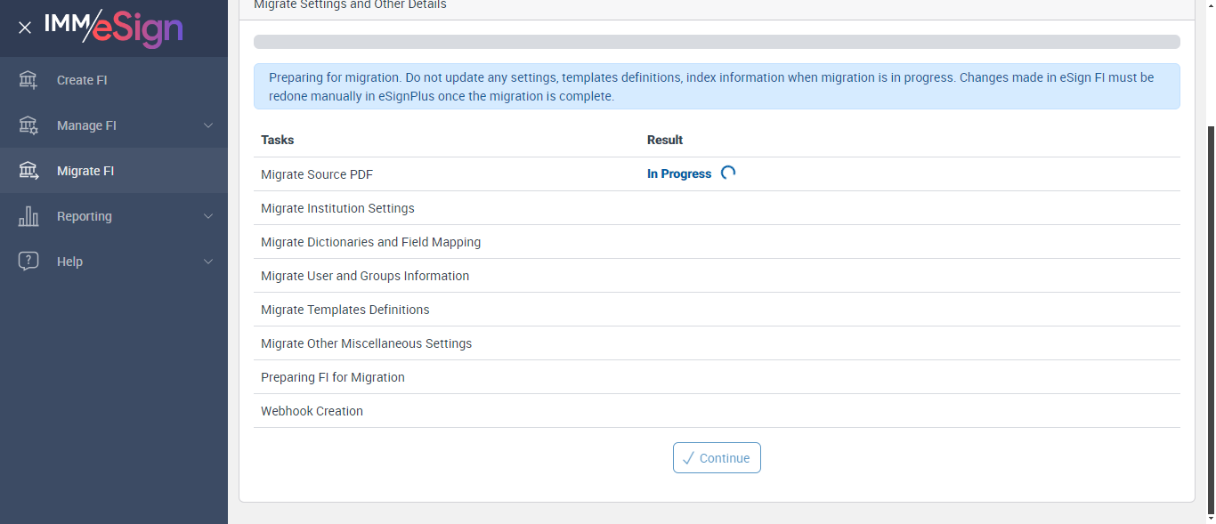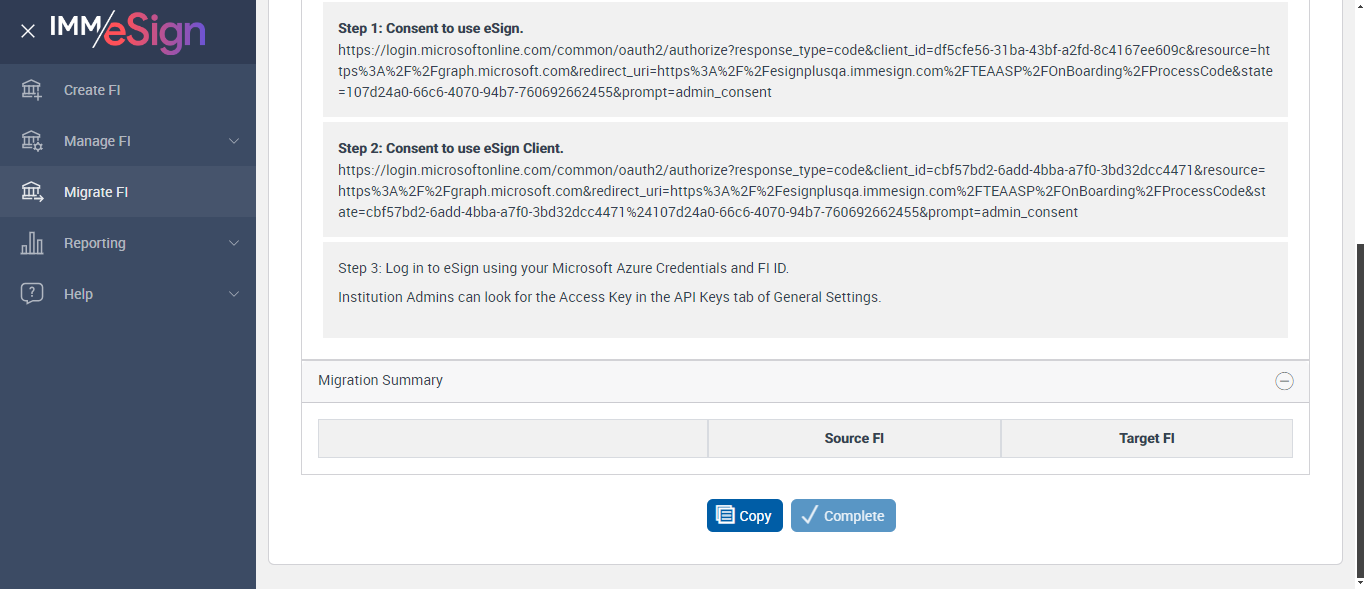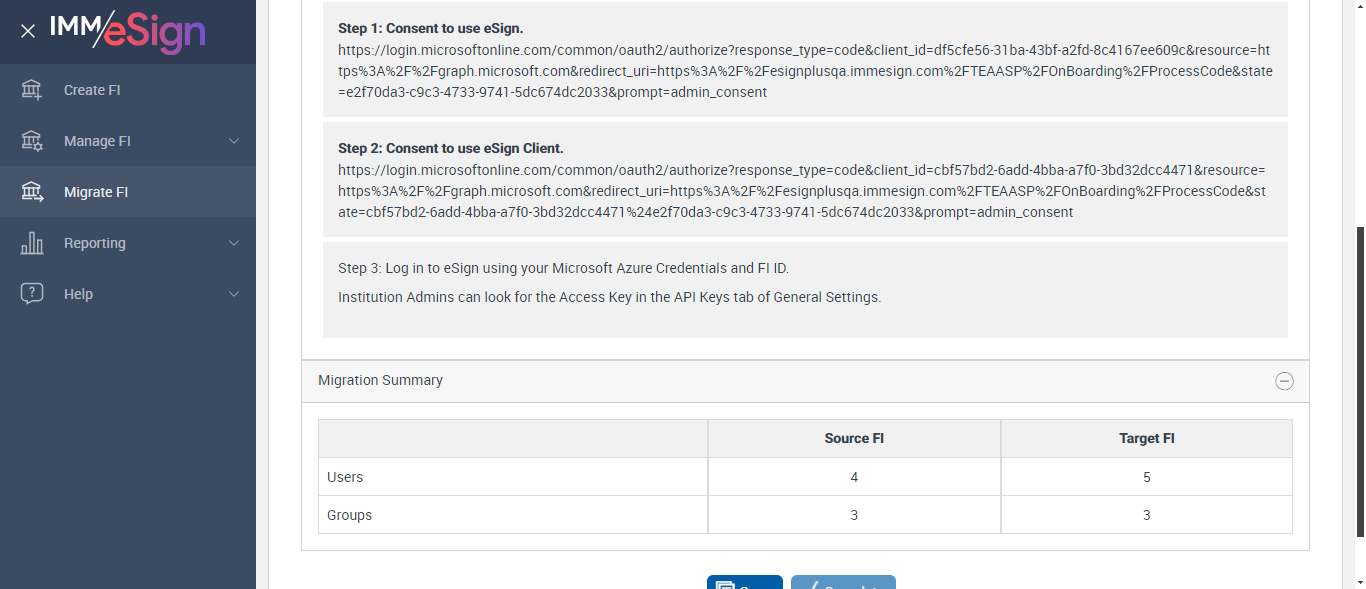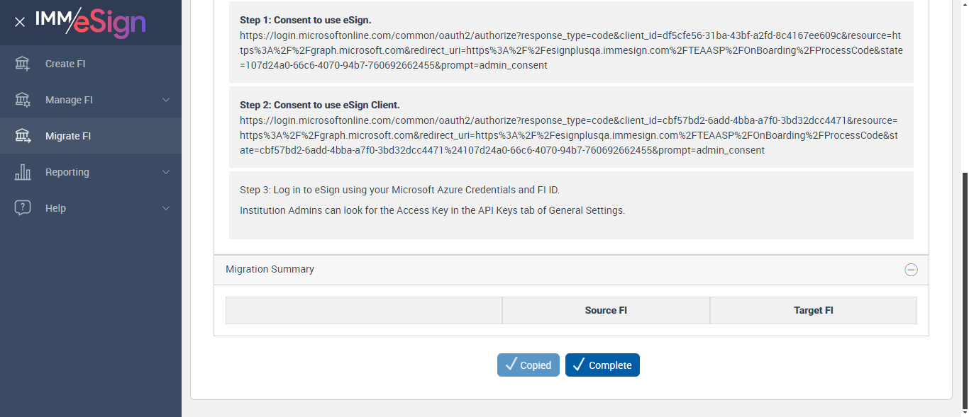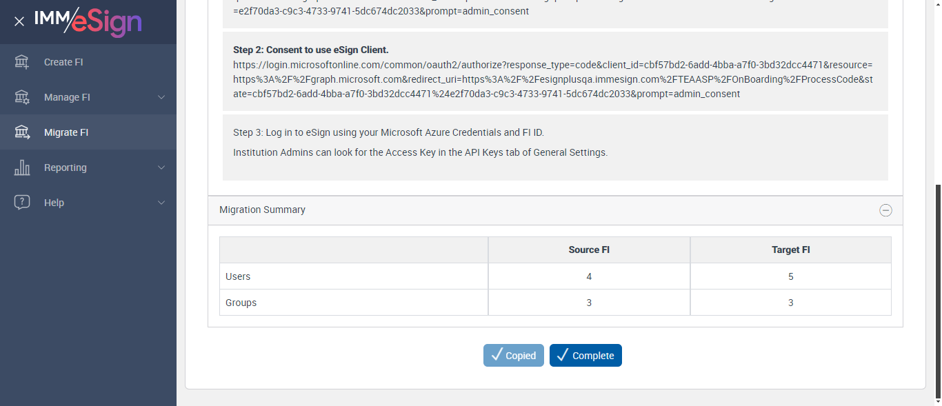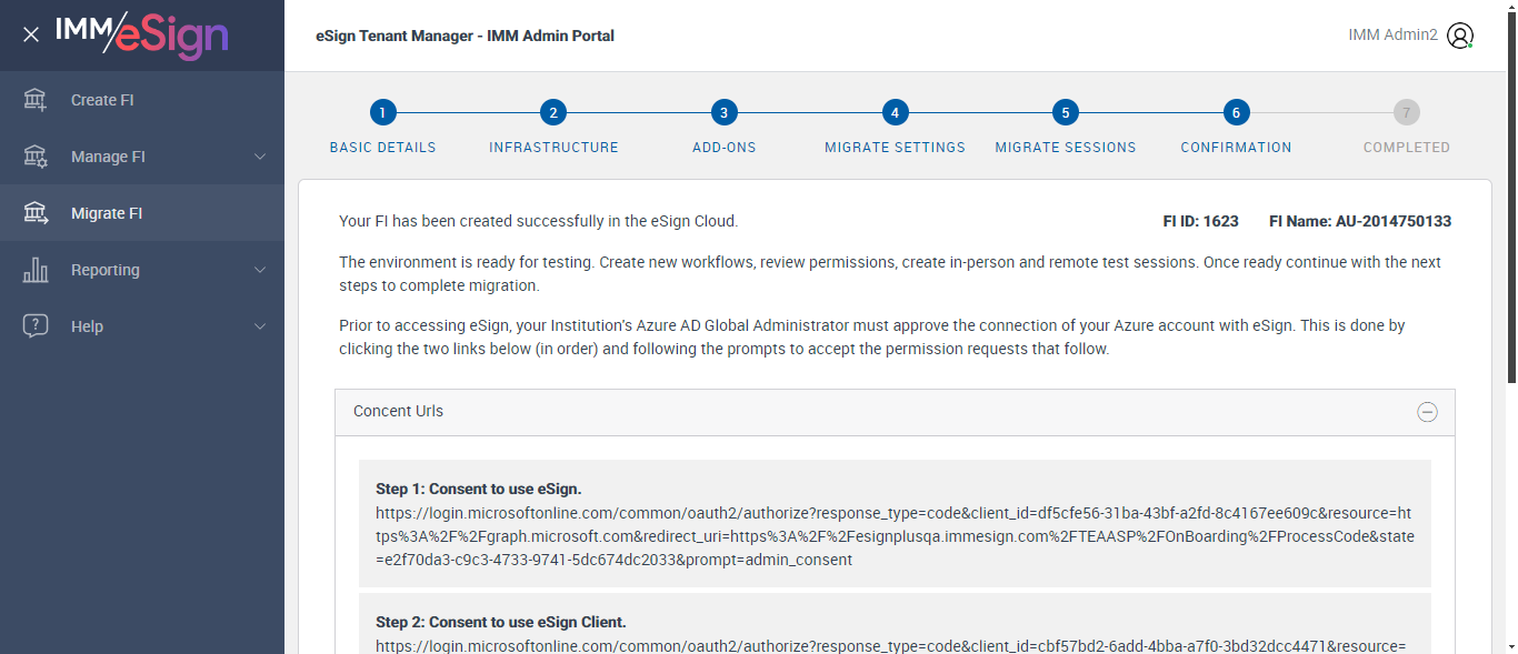 Loading... [ScreenShot] Successfully Configured 'Configuring the FI Template Defination' Successfully Configured 'Migrate Users and Groups Info' Successfully Configured 'Institution Settings' Successfully Configured 'Migrate Other Miscellaneous Settings' Successfully Configured 'Dictionaries and Field Mapping' Successfully Configured 'Preparing FI for Migration' Successfully Configured 'Webhook Creation' Retry Button is not showing --- 07 May 15:12:27 212 - Element is displayed:: [[RemoteWebDriver: chrome on Windows 10 (e9aed4723a6ef45f8df3454c6cec2f69)] -> id: btnCompleteInfra] --- 07 May 15:12:34 341 - Element is displayed:: [[RemoteWebDriver: chrome on Windows 10 (e9aed4723a6ef45f8df3454c6cec2f69)] -> id: btnCompleteInfra] --- 07 May 15:12:34 403 - Element is displayed:: [[RemoteWebDriver: chrome on Windows 10 (e9aed4723a6ef45f8df3454c6cec2f69)] -> id: btnCompleteInfra] --- 07 May 15:12:34 515 - Page URL:: https://esignnonprod.immesign.com/qa/tenantmanager/#/fi/migrate/sessions/info --- 07 May 15:12:34 515 - 0 - Page Load Wait: (Sync) - com.imm.support.Utils.waitForPageLoad(Utils.java:136) --- 07 May 15:12:34 568 - Element is displayed:: [[RemoteWebDriver: chrome on Windows 10 (e9aed4723a6ef45f8df3454c6cec2f69)] -> xpath: //*[contains(text(),'Preparing for Session Migration')]] --- 07 May 15:12:34 643 - Page URL:: https://esignnonprod.immesign.com/qa/tenantmanager/#/fi/migrate/sessions/info --- 07 May 15:12:34 643 - 0 - Page Load Wait: (Sync) - com.imm.support.Utils.waitForPageLoad(Utils.java:136) --- 07 May 15:12:34 718 - Element is displayed:: [[RemoteWebDriver: chrome on Windows 10 (e9aed4723a6ef45f8df3454c6cec2f69)] -> css selector: .header] Clicked on Next Button ...........Migrate Fi - Migrate Sessions Page............. Successfully navigated to the 'migrateSessionsPage' page [ScreenShot] sessionHeading Preparing for Session Migration Successfully validated Session Heading [ScreenShot] twophaseText [In Phase 1, the following information will be migrated from the eSign FI to the eSignPlus FI:, In Phase 2, the migration will be finalized. The following information will be migrated:] Successfully validated twoPhasetext [ScreenShot] Successfully validated twoPhasetext [ScreenShot] twoPhaseHeading Migration is a two-phase process. Successfully validated TwoPhase Heading [ScreenShot] sessonMigrateText [Active in-person and remote sessions, Completed sessions, Basic settings, Template definitions and PDFs, Users and groups, Create in-person and remote test sessions, Create new workflows, View migrated users, groups and settings, Session data, Image index settings, Document push settings, Status API settings, Expired, deleted and remote transactions with expired or aborted statuses, lightsOut transactions with error statuses] Successfully validated sessionMgText [ScreenShot] Successfully validated sessionMgText [ScreenShot] noteText [After consenting to use eSign, users will be able to perform these test functions:, NOTE: Users will NOT be able to send transactions to an imaging system or receive push notifications in Phase 1, NOTE: These transaction types will NOT be migrated from the eSign FI to the new eSignPlus FI] Successfully validated Notes [ScreenShot] Successfully validated Notes [ScreenShot] --- 07 May 15:12:39 304 - Element is displayed:: [[RemoteWebDriver: chrome on Windows 10 (e9aed4723a6ef45f8df3454c6cec2f69)] -> id: btnNext] Clicked on Next Button Continue button is disabled Successfully Configured 'Sessions PDF' Successfully Configured 'Migrate Active Sessions' Successfully Configured 'Migrate Remote Sessions' Successfully Configured 'Migrate Completed Sessions' Successfully Configured 'Migrate User Login History' Successfully Configured 'Migration Audit' Successfully Configured 'Preparing Migration Data' Successfully Configured 'Associating Active Session Workflow' Successfully Configured 'Associating Remote Session Workflow' Successfully Configured 'Associating Completed Session Workflow' Retry Button is not showing --- 07 May 15:15:59 827 - Element is displayed:: [[RemoteWebDriver: chrome on Windows 10 (e9aed4723a6ef45f8df3454c6cec2f69)] -> id: btnCompleteInfra] --- 07 May 15:16:06 927 - Element is displayed:: [[RemoteWebDriver: chrome on Windows 10 (e9aed4723a6ef45f8df3454c6cec2f69)] -> id: btnCompleteInfra] --- 07 May 15:16:06 993 - Element is displayed:: [[RemoteWebDriver: chrome on Windows 10 (e9aed4723a6ef45f8df3454c6cec2f69)] -> id: btnCompleteInfra] --- 07 May 15:16:07 134 - Page URL:: https://esignnonprod.immesign.com/qa/tenantmanager/#/fi/migrate/confirmation --- 07 May 15:16:07 134 - 0 - Page Load Wait: (Sync) - com.imm.support.Utils.waitForPageLoad(Utils.java:136) --- 07 May 15:16:07 194 - Element is displayed:: [[RemoteWebDriver: chrome on Windows 10 (e9aed4723a6ef45f8df3454c6cec2f69)] -> id: consentUrl] --- 07 May 15:16:07 290 - Page URL:: https://esignnonprod.immesign.com/qa/tenantmanager/#/fi/migrate/confirmation --- 07 May 15:16:07 290 - 0 - Page Load Wait: (Sync) - com.imm.support.Utils.waitForPageLoad(Utils.java:136) --- 07 May 15:16:07 387 - Element is displayed:: [[RemoteWebDriver: chrome on Windows 10 (e9aed4723a6ef45f8df3454c6cec2f69)] -> css selector: .header] Clicked on Next Button Successfully navigated to the 'confirmationPg' page [ScreenShot] ..............Migrate Fi - Confirmation Page................ --- 07 May 15:16:07 591 - Element is displayed:: [[RemoteWebDriver: chrome on Windows 10 (e9aed4723a6ef45f8df3454c6cec2f69)] -> id: consentUrl] --- 07 May 15:16:07 674 - Page URL:: https://esignnonprod.immesign.com/qa/tenantmanager/#/fi/migrate/confirmation --- 07 May 15:16:07 674 - 0 - Page Load Wait: (Sync) - com.imm.support.Utils.waitForPageLoad(Utils.java:136) --- 07 May 15:16:07 723 - Element is displayed:: [[RemoteWebDriver: chrome on Windows 10 (e9aed4723a6ef45f8df3454c6cec2f69)] -> id: consentUrl] eSign URL is displayed [ScreenShot] --- 07 May 15:16:07 947 - Page URL:: https://esignnonprod.immesign.com/qa/tenantmanager/#/fi/migrate/con