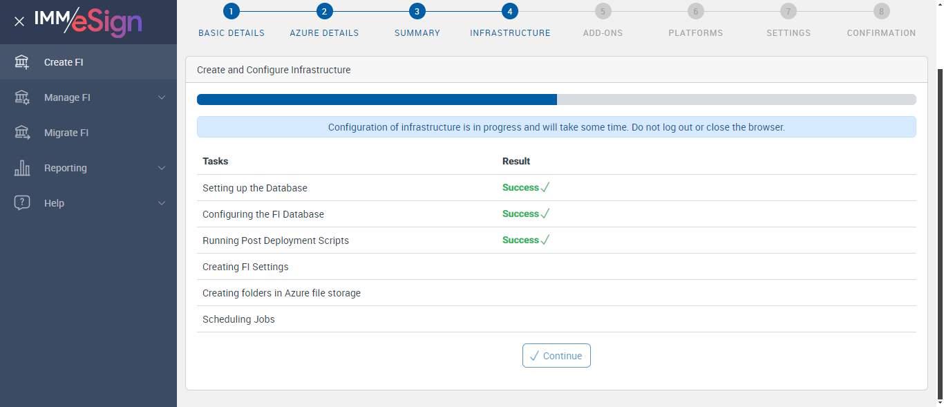 The logo should be a PNG file and less than 100 KB., This is meant for saving extra notes about the Financial Institution., Financial Institution's address., , , Financial Institution's City., Financial Institution's State., ] * * FI ID * : equals FI ID * : Name * : equals Name * : Logo : equals Logo : Notes : equals Notes : Address 1 : equals Address 1 : Address 2 : equals Address 2 : Address 3 : equals Address 3 : City : equals City : State : equals State : ZIP : equals ZIP : Country : equals Country : Successfully validated Basic Details labels [ScreenShot] --- 07 May 15:04:35 994 - Element is displayed:: [[RemoteWebDriver: chrome on Windows 10 (e9aed4723a6ef45f8df3454c6cec2f69)] -> id: btnNext] --- 07 May 15:04:38 313 - Page URL:: https://esignnonprod.immesign.com/qa/tenantmanager/#/fi/migrate/basic --- 07 May 15:04:38 314 - 0 - Page Load Wait: (Sync) - com.imm.support.Utils.waitForPageLoad(Utils.java:136) --- 07 May 15:04:38 393 - Page URL:: https://esignnonprod.immesign.com/qa/tenantmanager/#/fi/migrate/basic --- 07 May 15:04:38 394 - 0 - Page Load Wait: (Sync) - com.imm.support.Utils.waitForPageLoad(Utils.java:136) --- 07 May 15:04:40 481 - Element is displayed:: [[RemoteWebDriver: chrome on Windows 10 (e9aed4723a6ef45f8df3454c6cec2f69)] -> xpath: //*[contains(text(),'Configure Infrastructure')]] --- 07 May 15:04:40 535 - Page URL:: https://esignnonprod.immesign.com/qa/tenantmanager/#/fi/migrate/infrastructure --- 07 May 15:04:40 535 - 0 - Page Load Wait: (Sync) - com.imm.support.Utils.waitForPageLoad(Utils.java:136) --- 07 May 15:04:40 607 - Element is displayed:: [[RemoteWebDriver: chrome on Windows 10 (e9aed4723a6ef45f8df3454c6cec2f69)] -> css selector: .header] ...........Migrate Fi - infrastructure Page............. Successfully navigated to the 'InfrastructurePage' page [ScreenShot] --- 07 May 15:04:40 824 - Element is displayed:: [[RemoteWebDriver: chrome on Windows 10 (e9aed4723a6ef45f8df3454c6cec2f69)] -> id: infraMessage] Verified Configuration message Continue button is disabled Found Result for Setting up the Database - Success [ScreenShot] Successfully Configured 'Setting up the Databse' FoundResult for Configuring the FI Database -Success [ScreenShot] Successfully Configured 'Configuring the FI Database' Found Result for Running Post Deployment ScriptsSuccess [ScreenShot] Successfully Configured 'Running Post Deployment Scripts' Found Result for Creating FI SettingsSuccess [ScreenShot] Successfully Configured 'Creating FI Settings' Found Result fotr Creating folders in Azure file storageSuccess [ScreenShot] Successfully Configured 'Creating folders in Azure file storage' Found Result for Scheduling JobsSuccess [ScreenShot] Successfully Configured 'Scheduling Jobs' Retry Button is not showing --- 07 May 15:08:25 259 - Element is displayed:: [[RemoteWebDriver: chrome on Windows 10 (e9aed4723a6ef45f8df3454c6cec2f69)] -> id: btnCompleteInfra] --- 07 May 15:08:32 393 - Element is displayed:: [[RemoteWebDriver: chrome on Windows 10 (e9aed4723a6ef45f8df3454c6cec2f69)] -> id: btnCompleteInfra] --- 07 May 15:08:32 457 - Element is displayed:: [[RemoteWebDriver: chrome on Windows 10 (e9aed4723a6ef45f8df3454c6cec2f69)] -> id: btnCompleteInfra] --- 07 May 15:08:32 644 - Page URL:: https://esignnonprod.immesign.com/qa/tenantmanager/#/fi/migrate/addons --- 07 May 15:08:32 644 - 0 - Page Load Wait: (Sync) - com.imm.support.Utils.waitForPageLoad(Utils.java:136) --- 07 May 15:08:32 708 - Element is displayed:: [[RemoteWebDriver: chrome on Windows 10 (e9aed4723a6ef45f8df3454c6cec2f69)] -> id: step_title] --- 07 May 15:08:32 792 - Page URL:: https://esignnonprod.immesign.com/qa/tenantmanager/#/fi/migrate/addons --- 07 May 15:08:32 793 - 0 - Page Load Wait: (Sync) - com.imm.support.Utils.waitForPageLoad(Utils.java:136) --- 07 May 15:08:32 865 - Element is displayed:: [[RemoteWebDriver: chrome on Windows 10 (e9aed4723a6ef45f8df3454c6cec2f69)] -> css selector: .header] Clicked 'Next' button .......Add-Ons Page.......... --- 07 May 15:08:32 966 - Page URL:: https://esignnonprod.immesign.com/qa/tenantmanager/#/fi/migrate/addons --- 07 May 15:08:32 966 - 0 - Page Load Wait: (Sync) - com.imm.support.Utils.waitForPageLoad(Utils.java:136) --- 07 May 15:08:33 010 - Element is displayed:: [[RemoteWebDriver: chrome on Windows 10 (e9aed4723a6ef45f8df3454c6cec2f69)] -> id: step_title] --- 07 May 15:08:33 096 - Page URL:: https://esignnonprod.immesign.com/qa/tenantmanager/#/fi/migrate/addons --- 07 May 15:08:33 096 - 0 - Page Load Wait: (Sync) - com.imm.support.Utils.waitForPageLoad(Utils.java:136) --- 07 May 15:08:33 160 - Element is displayed:: [[RemoteWebDriver: chrome on Windows 10 (e9aed4723a6ef45f8df3454c6cec2f69)] -> css selector: .header] ...........Migrate Fi - Addons Page............. Successfully navigated to the 'Add-Ons Page' page [ScreenShot] No of radio buttons 0 a958c406-5127-4d2e-9d24-d441b447fa6a --- 07 May 15:08:43 959 - Element is displayed:: [[RemoteWebDriver: chrome on Windows 10 (e9aed4723a6ef45f8df3454c6cec2f69)] -> id: keyEsp] esignplus key field is displayed --- 07 May 15:08:44 004 - Element is displayed:: [[RemoteWebDriver: chrome on Windows 10 (e9aed4723a6ef45f8df3454c6cec2f69)] -> id: keyEsp] --- 07 May 15:09:02 798 - Unable to find an element after 0 sec ==> Proxy element for: AjaxElementLocator 'By.xpath: //*[@id='errorEspKeyValid']/small' --- 07 May 15:09:10 982 - Element is displayed:: [[RemoteWebDriver: chrome on Windows 10 (e9aed4723a6ef45f8df3454c6cec2f69)] -> id: btnNext] --- 07 May 15:09:13 072 - Element is displayed:: [[RemoteWebDriver: chrome on Windows 10 (e9aed4723a6ef45f8df3454c6cec2f69)] -> id: btnNext] Clicked on Next Button --- 07 May 15:09:13 338 - Page URL:: https://esignnonprod.immesign.com/qa/tenantmanager/#/fi/migrate/addons --- 07 May 15:09:13 338 - 0 - Page Load Wait: (Sync) - com.imm.support.Utils.waitForPageLoad(Utils.java:136) --- 07 May 15:09:14 536 - Element is displayed:: [[RemoteWebDriver: chrome on Windows 10 (e9aed4723a6ef45f8df3454c6cec2f