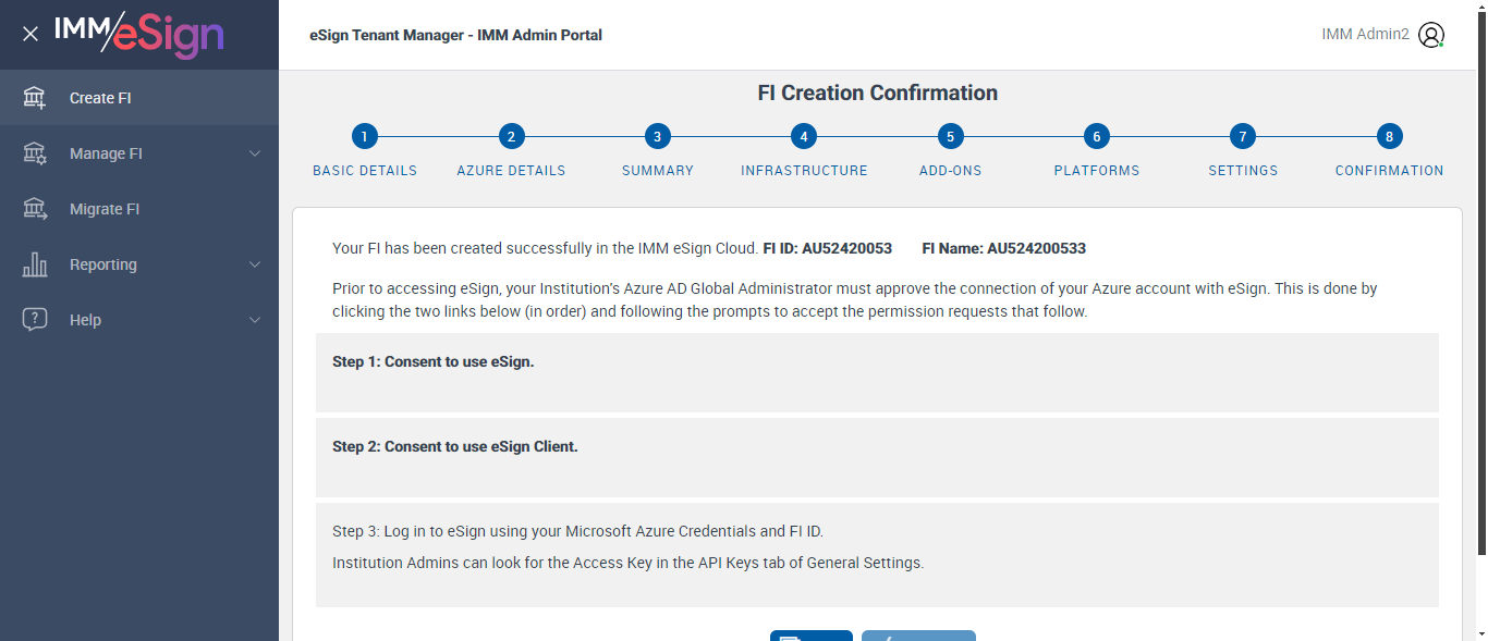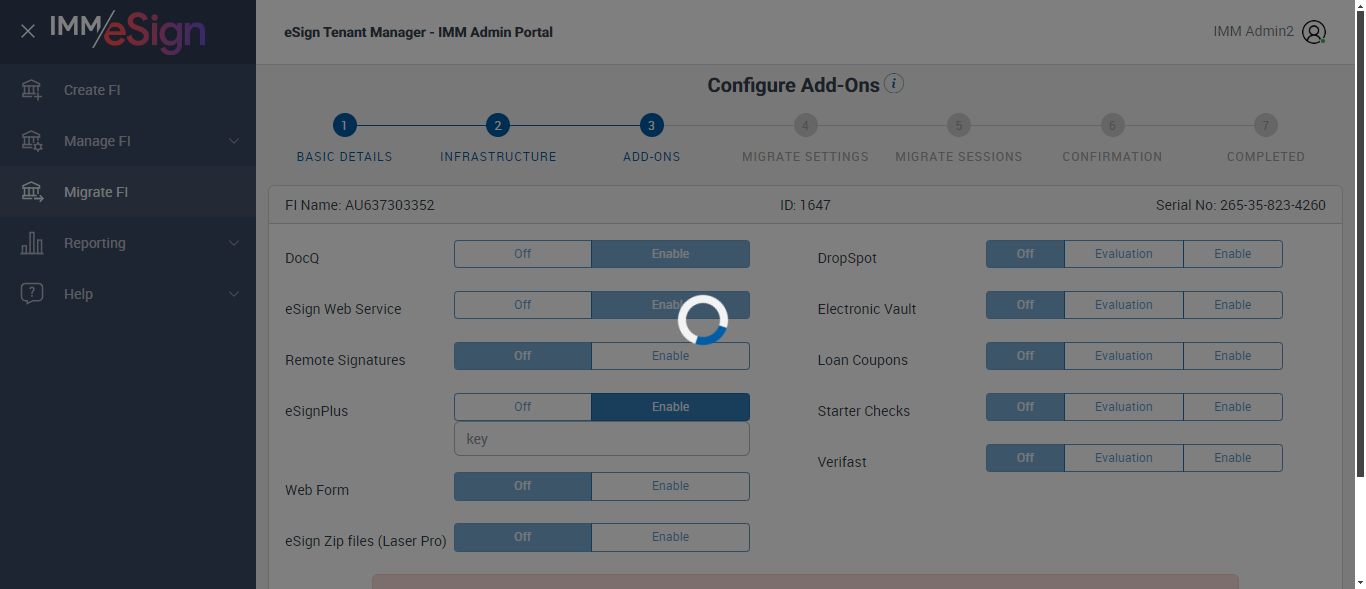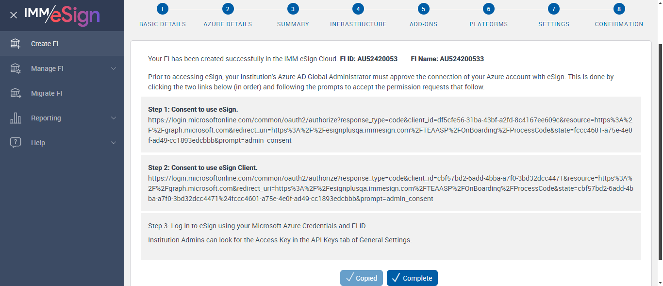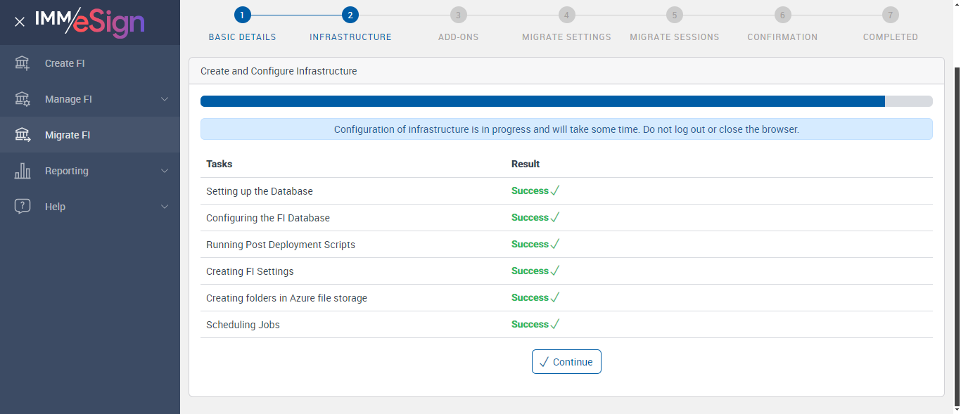 The logo should be a PNG file and less than 100 KB., , Financial Institution's address., Financial Institution's address (contd.), Financial Institution's address (contd.), , Financial Institution's State., ] * * FI ID * : equals FI ID * : Name * : equals Name * : Logo : equals Logo : Notes : equals Notes : Address 1 : equals Address 1 : Address 2 : equals Address 2 : Address 3 : equals Address 3 : City : equals City : State : equals State : ZIP : equals ZIP : Country : equals Country : Successfully validated Basic Details labels [ScreenShot] ...........Migration - Infrastructure Page.............. --- 07 May 20:15:21 713 - Element is displayed:: [[RemoteWebDriver: chrome on Windows 10 (9ca8a7fcc0471b9a7edb66bd05f171db)] -> id: btnNext] --- 07 May 20:15:24 003 - Page URL:: https://esignnonprod.immesign.com/qa/tenantmanager/#/fi/migrate/basic --- 07 May 20:15:24 003 - 0 - Page Load Wait: (Sync) - com.imm.support.Utils.waitForPageLoad(Utils.java:136) --- 07 May 20:15:24 083 - Page URL:: https://esignnonprod.immesign.com/qa/tenantmanager/#/fi/migrate/basic --- 07 May 20:15:24 083 - 0 - Page Load Wait: (Sync) - com.imm.support.Utils.waitForPageLoad(Utils.java:136) --- 07 May 20:15:25 589 - Element is displayed:: [[RemoteWebDriver: chrome on Windows 10 (9ca8a7fcc0471b9a7edb66bd05f171db)] -> xpath: //*[contains(text(),'Configure Infrastructure')]] --- 07 May 20:15:25 649 - Page URL:: https://esignnonprod.immesign.com/qa/tenantmanager/#/fi/migrate/infrastructure --- 07 May 20:15:25 649 - 0 - Page Load Wait: (Sync) - com.imm.support.Utils.waitForPageLoad(Utils.java:136) --- 07 May 20:15:25 718 - Element is displayed:: [[RemoteWebDriver: chrome on Windows 10 (9ca8a7fcc0471b9a7edb66bd05f171db)] -> css selector: .header] Successfully navigated to the 'InfrastructurePage' page [ScreenShot] --- 07 May 20:15:25 940 - Element is displayed:: [[RemoteWebDriver: chrome on Windows 10 (9ca8a7fcc0471b9a7edb66bd05f171db)] -> id: infraMessage] Verified Configuration message Continue button is disabled Found Result for Setting up the Database - Success [ScreenShot] Successfully Configured 'Setting up the Databse' FoundResult for Configuring the FI Database -Success [ScreenShot] Successfully Configured 'Configuring the FI Database' Found Result for Running Post Deployment ScriptsSuccess [ScreenShot] Successfully Configured 'Running Post Deployment Scripts' Found Result for Creating FI SettingsSuccess [ScreenShot] Successfully Configured 'Creating FI Settings' Found Result fotr Creating folders in Azure file storageSuccess [ScreenShot] Successfully Configured 'Creating folders in Azure file storage' Found Result for Scheduling JobsSuccess [ScreenShot] Successfully Configured 'Scheduling Jobs' Retry Button is not showing --- 07 May 20:19:10 212 - Element is displayed:: [[RemoteWebDriver: chrome on Windows 10 (9ca8a7fcc0471b9a7edb66bd05f171db)] -> id: btnCompleteInfra] --- 07 May 20:19:17 376 - Element is displayed:: [[RemoteWebDriver: chrome on Windows 10 (9ca8a7fcc0471b9a7edb66bd05f171db)] -> id: btnCompleteInfra] --- 07 May 20:19:17 440 - Element is displayed:: [[RemoteWebDriver: chrome on Windows 10 (9ca8a7fcc0471b9a7edb66bd05f171db)] -> id: btnCompleteInfra] --- 07 May 20:19:17 600 - Page URL:: https://esignnonprod.immesign.com/qa/tenantmanager/#/fi/migrate/addons --- 07 May 20:19:17 600 - 0 - Page Load Wait: (Sync) - com.imm.support.Utils.waitForPageLoad(Utils.java:136) --- 07 May 20:19:17 655 - Element is displayed:: [[RemoteWebDriver: chrome on Windows 10 (9ca8a7fcc0471b9a7edb66bd05f171db)] -> id: step_title] --- 07 May 20:19:17 740 - Page URL:: https://esignnonprod.immesign.com/qa/tenantmanager/#/fi/migrate/addons --- 07 May 20:19:17 740 - 0 - Page Load Wait: (Sync) - com.imm.support.Utils.waitForPageLoad(Utils.java:136) --- 07 May 20:19:17 810 - Element is displayed:: [[RemoteWebDriver: chrome on Windows 10 (9ca8a7fcc0471b9a7edb66bd05f171db)] -> css selector: .header] Clicked 'Next' button .......Migration - Add-Ons Page.......... --- 07 May 20:19:17 895 - Page URL:: https://esignnonprod.immesign.com/qa/tenantmanager/#/fi/migrate/addons --- 07 May 20:19:17 895 - 0 - Page Load Wait: (Sync) - com.imm.support.Utils.waitForPageLoad(Utils.java:136) --- 07 May 20:19:17 943 - Element is displayed:: [[RemoteWebDriver: chrome on Windows 10 (9ca8a7fcc0471b9a7edb66bd05f171db)] -> id: step_title] --- 07 May 20:19:18 019 - Page URL:: https://esignnonprod.immesign.com/qa/tenantmanager/#/fi/migrate/addons --- 07 May 20:19:18 019 - 0 - Page Load Wait: (Sync) - com.imm.support.Utils.waitForPageLoad(Utils.java:136) --- 07 May 20:19:18 084 - Element is displayed:: [[RemoteWebDriver: chrome on Windows 10 (9ca8a7fcc0471b9a7edb66bd05f171db)] -> css selector: .header] Successfully navigated to the 'Add-Ons Page' page [ScreenShot] --- 07 May 20:19:18 297 - Page URL:: https://esignnonprod.immesign.com/qa/tenantmanager/#/fi/migrate/addons --- 07 May 20:19:18 297 - 0 - Page Load Wait: (Sync) - com.imm.support.Utils.waitForPageLoad(Utils.java:136) --- 07 May 20:19:20 627 - Page URL:: https://esignnonprod.immesign.com/qa/tenantmanager/#/fi/migrate --- 07 May 20:19:20 628 - 0 - Page Load Wait: (Sync) - com.imm.support.Utils.waitForPageLoad(Utils.java:136) --- 07 May 20:19:24 063 - Page URL:: https://esignnonprod.immesign.com/qa/tenantmanager/#/fi/migrate --- 07 May 20:19:24 063 - 0 - Page Load Wait: (Sync) - com.imm.support.Utils.waitForPageLoad(Utils.java:136) --- 07 May 20:19:24 109 - Element is displayed:: [[RemoteWebDriver: chrome on Windows 10 (9ca8a7fcc0471b9a7edb66bd05f171db)] -> id: createdFIList] --- 07 May 20:19:24 158 - Element is displayed:: [[RemoteWebDriver: chrome on Windows 10 (9ca8a7fcc0471b9a7edb66bd05f171db)] -> id: btnMigrateFI] Migrate FI Page open up [ScreenShot] --- 07 May 20:19:24 671 - Page URL:: https://esignnonprod.immesign.com/qa/tenantmanager/#/fi/migrate --- 07 May 20:19:24 671 - 0 - Page Load Wait: (Sync) - com.imm.support.Utils.waitForPageLoad(Utils.java:136) --- 07 May 20:19:24 739 - Element is display