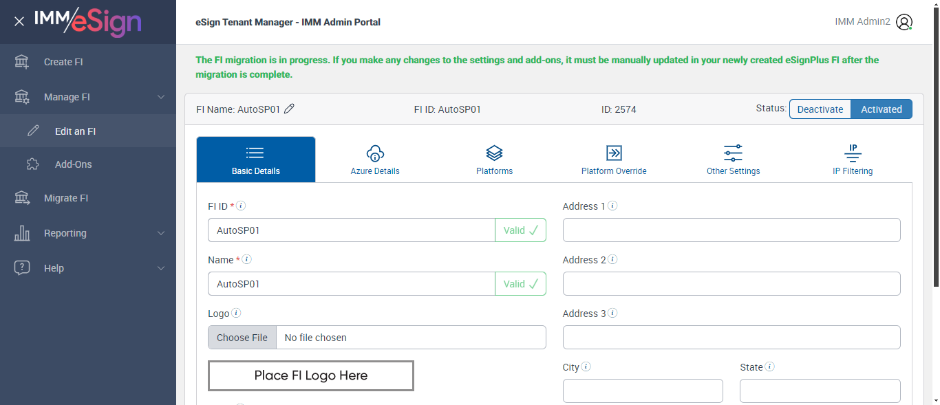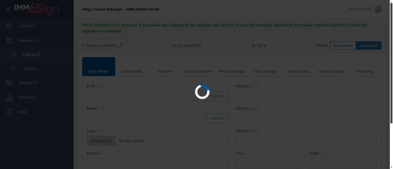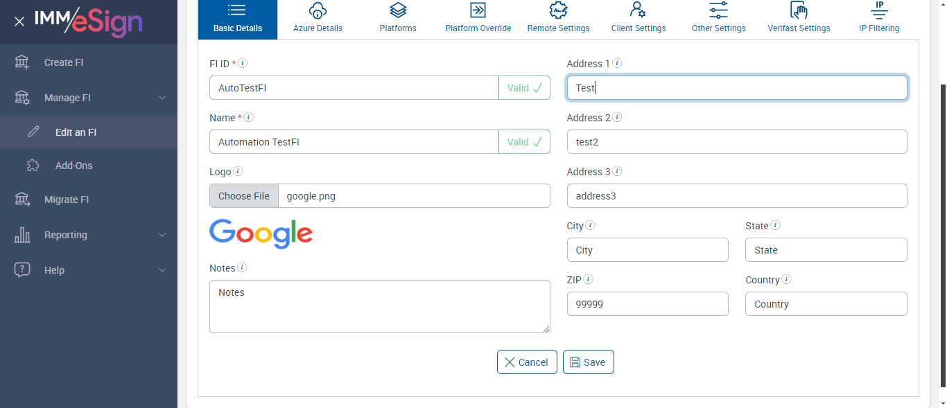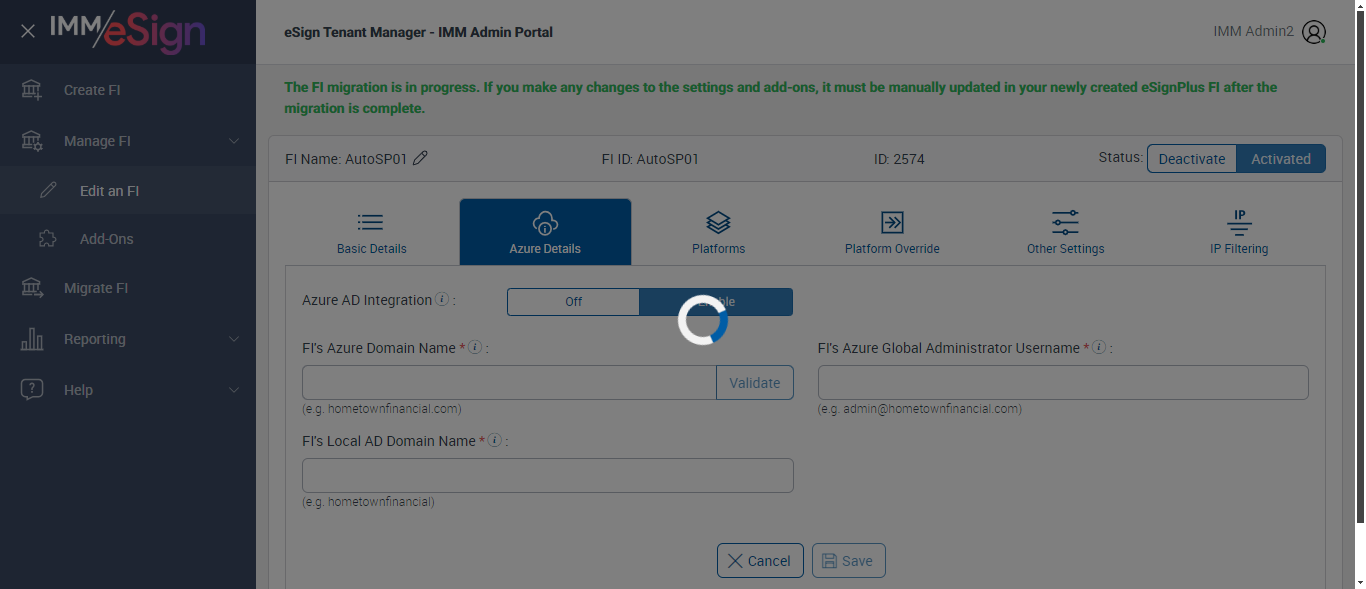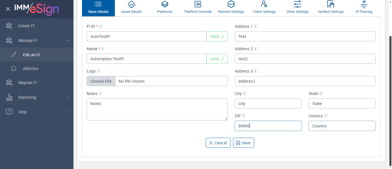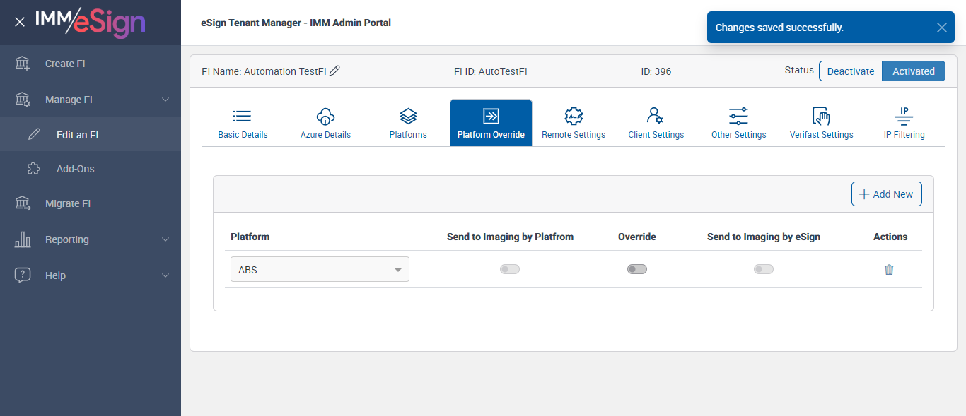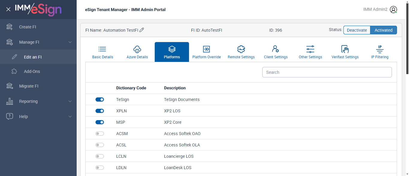 ({ZIP=0756, Description=Verify PlatForm Override Disable, Login_User_ID=immadmin2@immesignqa.onmicrosoft.com, Platform=American, ShortName=Student, Filepath=src/main/resources/testdata/files/Students Loan.pdf, Name=AUTest, LocalDomain=, TestID=verifyPlatFormOverrideDisbale, Dictionary Code=TeSign,XPLN,MSP,ACSM,ACSL,LCLN,LDLN,SENR,UMEM,ULEN,ACLN,ACME,OSISSM,CRME,CRLN,SYLN,SYMS,SLEN,NSME, createdFIStatus=Draft, Notes=Test, Session URL=https://esignnonprod.immesign.com/qa/tenantmanager/, GlobalAdmin=, eSign URL=https://esignplusqa.immesign.com/teaasp/login.aspx, New Column=, TypeOfUser=HostAdmin, ErrorMsg=FI Id already exists,Host System FI ID is required.,Must be up to 10 characters with no spaces.,Name is required,Zip code must be in 99999 or 99999-9999 format,Do you want to discard the changes?,Changes saved successfully., Address2=building 1, AZDomain=, Address3=123, FI_ID=AutoTestFI, Address1=2 City hall Plaza, City=Rahway, Dictionary Description=TeSign Documents,XP2 LOS,XP2 Core,Access Softek OAO,Access Softek OLA,Loancierge LOS,LoanDesk LOS,Dictionary for SymApp Membership Dictionary,DataSafe Core,DataSafe LOS,MeridianLink LOS,MeridianLink AOS,DNA Core,KeyStone Core,KeyStone LOS,Symitar LOS,Symitar Core,Spectrum LOS,Spectrum Core, Logo=, NameDescription=Student, WrongAZDomain=, Tab=Basic Details,Azure Details,Platforms,Platform Override,Remote Settings,Client Settings,Other Settings,Verifast Settings,IP Filtering, State=NJ, Login_Password=iMM@2022, FullName=Student, Country=USA, Dictionaries To Be Select=TeSign,XPLN,MSP,ACSM,ACSL,LCLN,LDLN,SENR,UMEM,ULEN,ACLN, ButtonToClick=Cancel, FIID=espRTS,,Test Fi})