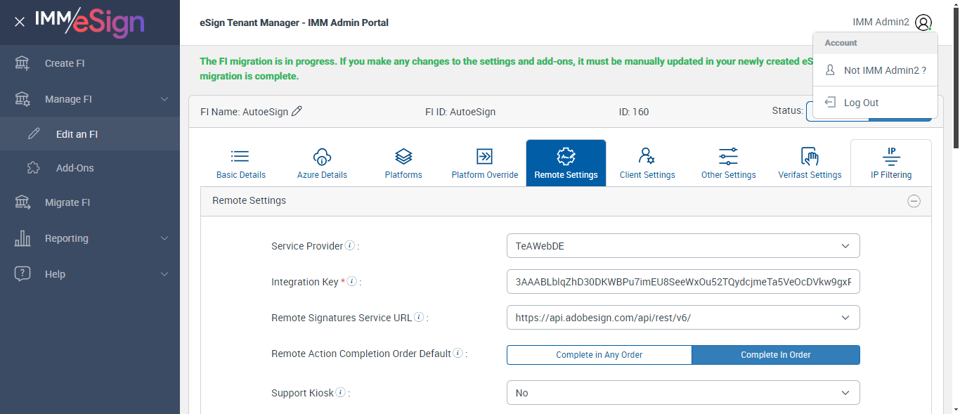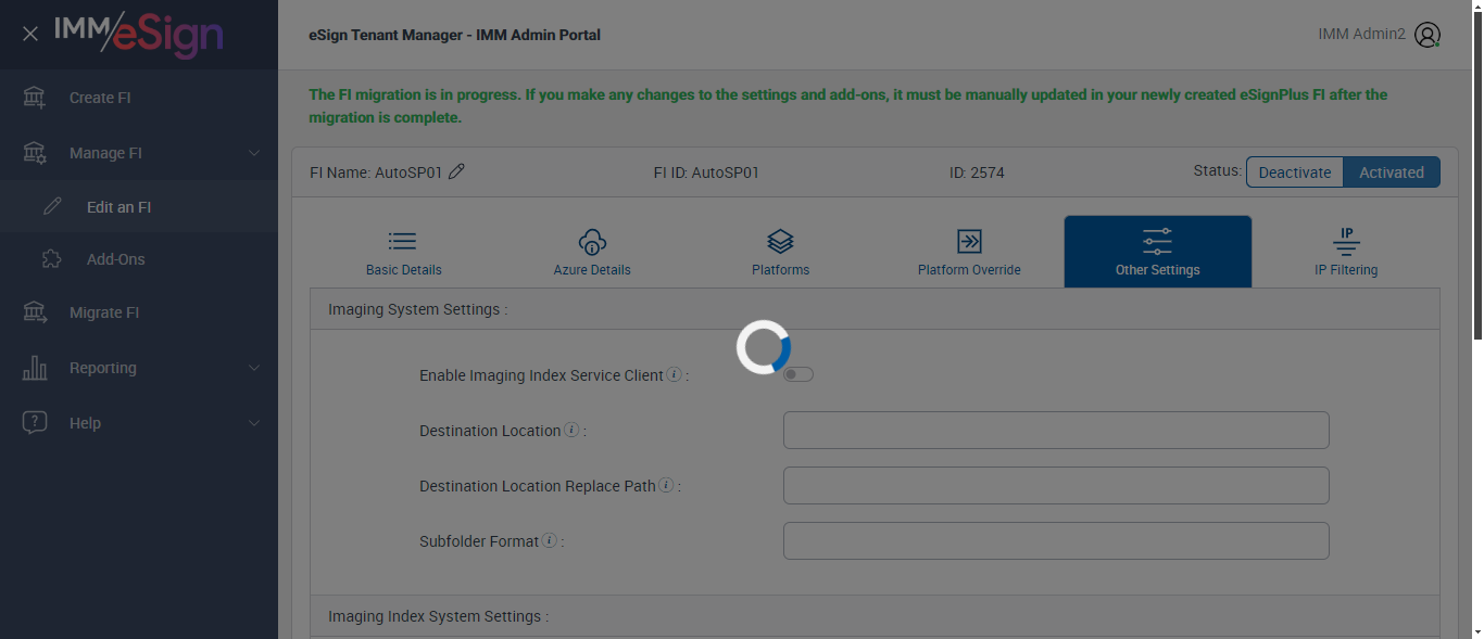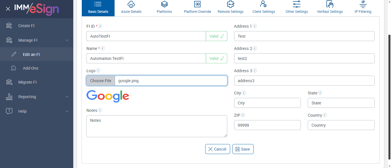 ({ZIP=0756, Description=Verify Other Settings Tab, Login_User_ID=immadmin2@immesignqa.onmicrosoft.com, Platform=, ShortName=, Filepath=src/main/resources/testdata/files/logo.jfif;src/main/resources/testdata/files/configuringfi/fingerprint01.pdf;src/main/resources/testdata/files/BarCode/IMM_CODE128Cover.pdf;src/main/resources/testdata/files/BarCode/IMM_PDF417Cover.pdf, Name=AUTest, LocalDomain=test, TestID=verifyOtherSettingsTabs, Dictionary Code=, createdFIStatus=, Notes=Test, Session URL=https://esignnonprod.immesign.com/qa/tenantmanager/, GlobalAdmin=, eSign URL=https://esignplusqa.immesign.com/teaasp/login.aspx, New Column=test;test@123;admintestfi.com;admin@yahoo.com, TypeOfUser=HostAdmin, ErrorMsg=Do you want to discard the changes?,Changes saved successfully., Address2=building 1, AZDomain=yahoo.com, Address3=123, FI_ID=AutoTestFI, Address1=2 City hall Plaza, City=Rahway, Dictionary Description=, Logo=, NameDescription=, WrongAZDomain=Test;hometown.com;yahoo.com, Tab=, State=NJ, Login_Password=iMM@2022, FullName=, Country=USA, Dictionaries To Be Select=, ButtonToClick=, FIID=espxml;Test Fi;Fi&2;ABCDCompany})