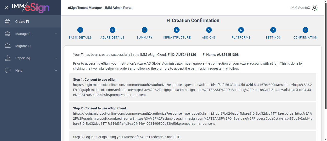Successfully Configured 'Creating FI Settings' |
