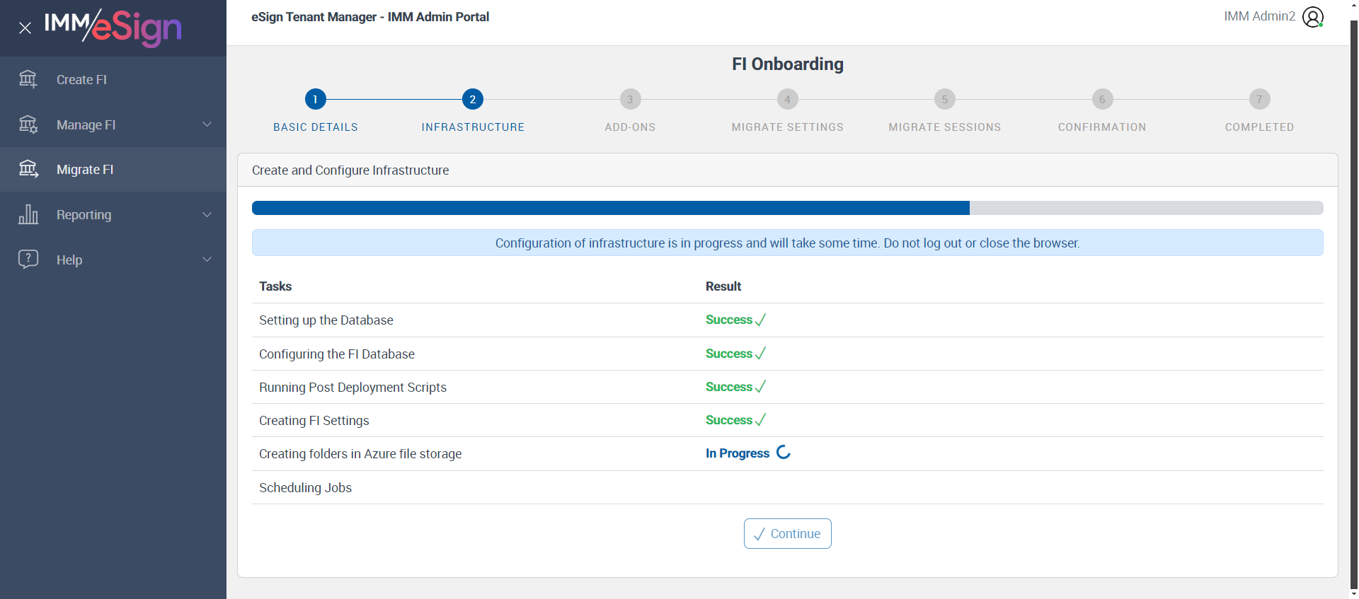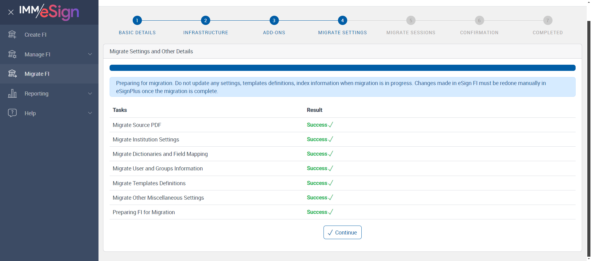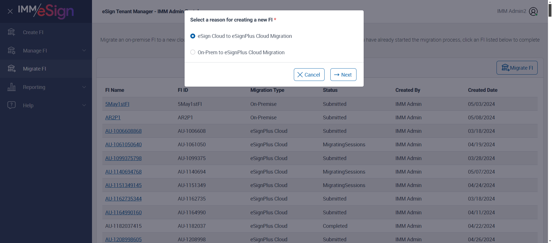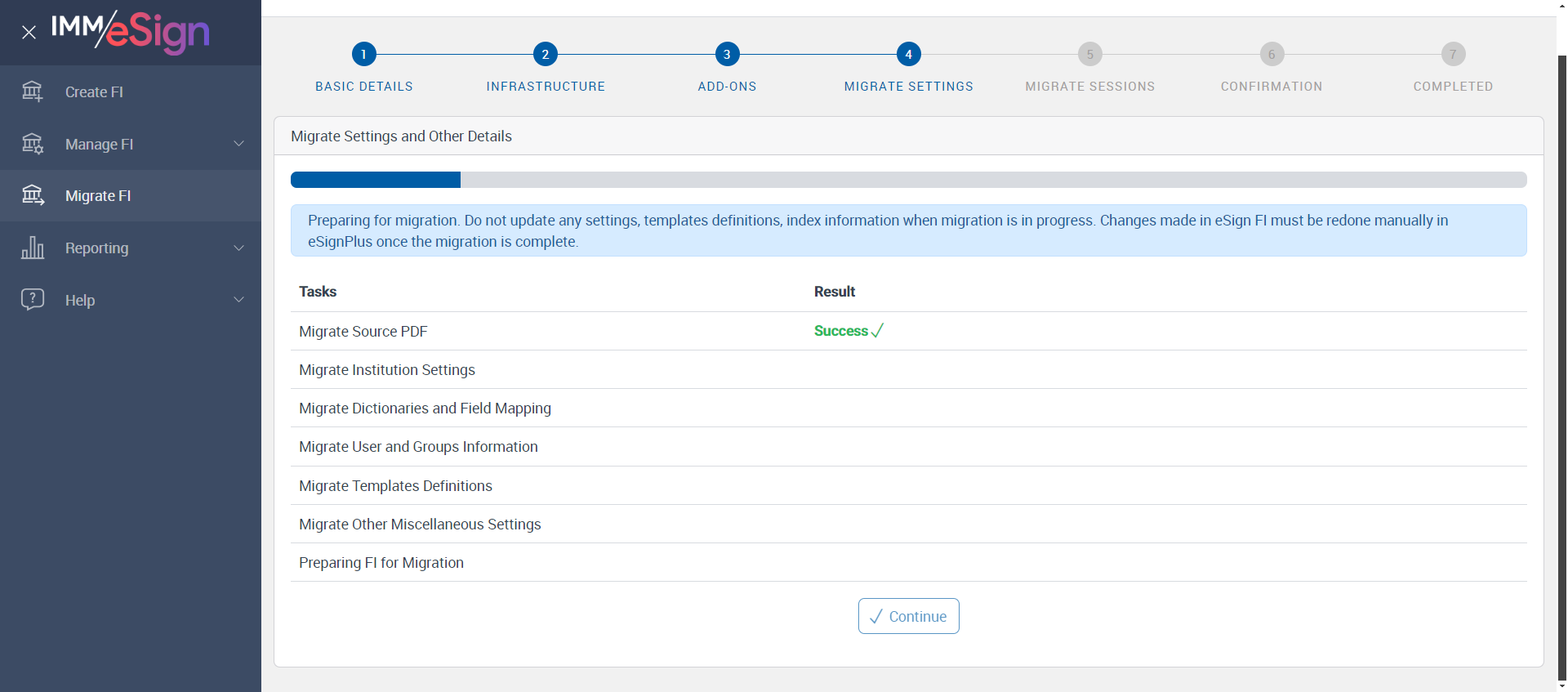 | com.imm.testscripts.MigrateFI.MigrateFi | verifyManageFIMessageforeSignAndPlusFI: verify that Manage FI display messages while migration is in progress for eSign and eSignPlus FI | 1715590768967 | 1128405 |