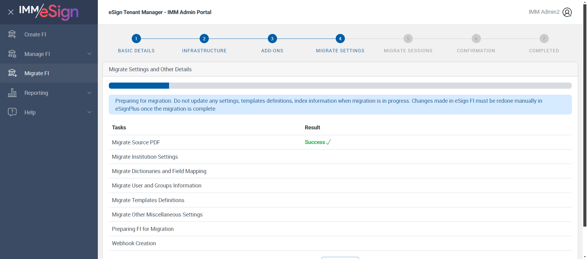 | com.imm.testscripts.MigrateFI.MigrateFi | verifyManageFIMessageforeSignAndPlusFI: verify that Manage FI display messages while migration is in progress for eSign and eSignPlus FI | 1715680629911 | 788862 |