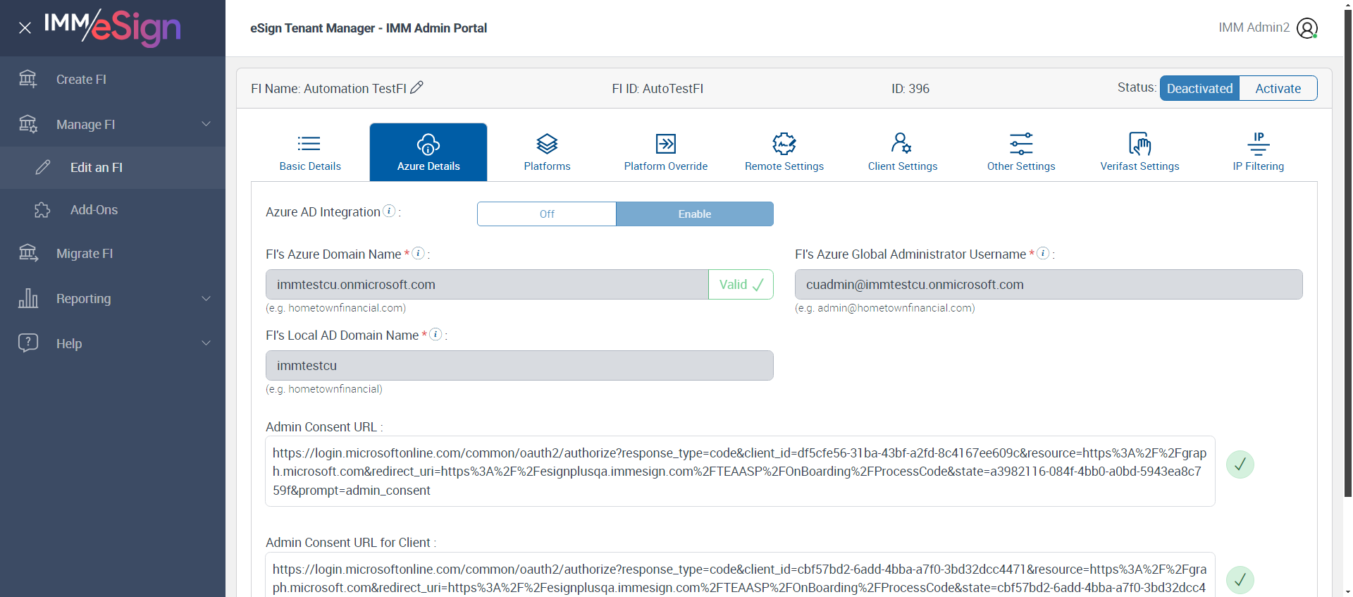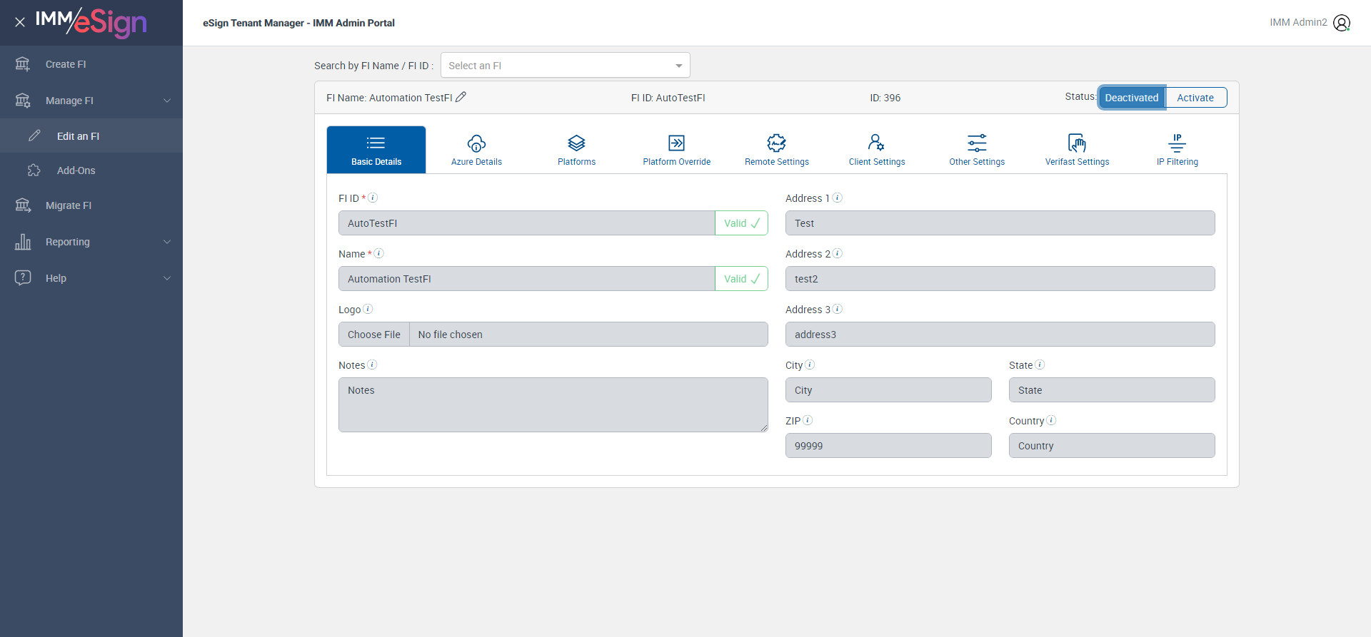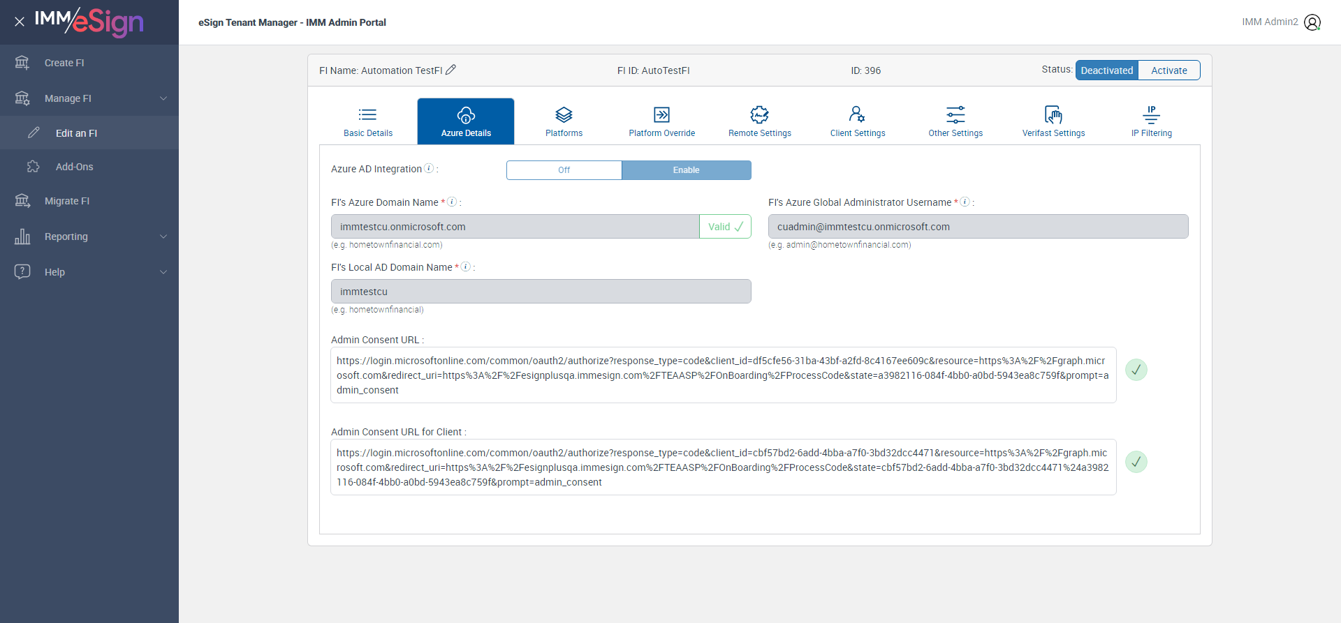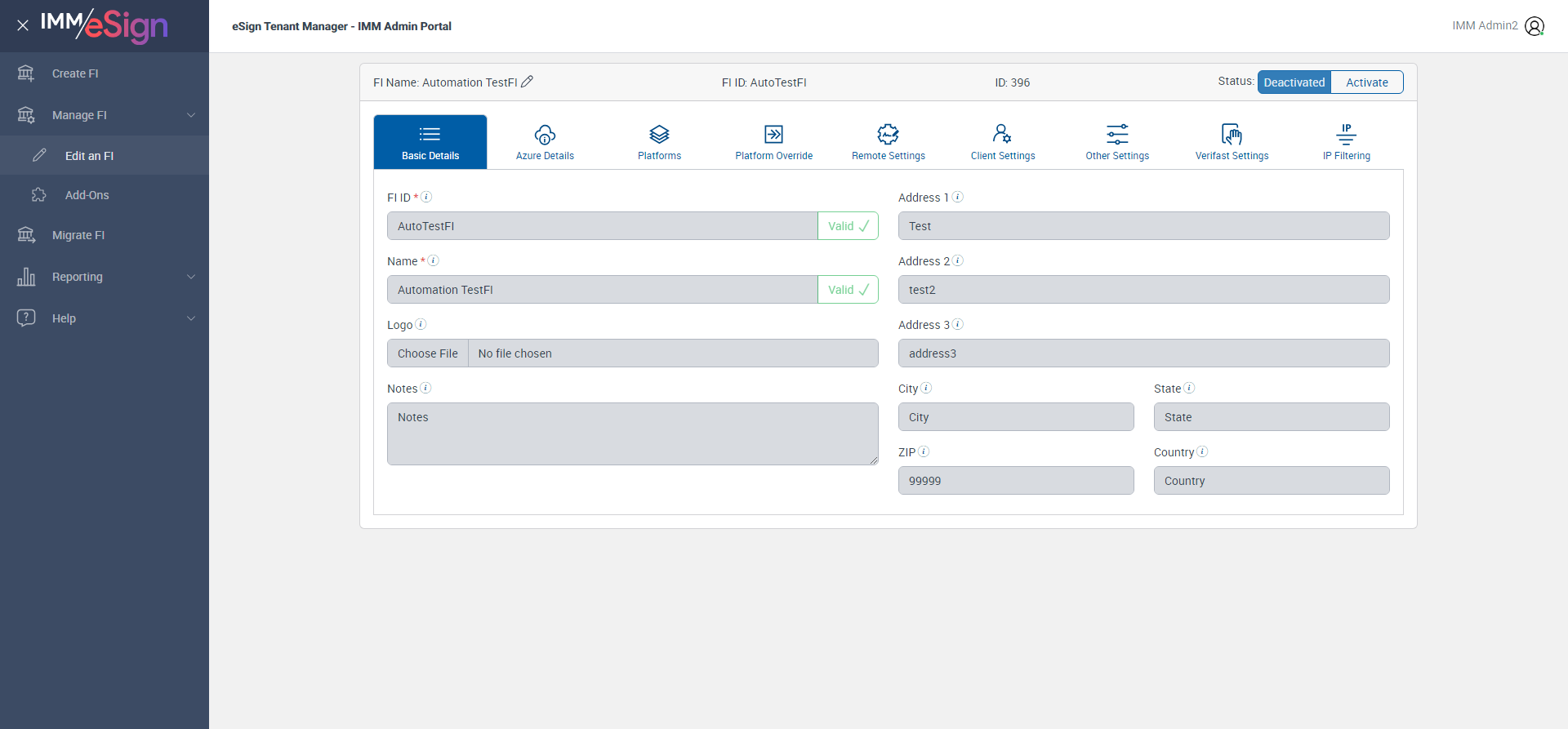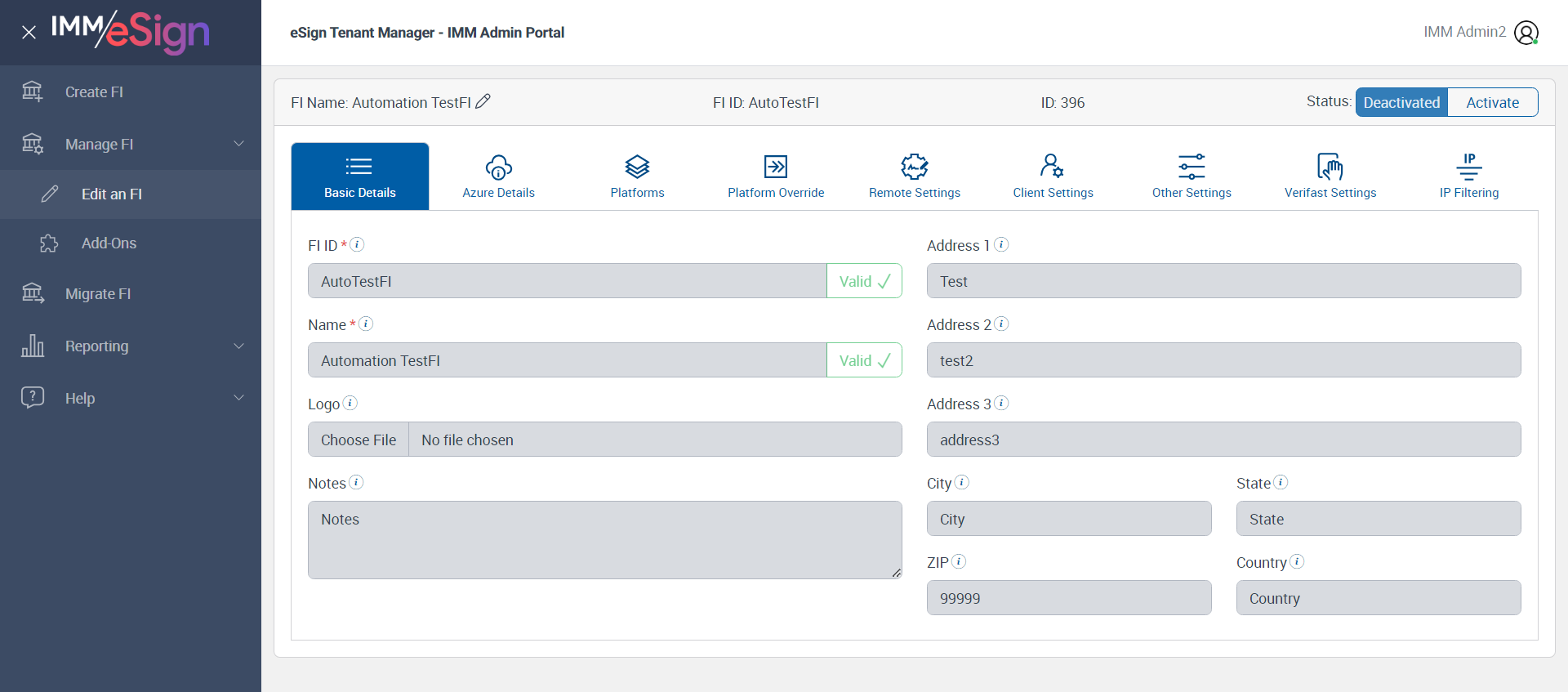 ({ZIP=08867, Dictionary=tesign;xp, StarterEvalDays=, Description=VerifyAddonPlatform&Settings, Login_User_ID=immadmin2@immesignqa.onmicrosoft.com, FiStatus=Submitted, StarterChecks=Off, eSignURL=, E-Vault=Off, Filepath=, Name=UnifiedFI, LocalDomain=cuadmin, TestID=VerifyAddonPlatformSettings, Verifast=Off, eSignPlus=Off, LacerPro=Enable, RtmAuthTypes=, Notes=Test, Session URL=https://esignnonprod.immesign.com/qa/tenantmanager/, GlobalAdmin=cuadmin@immtestcu.onmicrosoft.com, RemoteSign=Off, TypeOfUser=IMM Admin2, eValultDays=, DrpSpot=Off, ErrorMsg=, Address2=building 1, AZDomain=immtestcu.onmicrosoft.com, Address3=123, VerifastEDays=, Address1=2 City hall Plaza, City=Rahway, WrongAZDomain=, LCEvalDays=, State=NJ, LoanCoupon=Off, Login_Password=iMM@2022, WrongFIID=, DrpEvalDays=, Country=USA, ClientID=12223456asv_, FIID=UnifiedFI, Key=Test123})