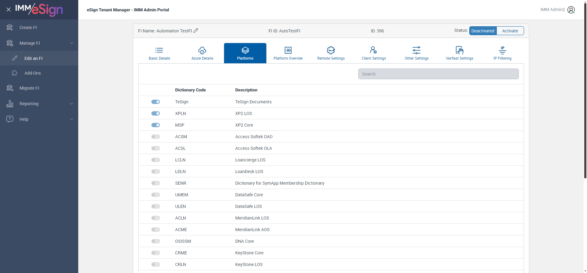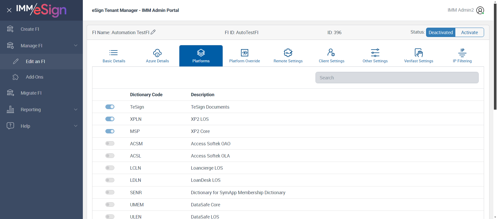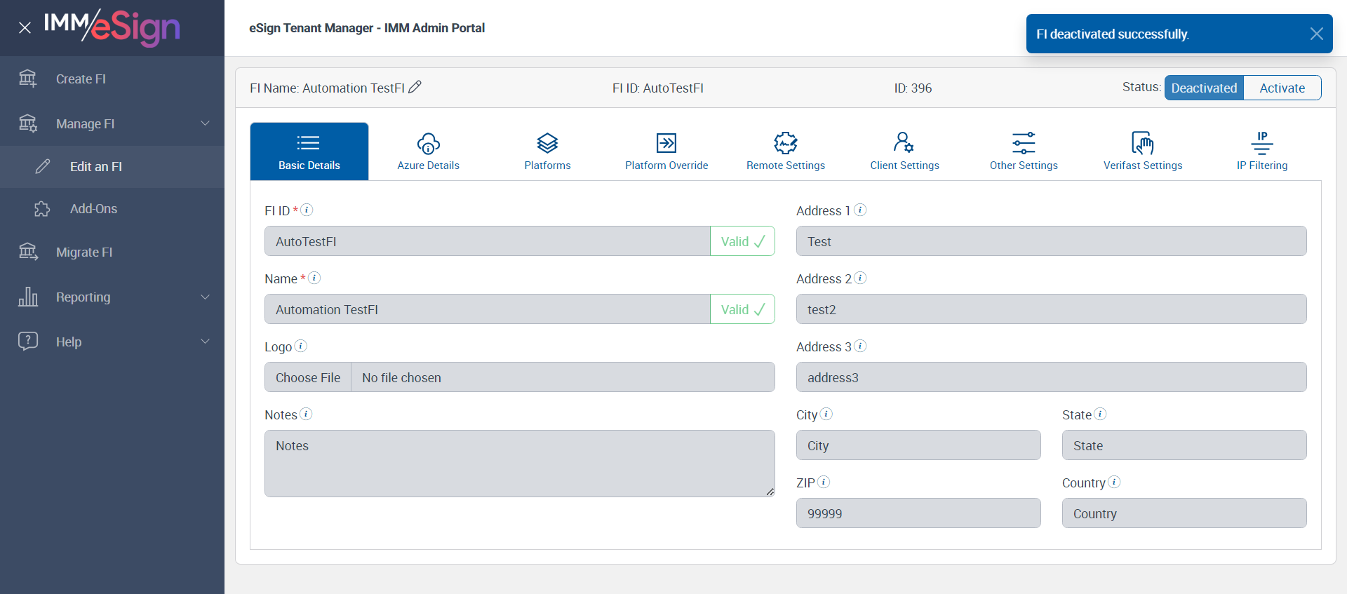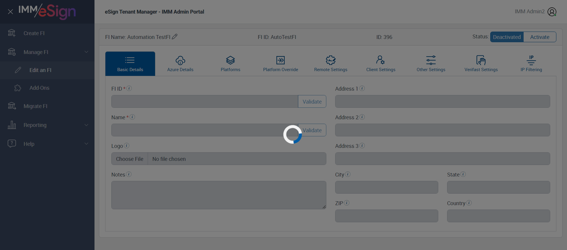 ({ZIP=08867, Dictionary=tesign;xp, StarterEvalDays=, Description=VerifyAddonPlatform&Settings, Login_User_ID=immadmin2@immesignqa.onmicrosoft.com, FiStatus=Submitted, StarterChecks=Off, eSignURL=, E-Vault=Off, Filepath=, Name=UnifiedFI, LocalDomain=cuadmin, TestID=VerifyAddonPlatformSettings, Verifast=Off, eSignPlus=Off, LacerPro=Enable, RtmAuthTypes=, Notes=Test, Session URL=https://esignnonprod.immesign.com/qa/tenantmanager/, GlobalAdmin=cuadmin@immtestcu.onmicrosoft.com, RemoteSign=Off, TypeOfUser=IMM Admin2, eValultDays=, DrpSpot=Off, ErrorMsg=, Address2=building 1, AZDomain=immtestcu.onmicrosoft.com, Address3=123, VerifastEDays=, Address1=2 City hall Plaza, City=Rahway, WrongAZDomain=, LCEvalDays=, State=NJ, LoanCoupon=Off, Login_Password=iMM@2022, WrongFIID=, DrpEvalDays=, Country=USA, ClientID=12223456asv_, FIID=UnifiedFI, Key=Test123})