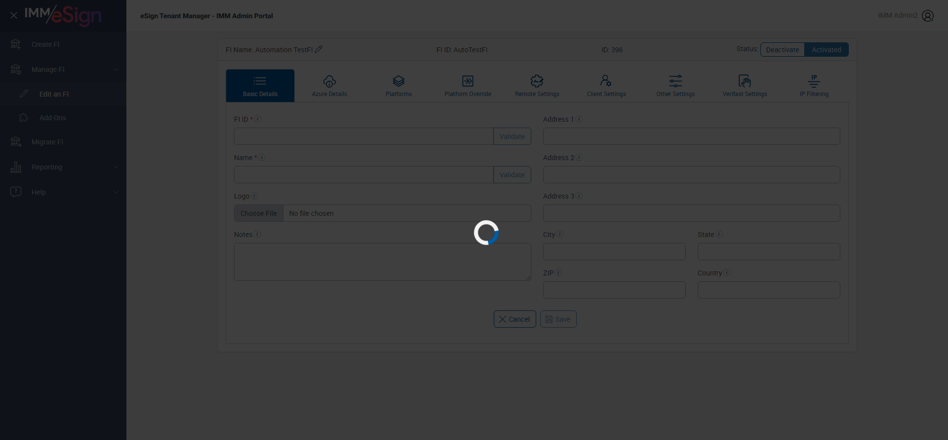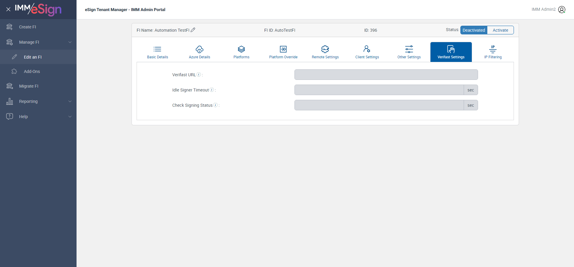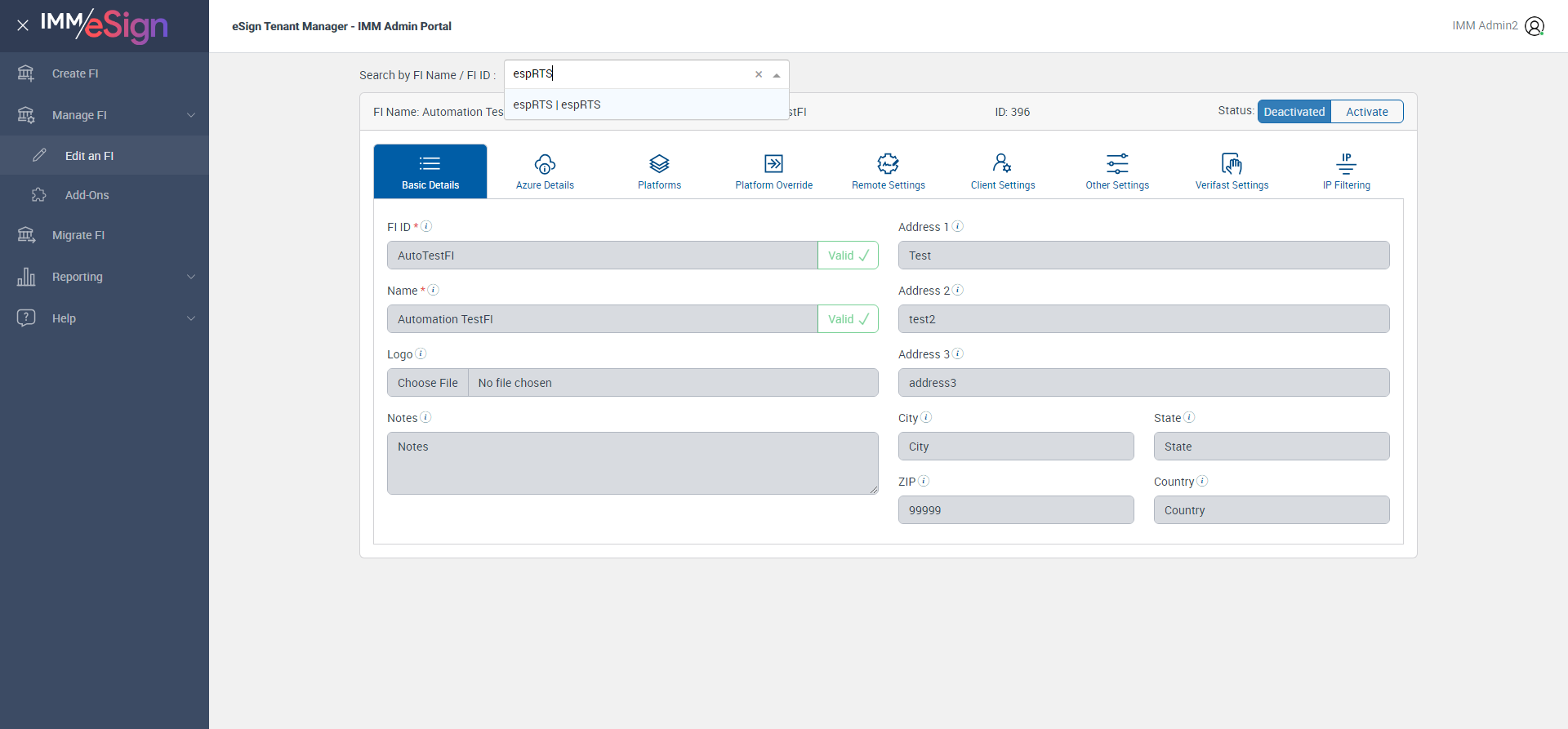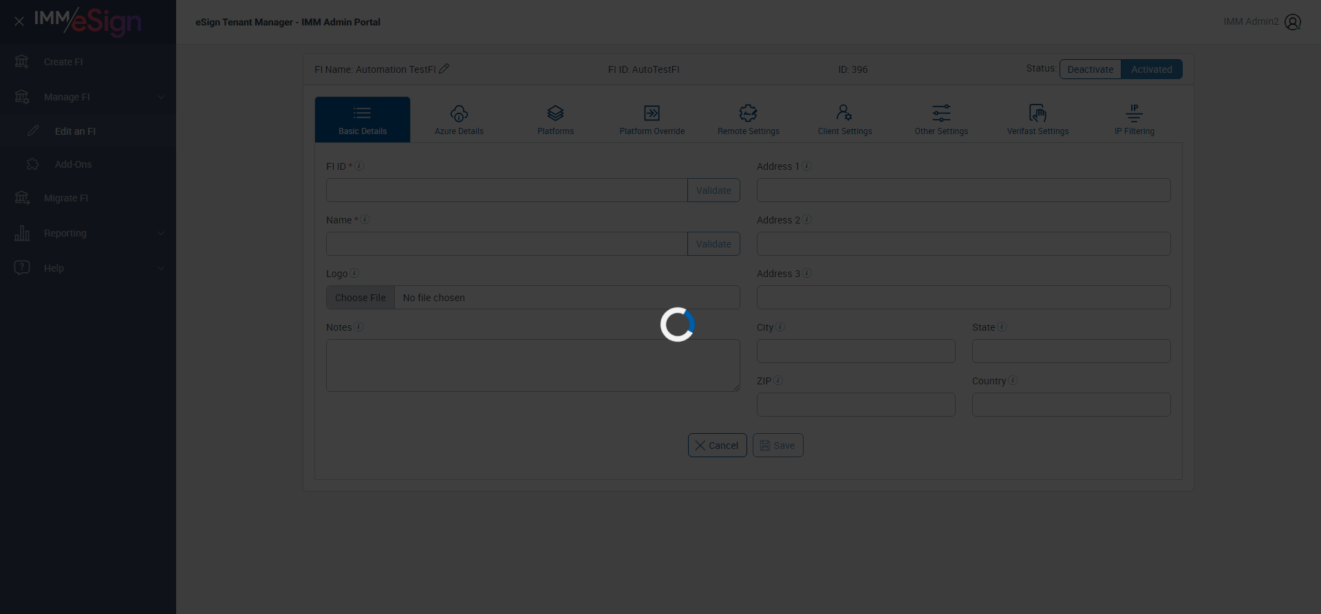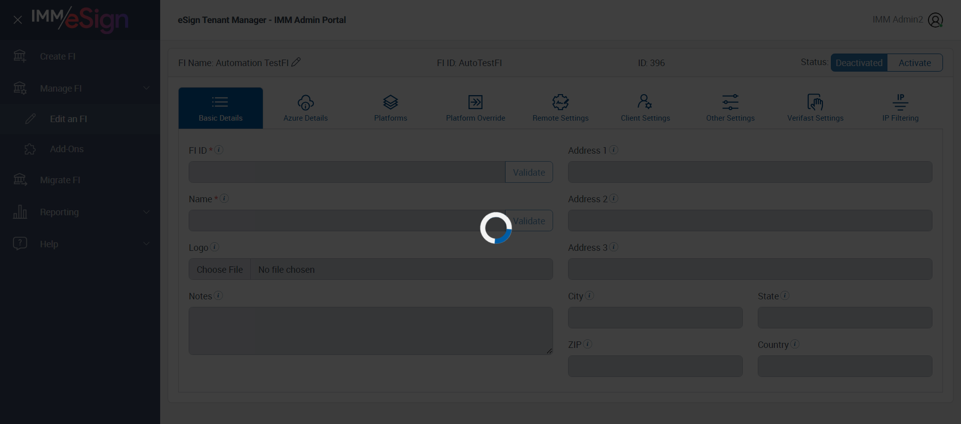 ({ZIP=08867, Dictionary=tesign;xp, StarterEvalDays=, Description=VerifyAddonPlatform&Settings, Login_User_ID=immadmin2@immesignqa.onmicrosoft.com, FiStatus=Submitted, StarterChecks=Off, eSignURL=, E-Vault=Off, Filepath=, Name=UnifiedFI, LocalDomain=cuadmin, TestID=VerifyAddonPlatformSettings, Verifast=Off, eSignPlus=Off, LacerPro=Enable, RtmAuthTypes=, Notes=Test, Session URL=https://esignnonprod.immesign.com/qa/tenantmanager/, GlobalAdmin=cuadmin@immtestcu.onmicrosoft.com, RemoteSign=Off, TypeOfUser=IMM Admin2, eValultDays=, DrpSpot=Off, ErrorMsg=, Address2=building 1, AZDomain=immtestcu.onmicrosoft.com, Address3=123, VerifastEDays=, Address1=2 City hall Plaza, City=Rahway, WrongAZDomain=, LCEvalDays=, State=NJ, LoanCoupon=Off, Login_Password=iMM@2022, WrongFIID=, DrpEvalDays=, Country=USA, ClientID=12223456asv_, FIID=UnifiedFI, Key=Test123})
