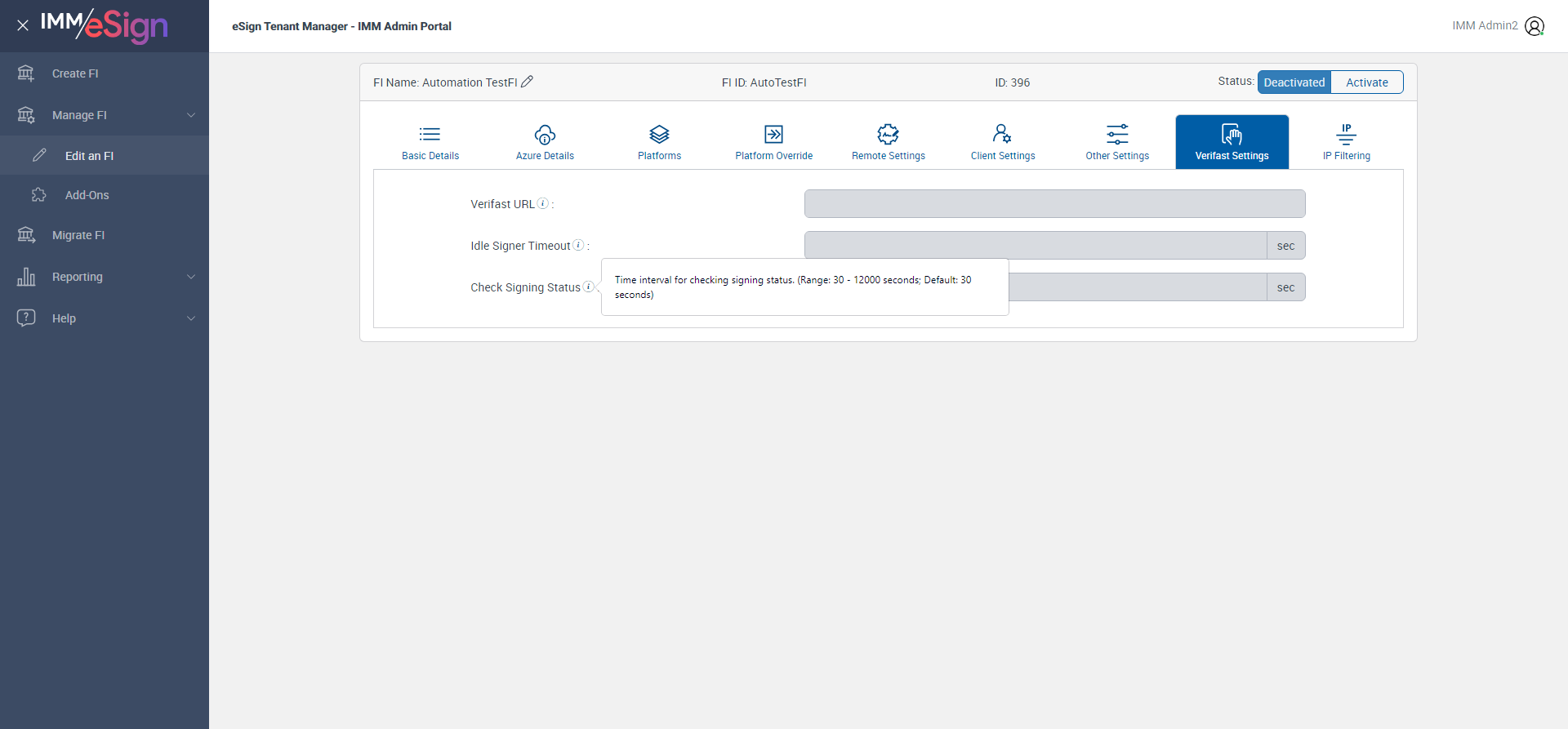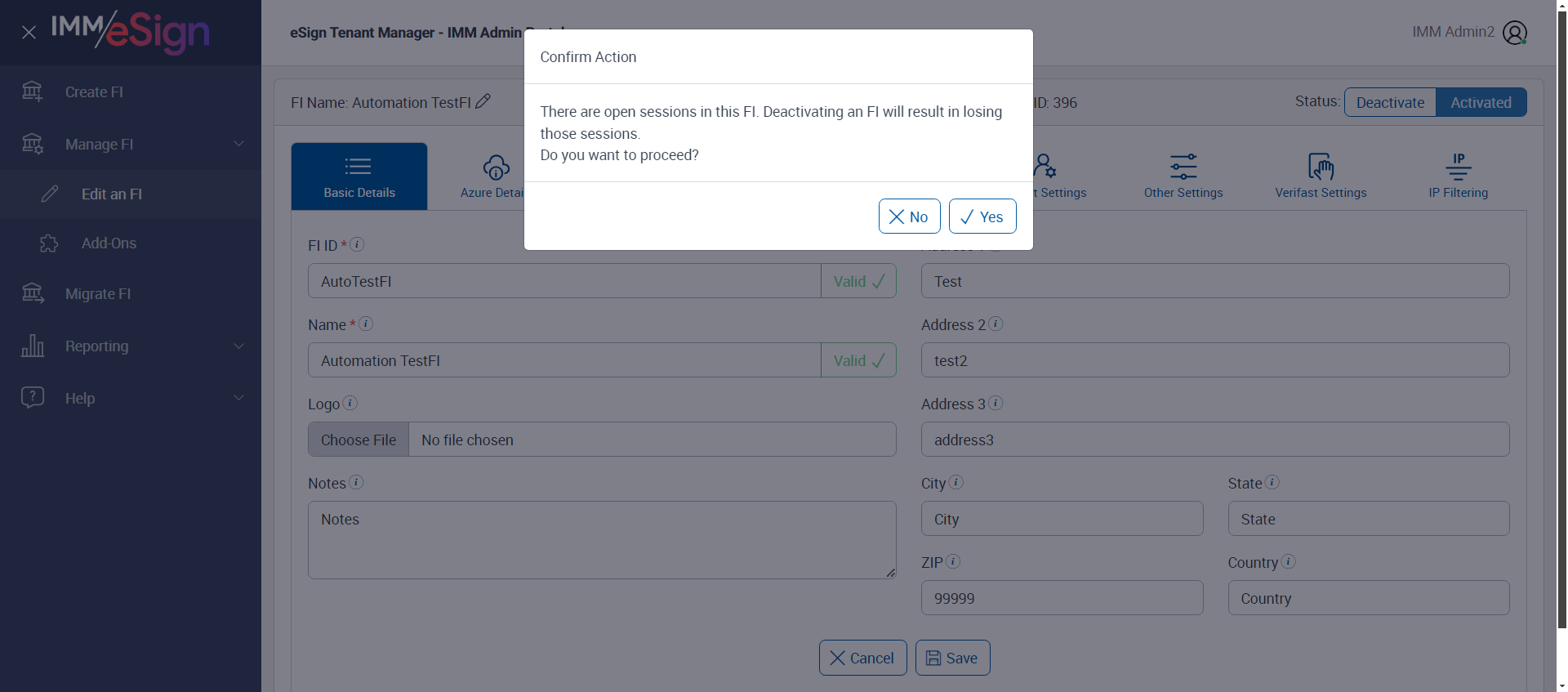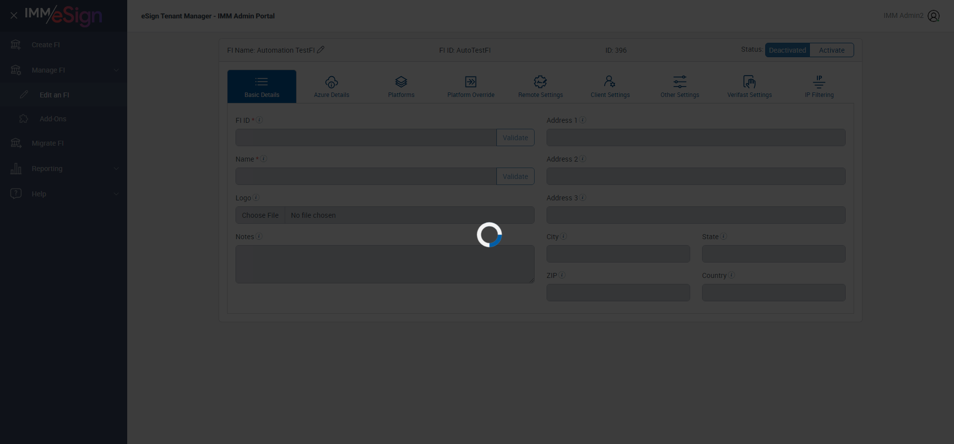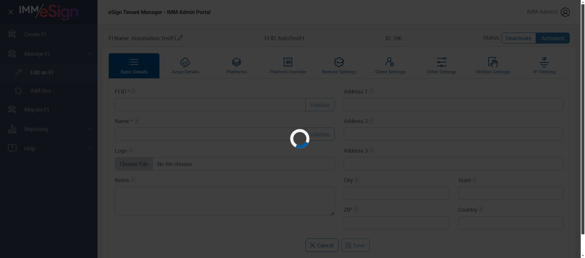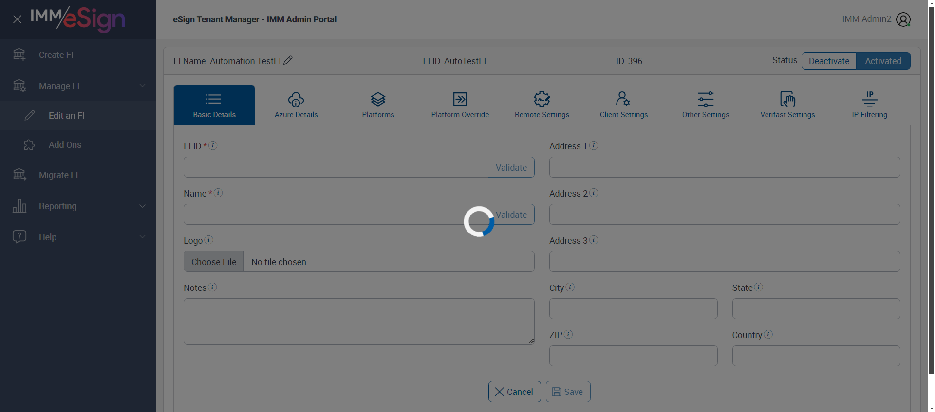 ({ZIP=08867, Dictionary=tesign;xp, StarterEvalDays=, Description=VerifyAddonPlatform&Settings, Login_User_ID=immadmin2@immesignqa.onmicrosoft.com, FiStatus=Submitted, StarterChecks=Off, eSignURL=, E-Vault=Off, Filepath=, Name=UnifiedFI, LocalDomain=cuadmin, TestID=VerifyAddonPlatformSettings, Verifast=Off, eSignPlus=Off, LacerPro=Enable, RtmAuthTypes=, Notes=Test, Session URL=https://esignnonprod.immesign.com/qa/tenantmanager/, GlobalAdmin=cuadmin@immtestcu.onmicrosoft.com, RemoteSign=Off, TypeOfUser=IMM Admin2, eValultDays=, DrpSpot=Off, ErrorMsg=, Address2=building 1, AZDomain=immtestcu.onmicrosoft.com, Address3=123, VerifastEDays=, Address1=2 City hall Plaza, City=Rahway, WrongAZDomain=, LCEvalDays=, State=NJ, LoanCoupon=Off, Login_Password=iMM@2022, WrongFIID=, DrpEvalDays=, Country=USA, ClientID=12223456asv_, FIID=UnifiedFI, Key=Test123})