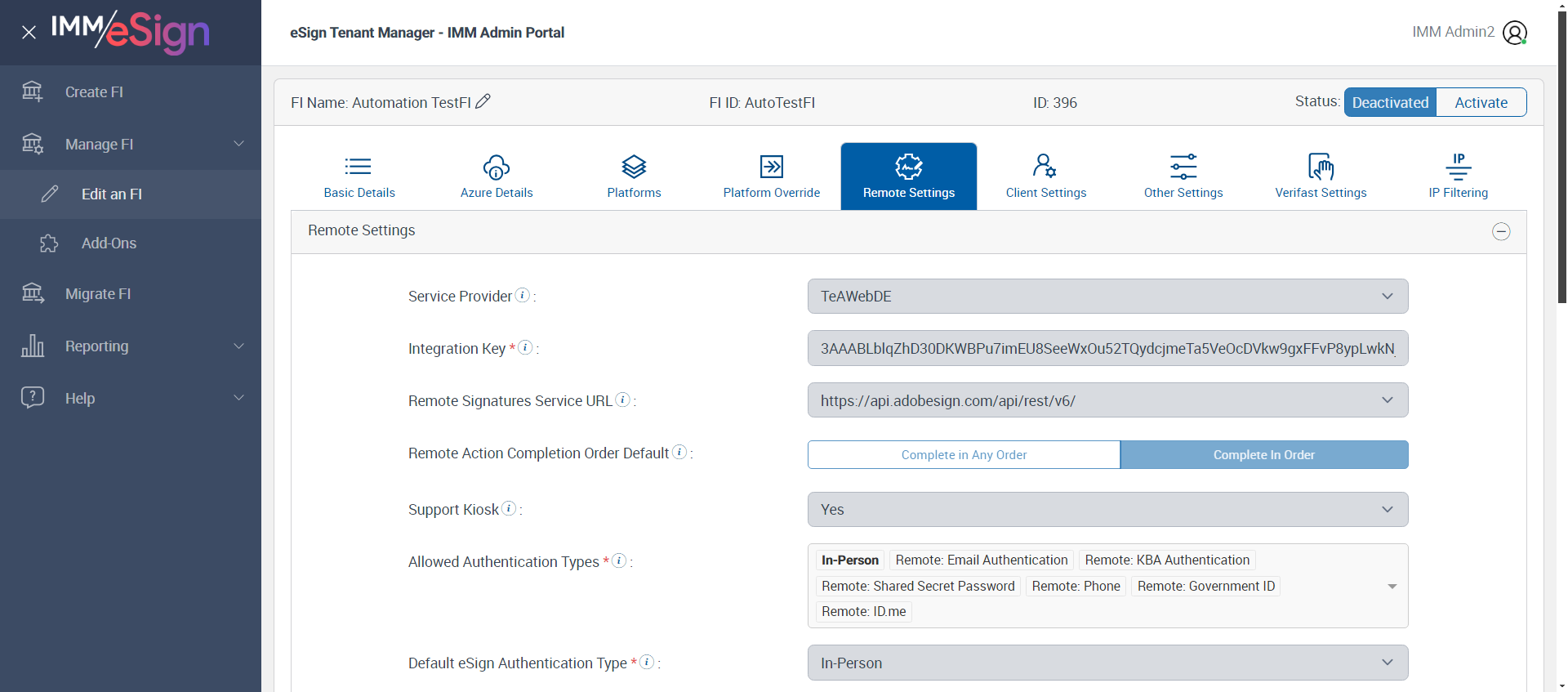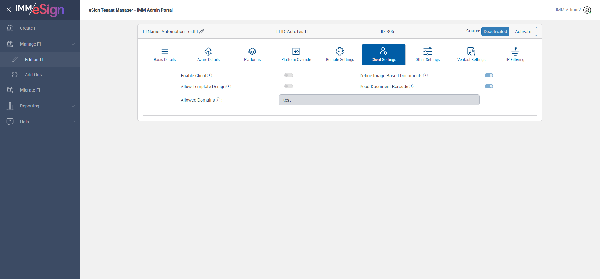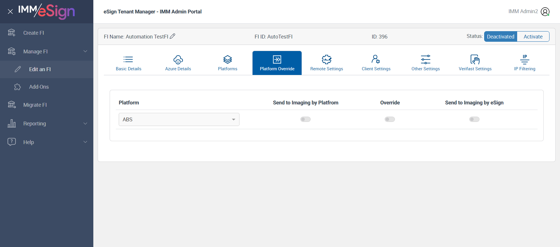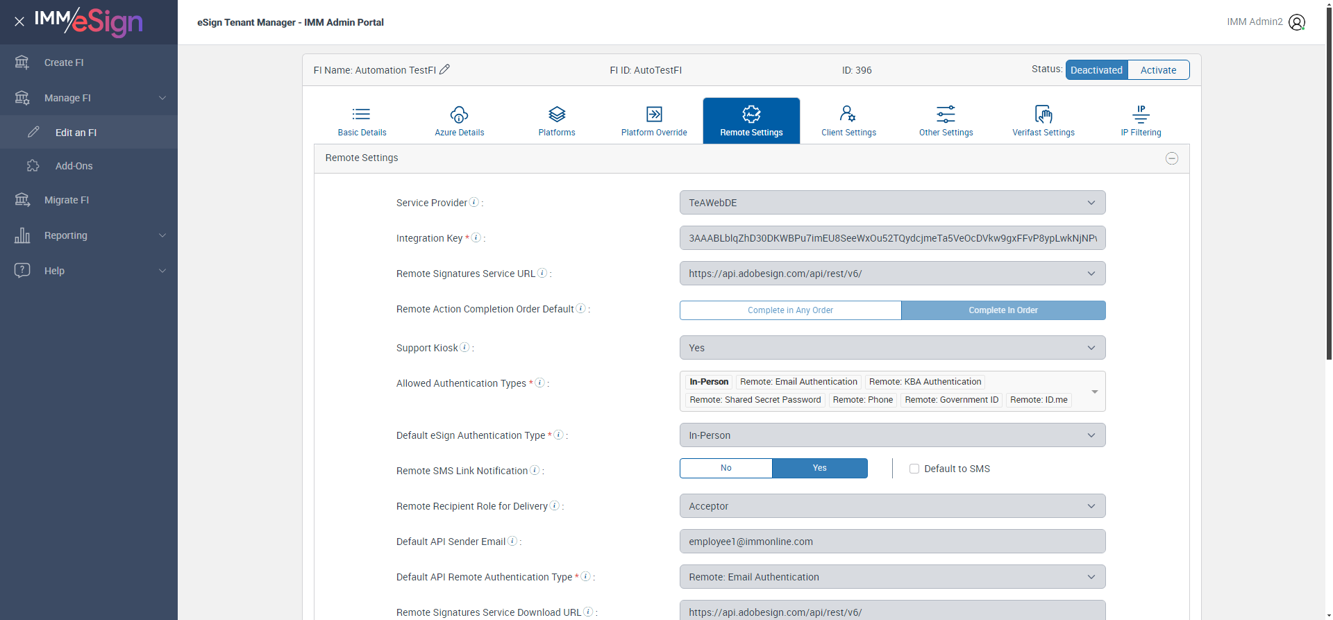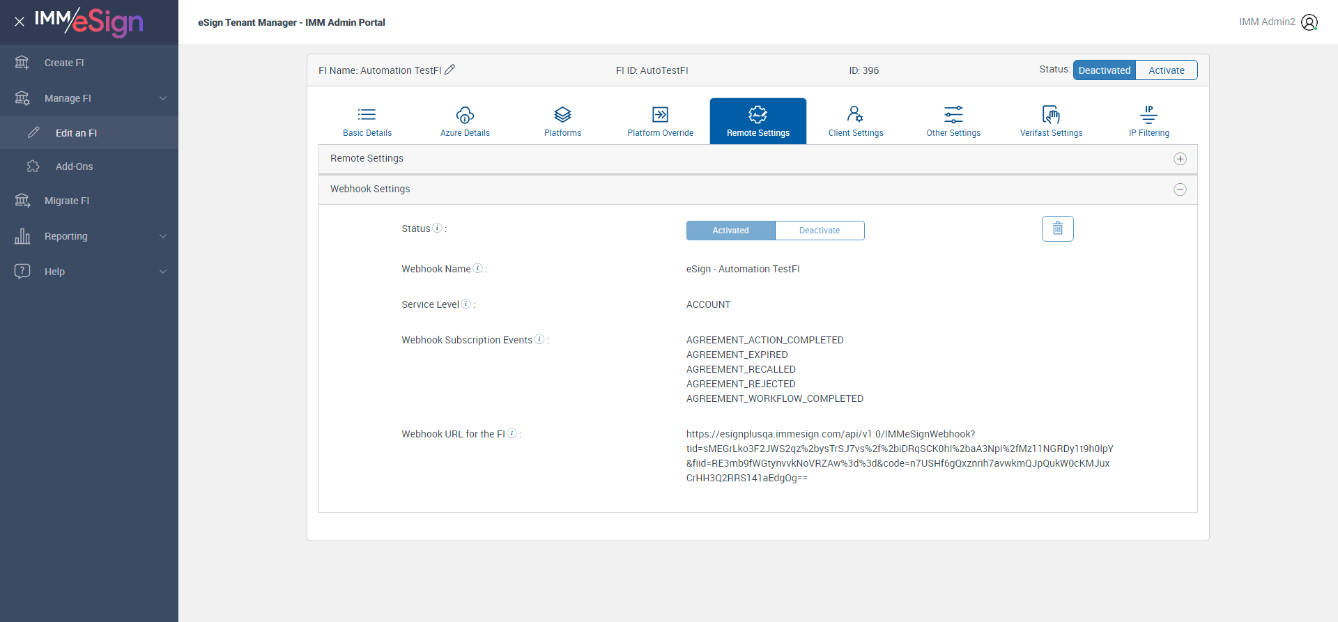 ({ZIP=08867, Dictionary=tesign;xp, StarterEvalDays=, Description=VerifyAddonPlatform&Settings, Login_User_ID=immadmin2@immesignqa.onmicrosoft.com, FiStatus=Submitted, StarterChecks=Off, eSignURL=, E-Vault=Off, Filepath=, Name=UnifiedFI, LocalDomain=cuadmin, TestID=VerifyAddonPlatformSettings, Verifast=Off, eSignPlus=Off, LacerPro=Enable, RtmAuthTypes=, Notes=Test, Session URL=https://esignnonprod.immesign.com/qa/tenantmanager/, GlobalAdmin=cuadmin@immtestcu.onmicrosoft.com, RemoteSign=Off, TypeOfUser=IMM Admin2, eValultDays=, DrpSpot=Off, ErrorMsg=, Address2=building 1, AZDomain=immtestcu.onmicrosoft.com, Address3=123, VerifastEDays=, Address1=2 City hall Plaza, City=Rahway, WrongAZDomain=, LCEvalDays=, State=NJ, LoanCoupon=Off, Login_Password=iMM@2022, WrongFIID=, DrpEvalDays=, Country=USA, ClientID=12223456asv_, FIID=UnifiedFI, Key=Test123})