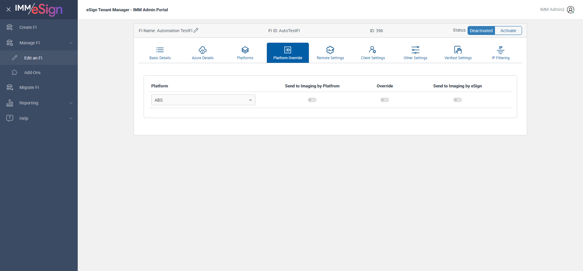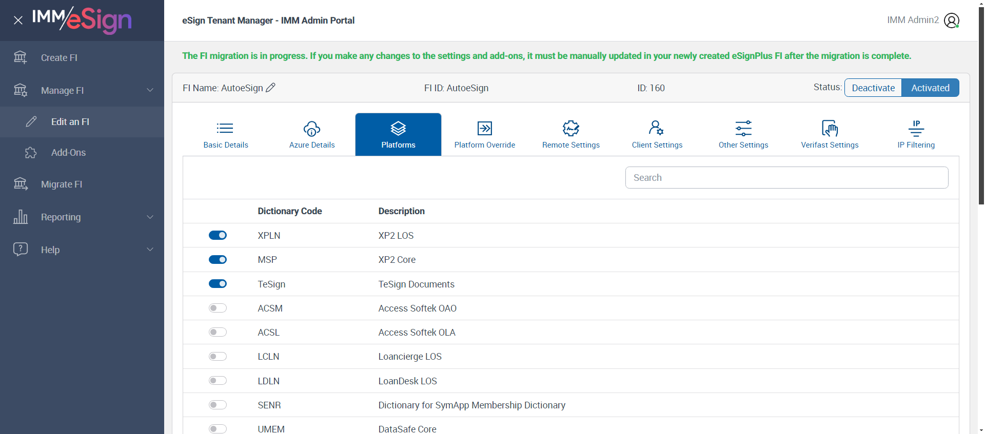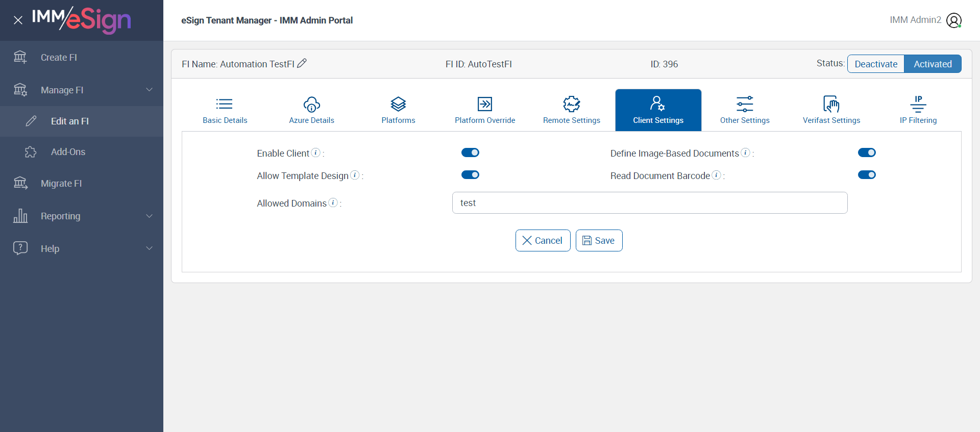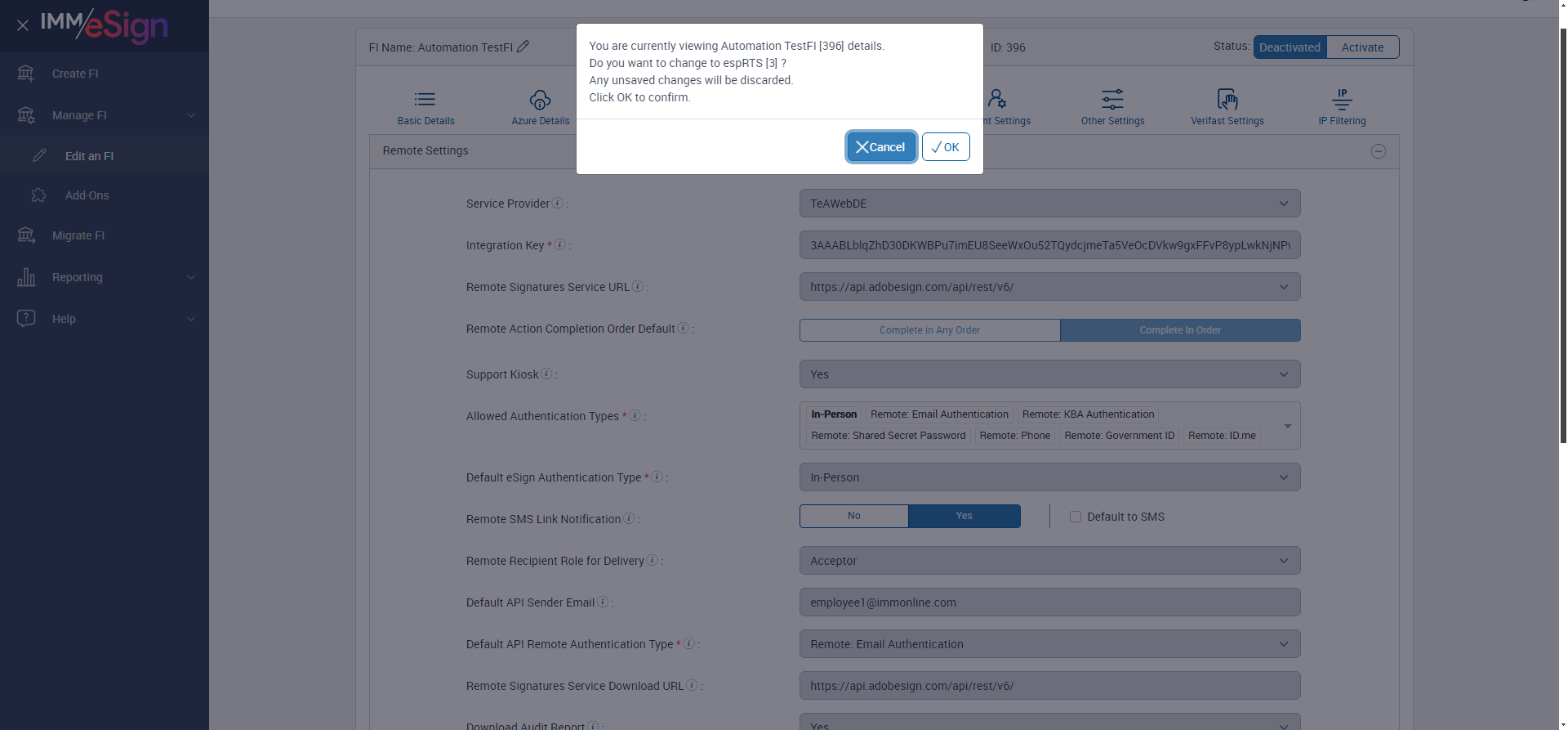 ({ZIP=08867, Dictionary=tesign;xp, StarterEvalDays=, Description=VerifyAddonPlatform&Settings, Login_User_ID=immadmin2@immesignqa.onmicrosoft.com, FiStatus=Submitted, StarterChecks=Off, eSignURL=, E-Vault=Off, Filepath=, Name=UnifiedFI, LocalDomain=cuadmin, TestID=VerifyAddonPlatformSettings, Verifast=Off, eSignPlus=Off, LacerPro=Enable, RtmAuthTypes=, Notes=Test, Session URL=https://esignnonprod.immesign.com/qa/tenantmanager/, GlobalAdmin=cuadmin@immtestcu.onmicrosoft.com, RemoteSign=Off, TypeOfUser=IMM Admin2, eValultDays=, DrpSpot=Off, ErrorMsg=, Address2=building 1, AZDomain=immtestcu.onmicrosoft.com, Address3=123, VerifastEDays=, Address1=2 City hall Plaza, City=Rahway, WrongAZDomain=, LCEvalDays=, State=NJ, LoanCoupon=Off, Login_Password=iMM@2022, WrongFIID=, DrpEvalDays=, Country=USA, ClientID=12223456asv_, FIID=UnifiedFI, Key=Test123})