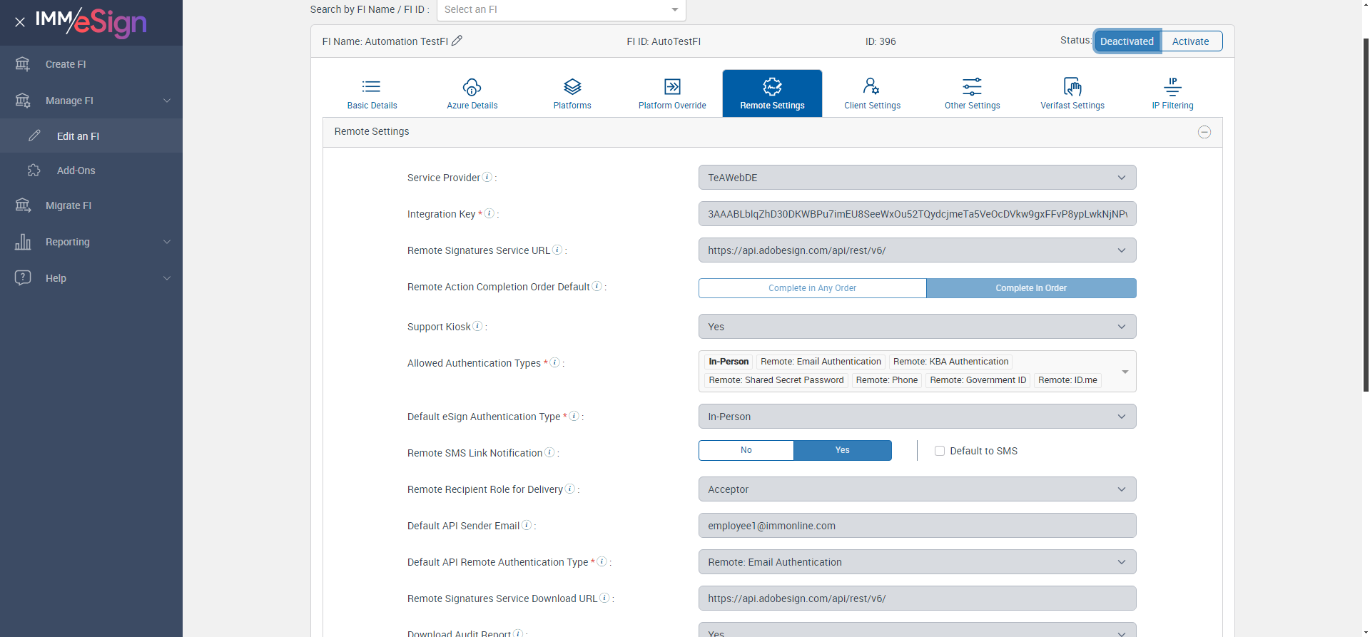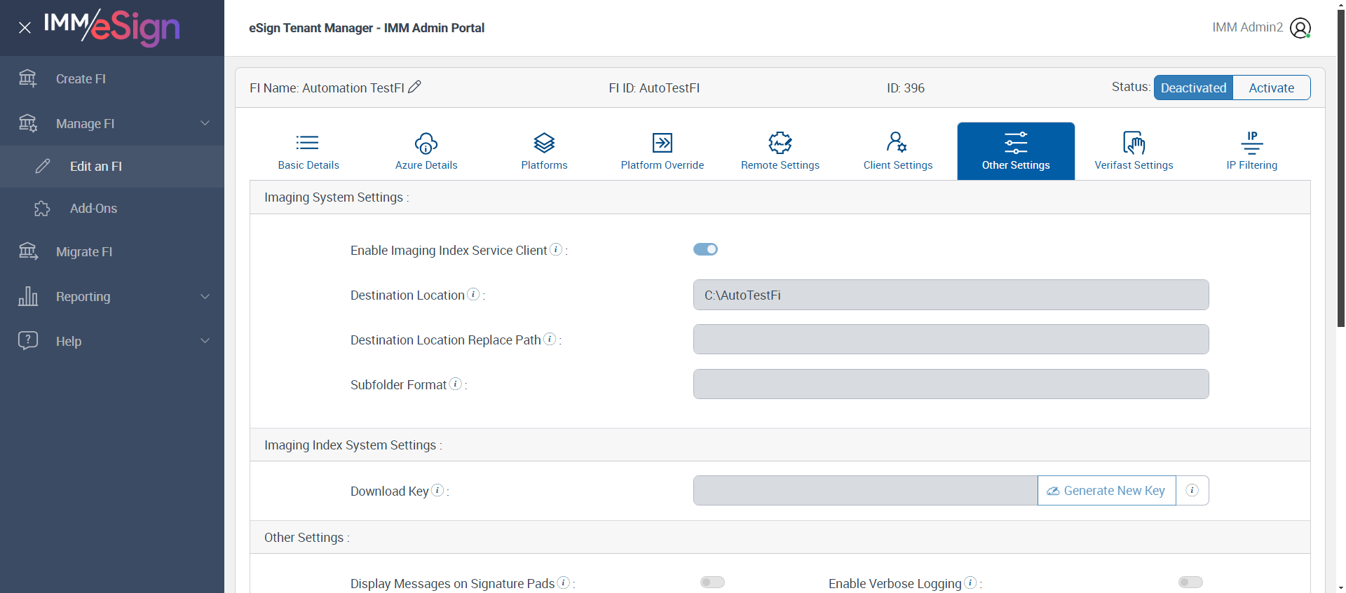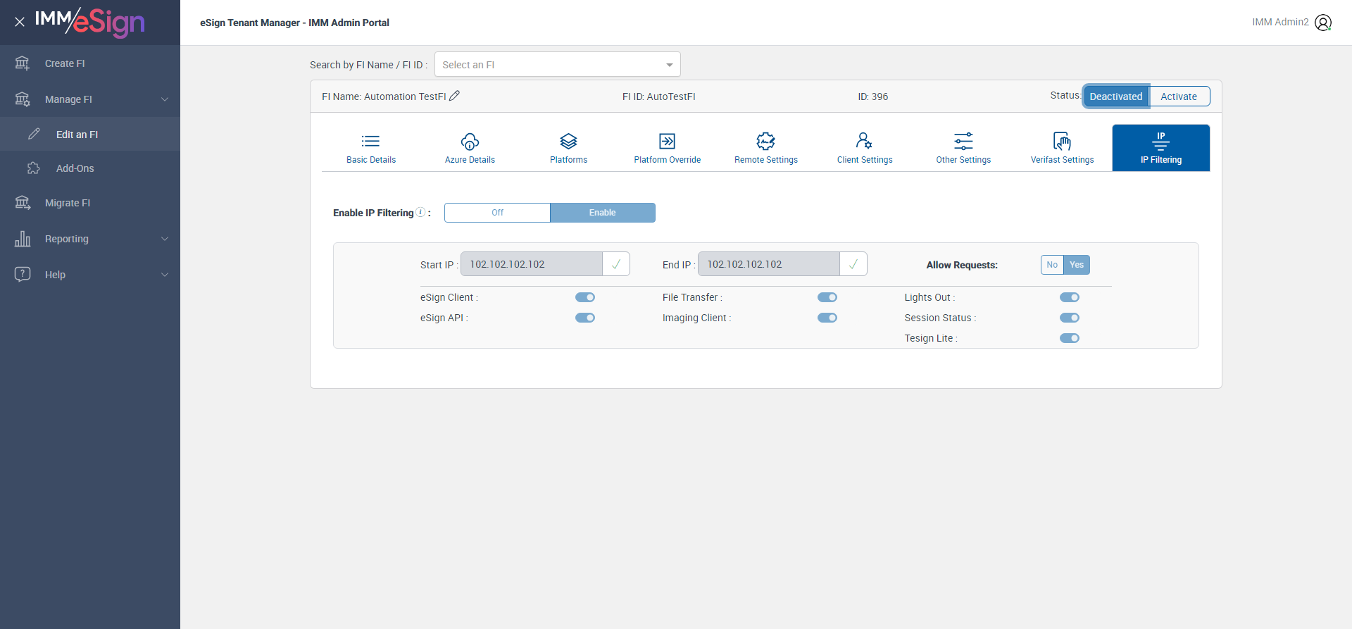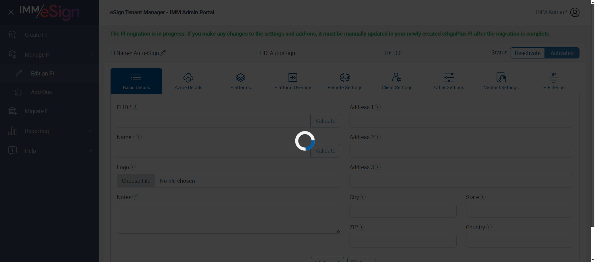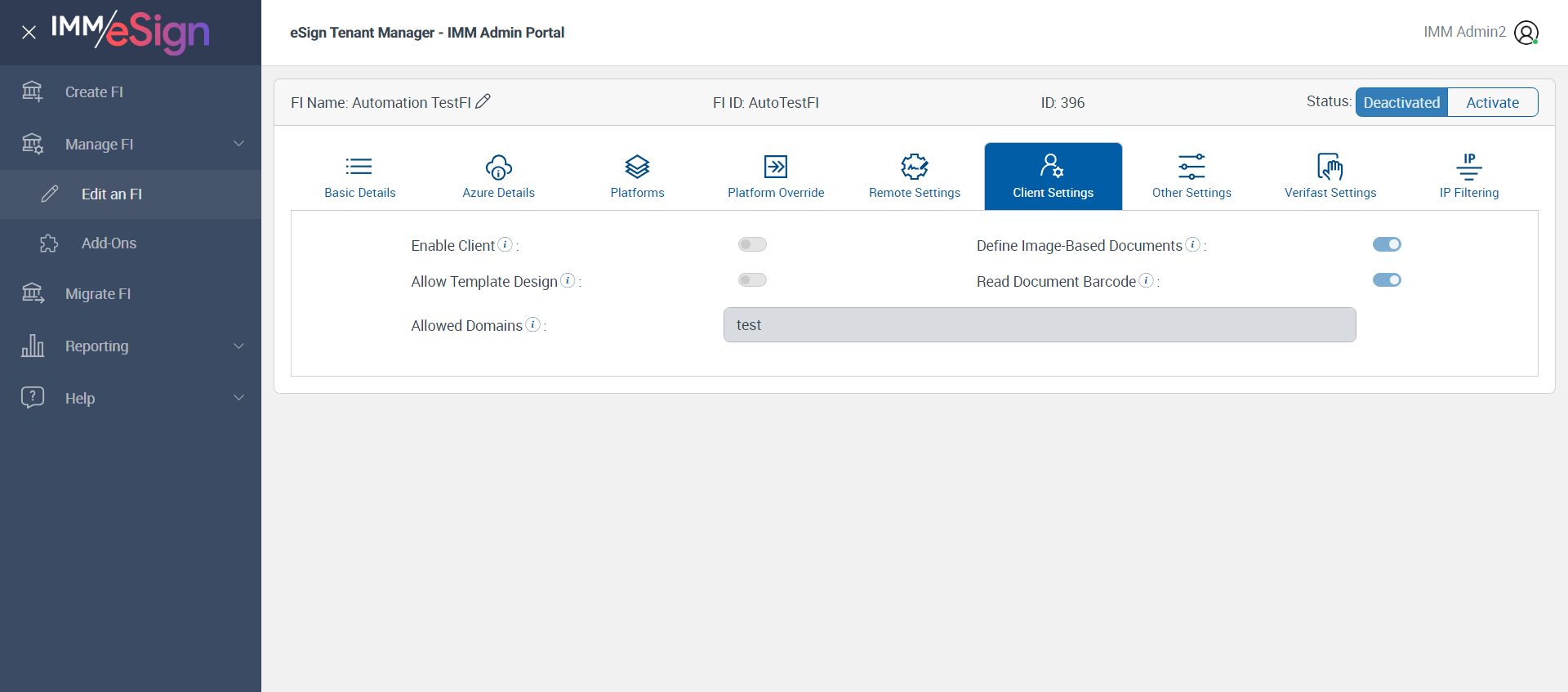 ({ZIP=08867, Dictionary=tesign;xp, StarterEvalDays=, Description=VerifyAddonPlatform&Settings, Login_User_ID=immadmin2@immesignqa.onmicrosoft.com, FiStatus=Submitted, StarterChecks=Off, eSignURL=, E-Vault=Off, Filepath=, Name=UnifiedFI, LocalDomain=cuadmin, TestID=VerifyAddonPlatformSettings, Verifast=Off, eSignPlus=Off, LacerPro=Enable, RtmAuthTypes=, Notes=Test, Session URL=https://esignnonprod.immesign.com/qa/tenantmanager/, GlobalAdmin=cuadmin@immtestcu.onmicrosoft.com, RemoteSign=Off, TypeOfUser=IMM Admin2, eValultDays=, DrpSpot=Off, ErrorMsg=, Address2=building 1, AZDomain=immtestcu.onmicrosoft.com, Address3=123, VerifastEDays=, Address1=2 City hall Plaza, City=Rahway, WrongAZDomain=, LCEvalDays=, State=NJ, LoanCoupon=Off, Login_Password=iMM@2022, WrongFIID=, DrpEvalDays=, Country=USA, ClientID=12223456asv_, FIID=UnifiedFI, Key=Test123})