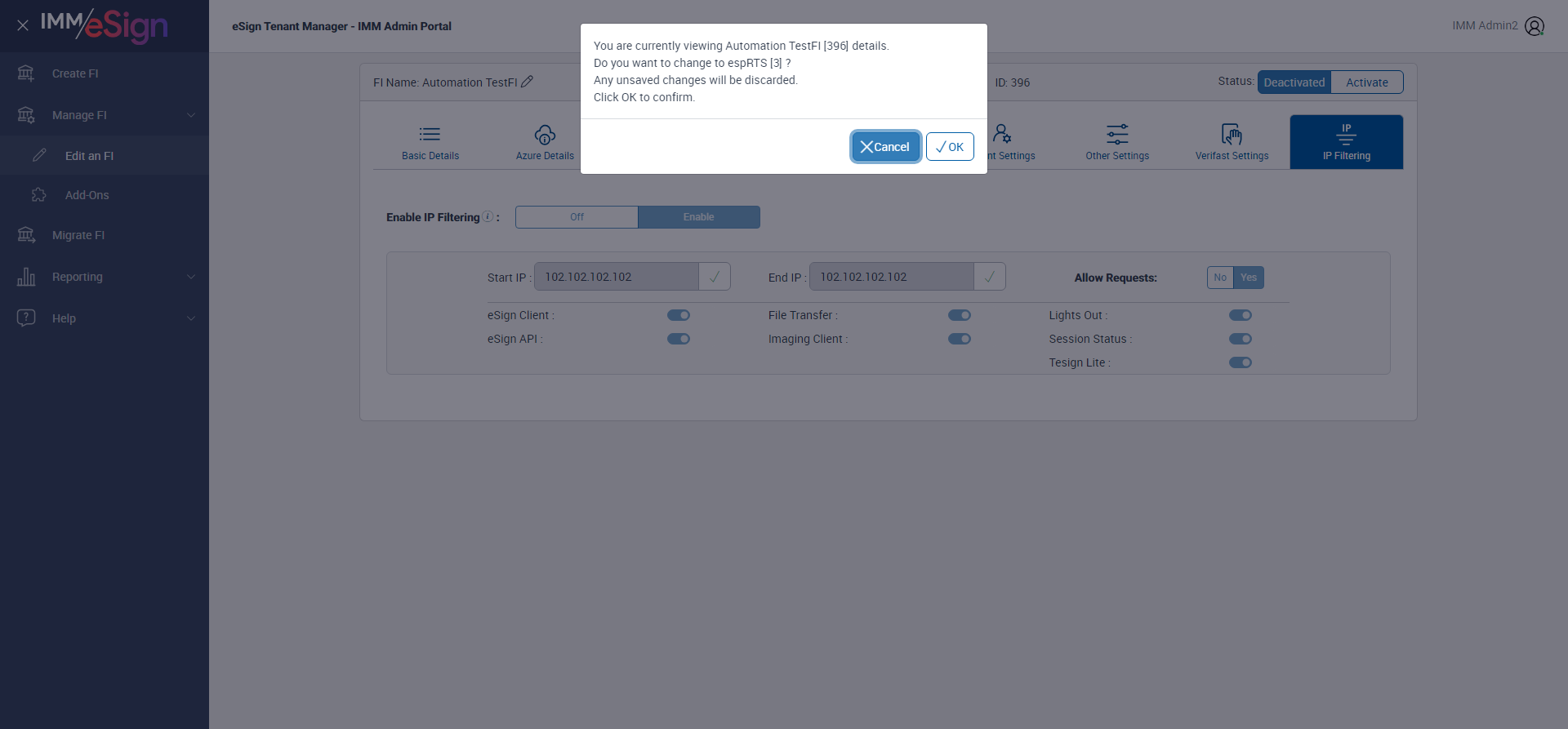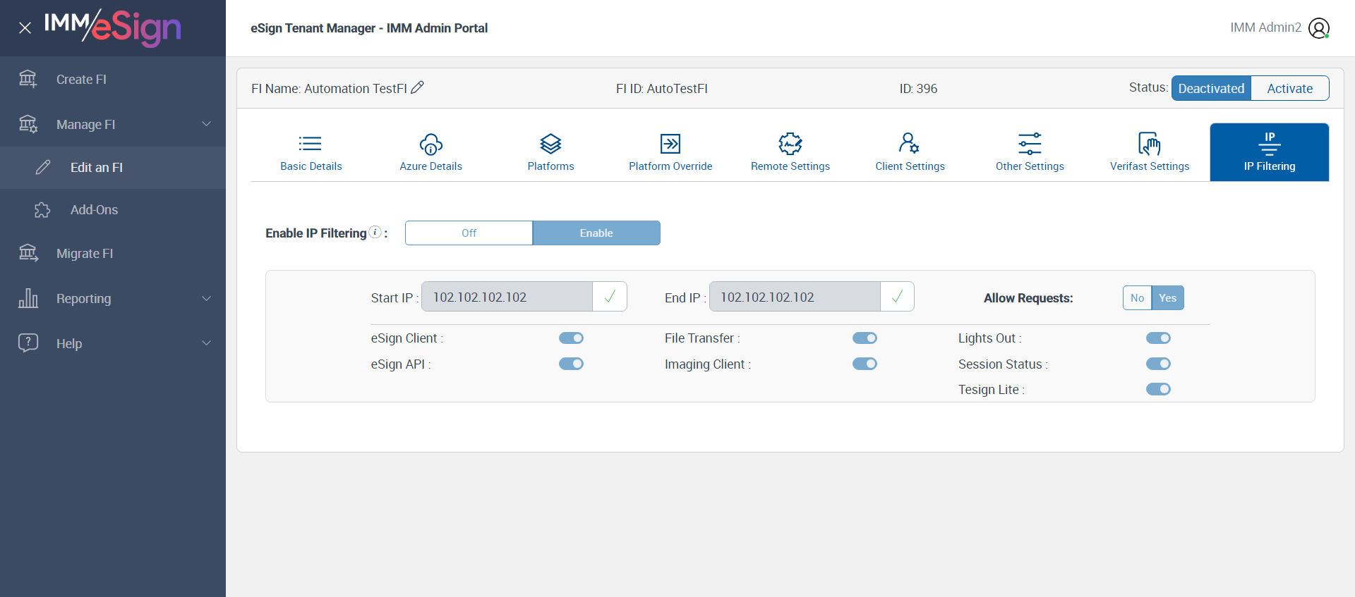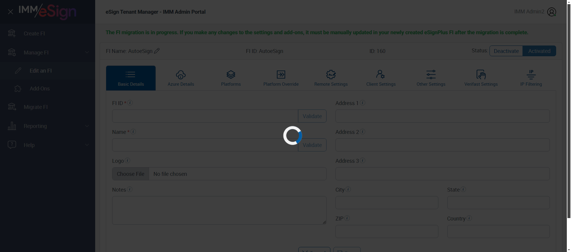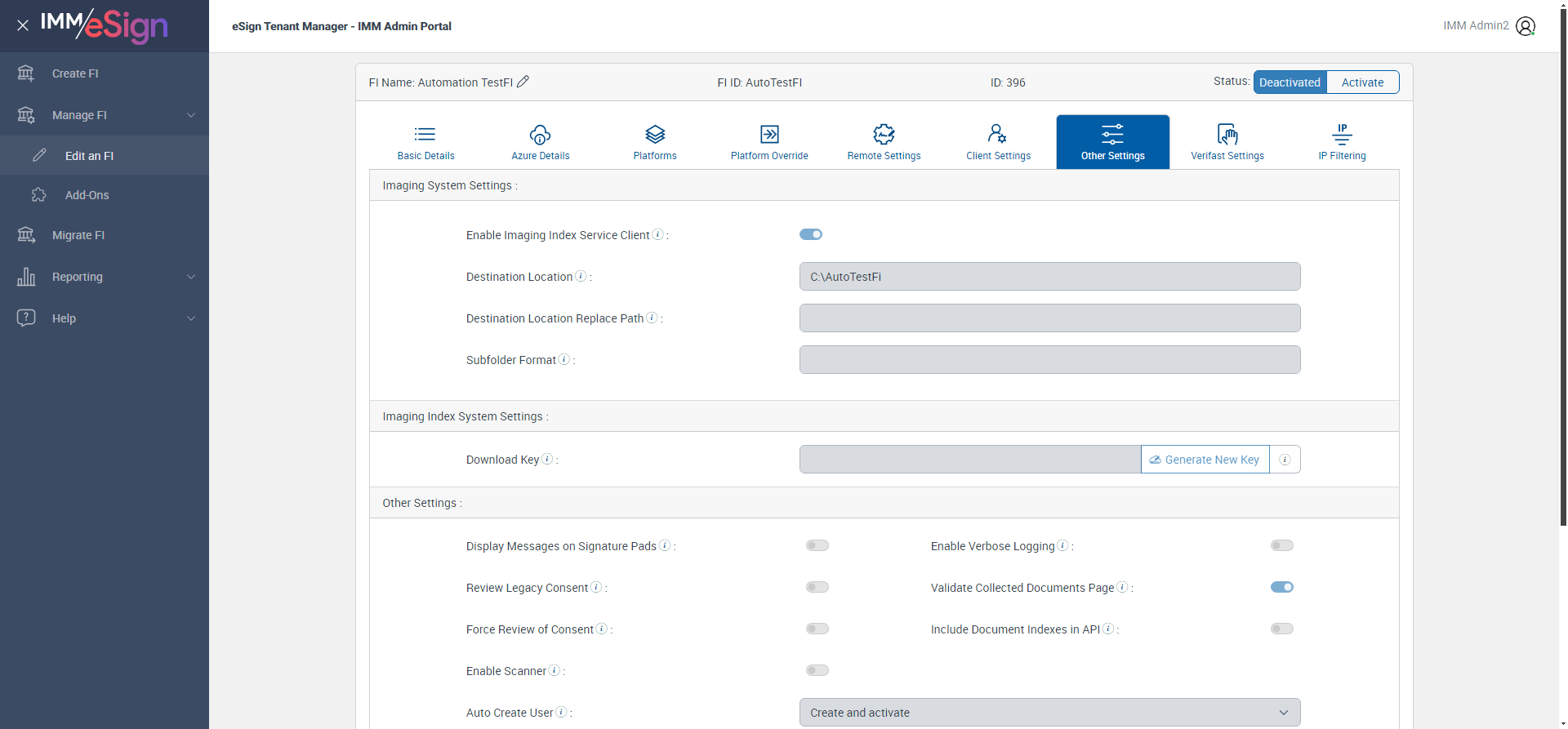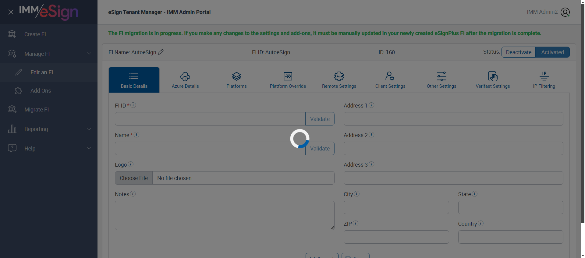 ({ZIP=08867, Dictionary=tesign;xp, StarterEvalDays=, Description=VerifyAddonPlatform&Settings, Login_User_ID=immadmin2@immesignqa.onmicrosoft.com, FiStatus=Submitted, StarterChecks=Off, eSignURL=, E-Vault=Off, Filepath=, Name=UnifiedFI, LocalDomain=cuadmin, TestID=VerifyAddonPlatformSettings, Verifast=Off, eSignPlus=Off, LacerPro=Enable, RtmAuthTypes=, Notes=Test, Session URL=https://esignnonprod.immesign.com/qa/tenantmanager/, GlobalAdmin=cuadmin@immtestcu.onmicrosoft.com, RemoteSign=Off, TypeOfUser=IMM Admin2, eValultDays=, DrpSpot=Off, ErrorMsg=, Address2=building 1, AZDomain=immtestcu.onmicrosoft.com, Address3=123, VerifastEDays=, Address1=2 City hall Plaza, City=Rahway, WrongAZDomain=, LCEvalDays=, State=NJ, LoanCoupon=Off, Login_Password=iMM@2022, WrongFIID=, DrpEvalDays=, Country=USA, ClientID=12223456asv_, FIID=UnifiedFI, Key=Test123})