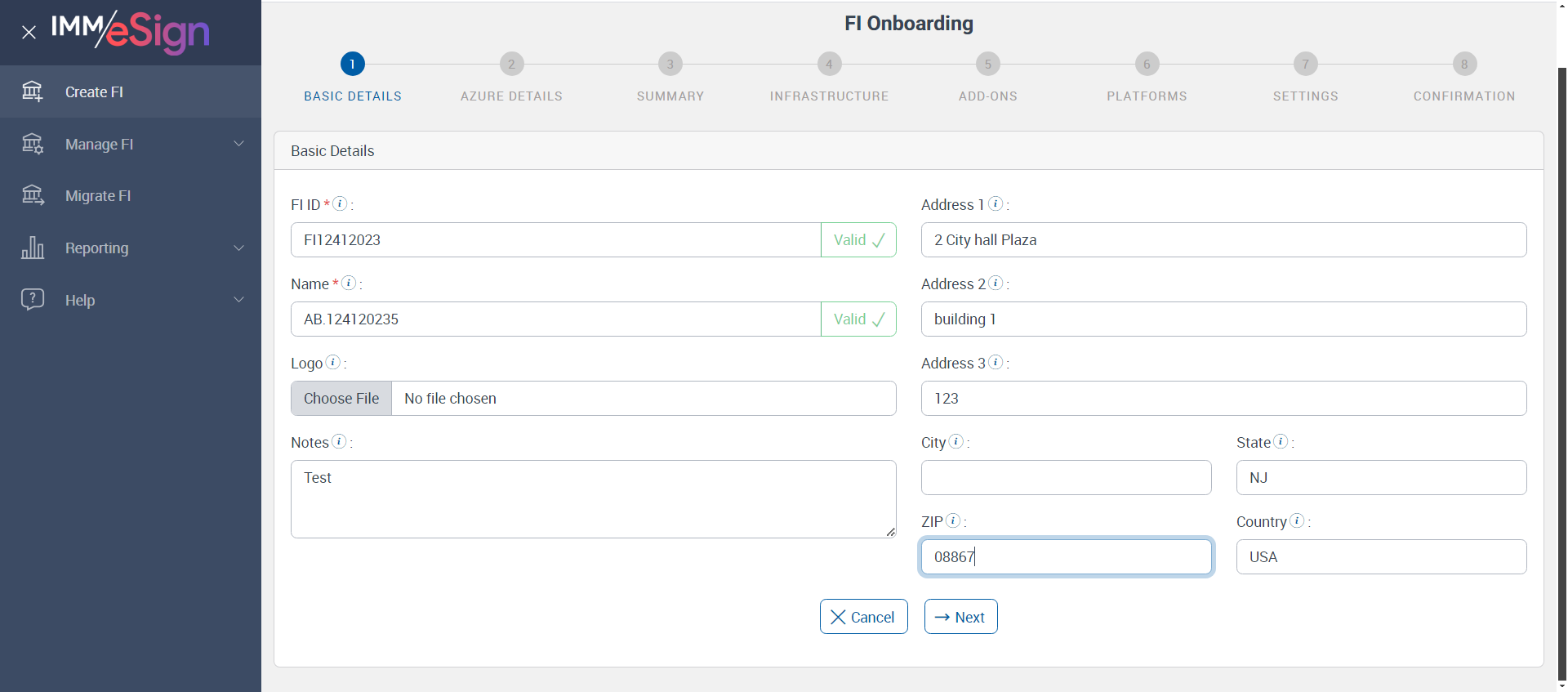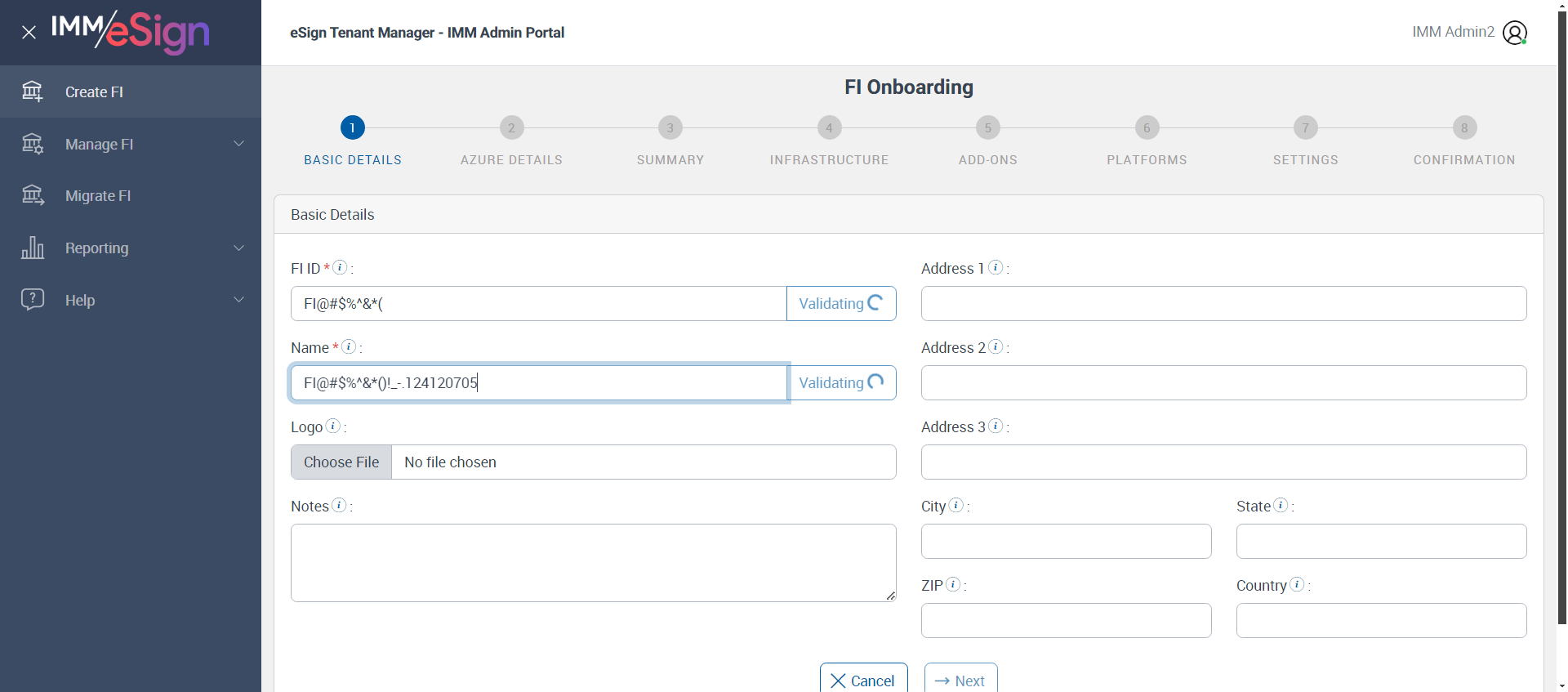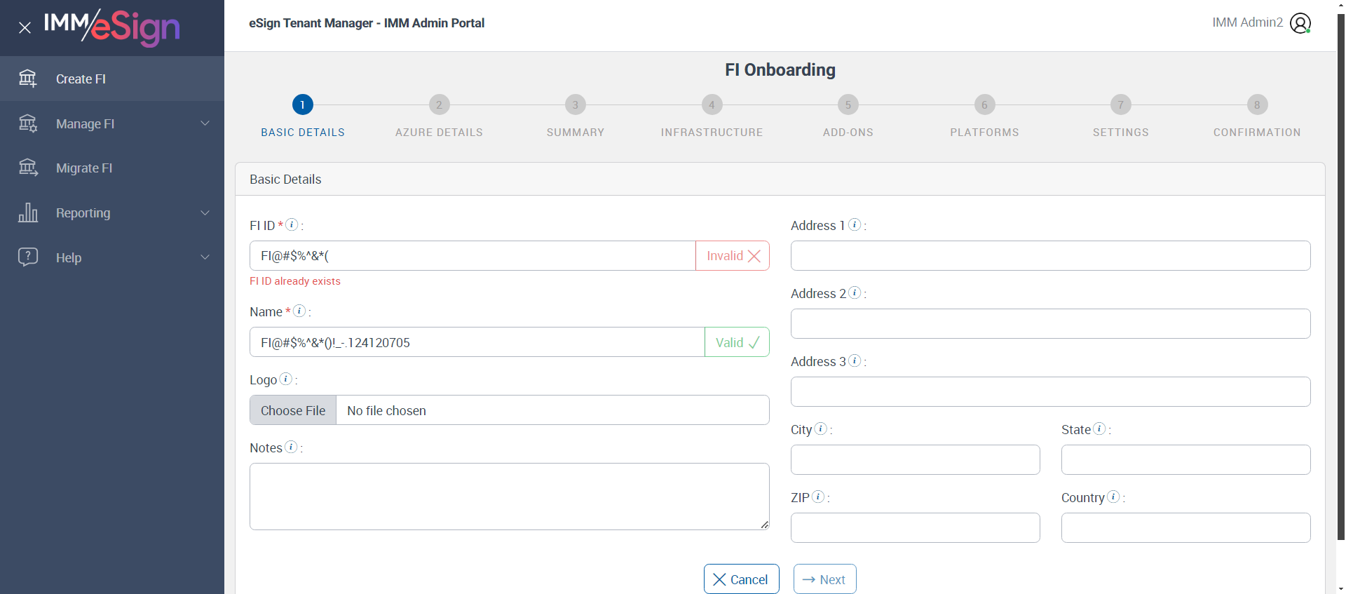 ({ZIP=08867-88=8;543;08867-8888, Dictionary=, StarterEvalDays=, Description=VerifyBasicDetails, Login_User_ID=immadmin2@immesignqa.onmicrosoft.com, FiStatus=Draft, StarterChecks=, eSignURL=, E-Vault=, Filepath=src/main/resources/testdata/files/logo.jfif;src/main/resources/testdata/files/google.png;src/main/resources/testdata/files/Sun_logo.png, Name=AB., LocalDomain=, TestID=VerifyBasicDetails, Verifast=, eSignPlus=, LacerPro=, RtmAuthTypes=, Notes=Test, Session URL=https://esignnonprod.immesign.com/qa/tenantmanager/, GlobalAdmin=, RemoteSign=, TypeOfUser=IMM Admin2, eValultDays=, DrpSpot=, ErrorMsg=FI ID already exists;Must be up to 10 characters with no spaces.;Must be up to 10 characters with no spaces.;;, Address2=building 1, AZDomain=, Address3=123, VerifastEDays=, Address1=2 City hall Plaza, City=Rahway, WrongAZDomain=, LCEvalDays=, State=NJ, LoanCoupon=, Login_Password=iMM@2022, WrongFIID=espRTS;Test Fi;ABCDxCompany, DrpEvalDays=, Country=USA, ClientID=, FIID=FI, Key=})