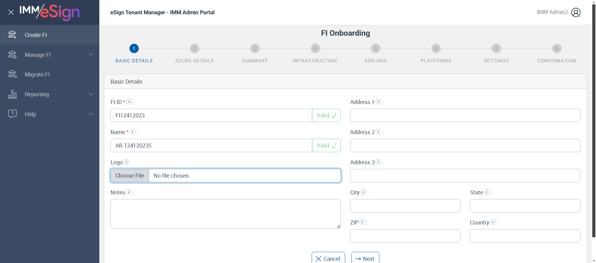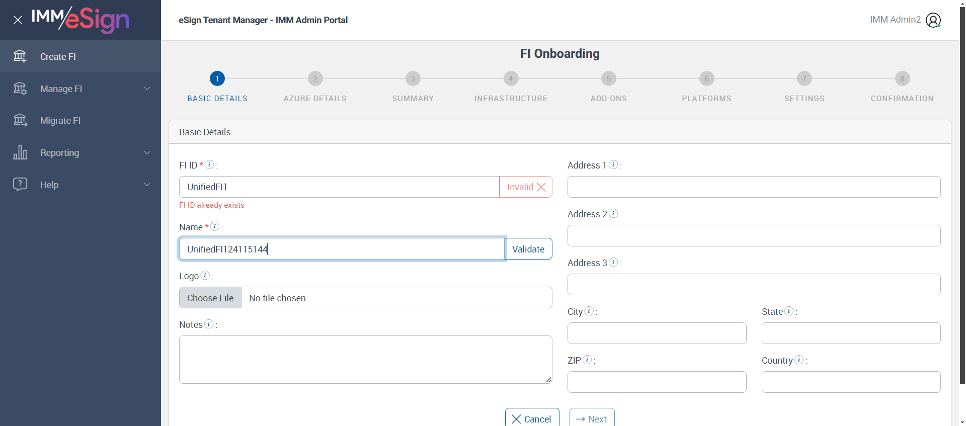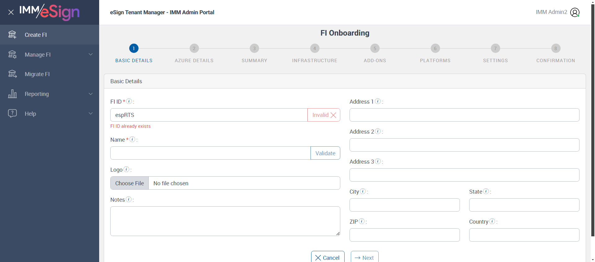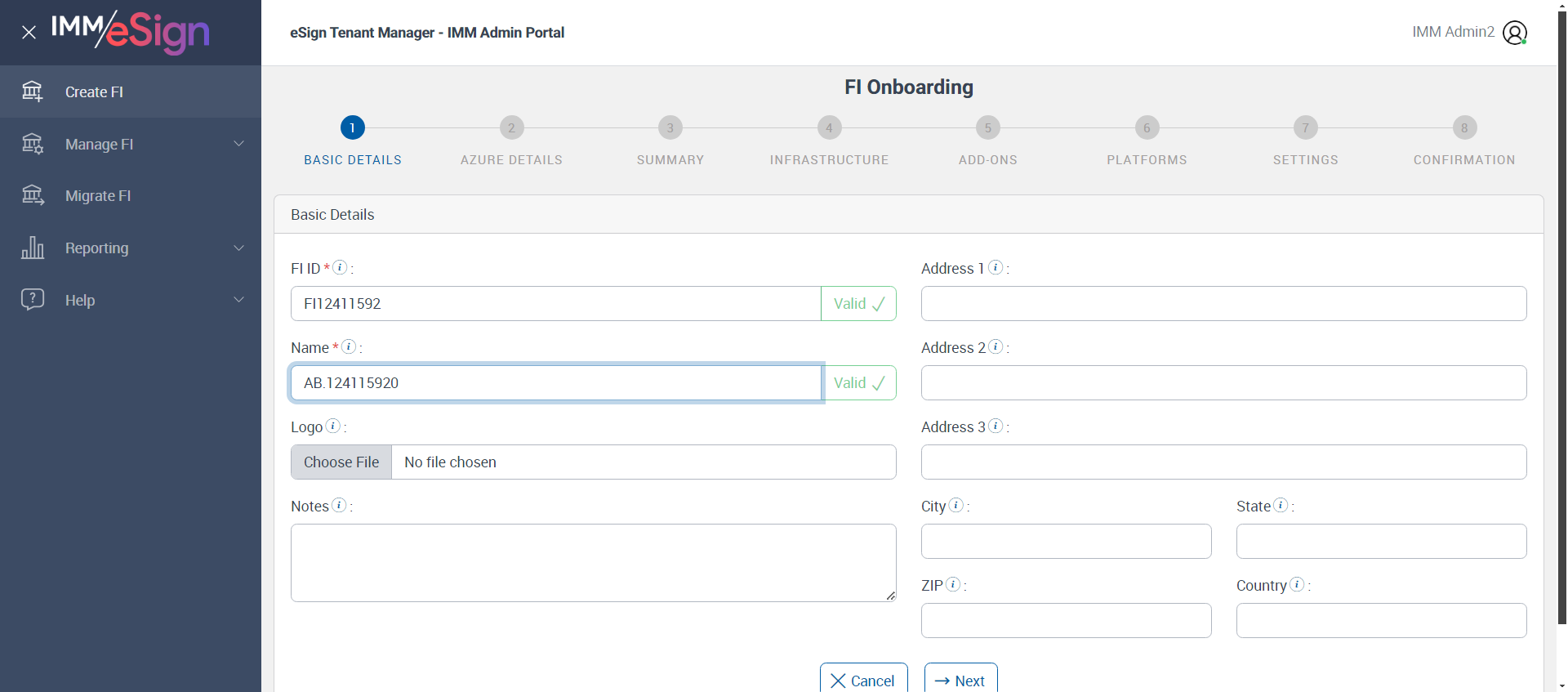 ({ZIP=08867-88=8;543;08867-8888, Dictionary=, StarterEvalDays=, Description=VerifyBasicDetails, Login_User_ID=immadmin2@immesignqa.onmicrosoft.com, FiStatus=Draft, StarterChecks=, eSignURL=, E-Vault=, Filepath=src/main/resources/testdata/files/logo.jfif;src/main/resources/testdata/files/google.png;src/main/resources/testdata/files/Sun_logo.png, Name=AB., LocalDomain=, TestID=VerifyBasicDetails, Verifast=, eSignPlus=, LacerPro=, RtmAuthTypes=, Notes=Test, Session URL=https://esignnonprod.immesign.com/qa/tenantmanager/, GlobalAdmin=, RemoteSign=, TypeOfUser=IMM Admin2, eValultDays=, DrpSpot=, ErrorMsg=FI ID already exists;Must be up to 10 characters with no spaces.;Must be up to 10 characters with no spaces.;;, Address2=building 1, AZDomain=, Address3=123, VerifastEDays=, Address1=2 City hall Plaza, City=Rahway, WrongAZDomain=, LCEvalDays=, State=NJ, LoanCoupon=, Login_Password=iMM@2022, WrongFIID=espRTS;Test Fi;ABCDxCompany, DrpEvalDays=, Country=USA, ClientID=, FIID=FI, Key=})