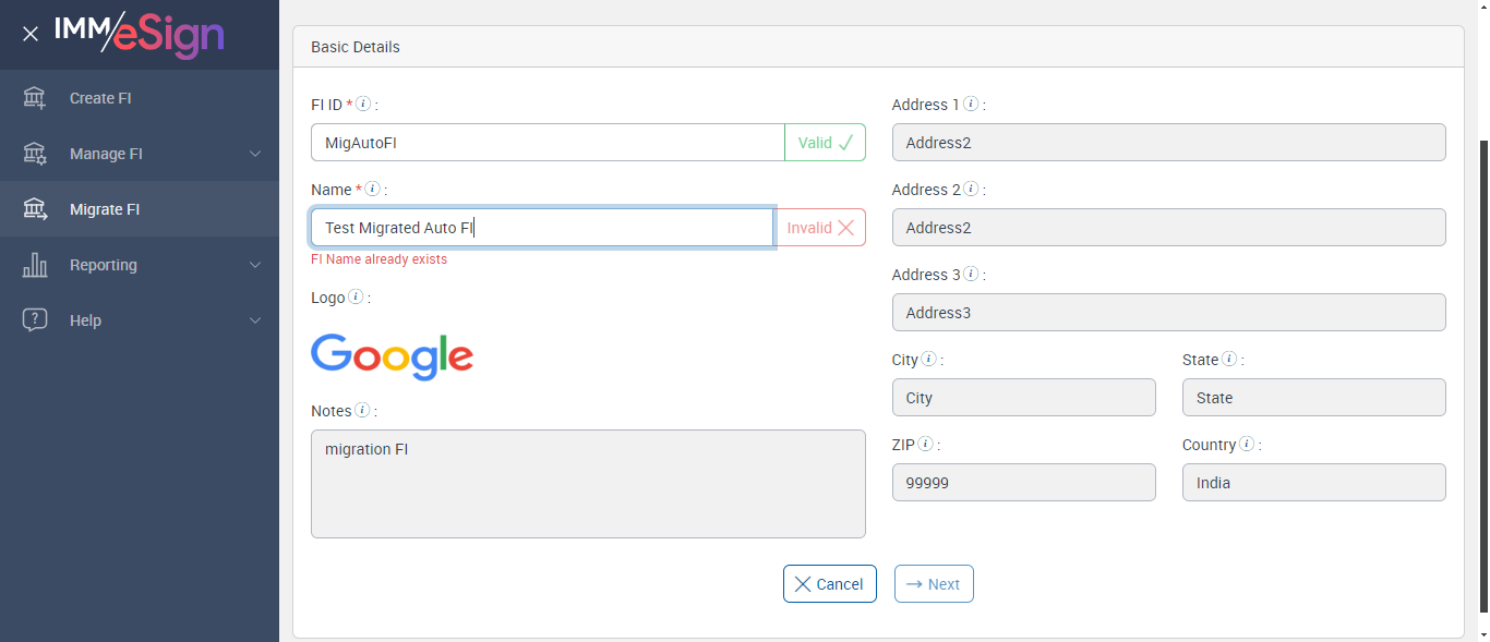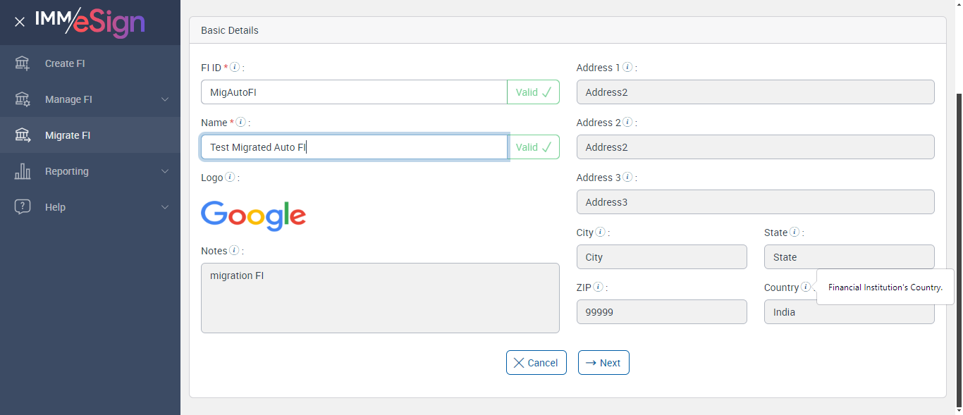 The logo should be a PNG file and less than 100 KB. Financial Institution's address. Financial Institution's address (contd.) Financial Institution's address (contd.) Financial Institution's State. [FI ID * :, Name * :, Logo :, Notes :, Address 1 :, Address 2 :, Address 3 :, City :, State :, ZIP :, Country :] [The Financial Institution Logo is used throughout eSign.