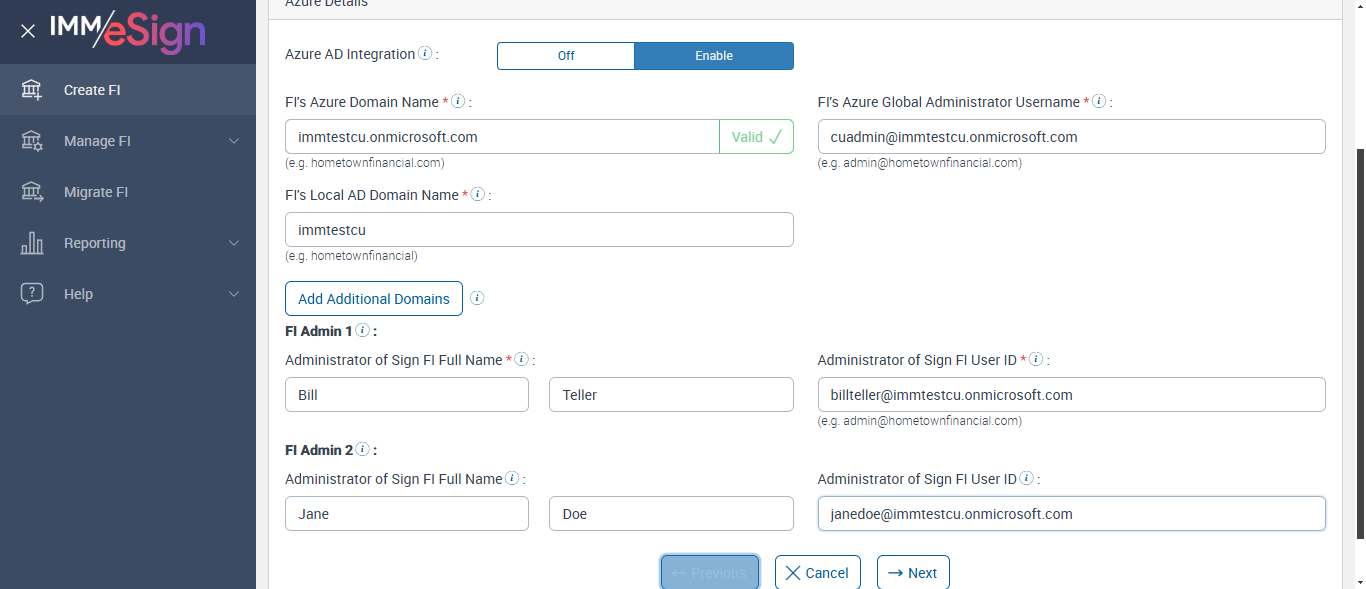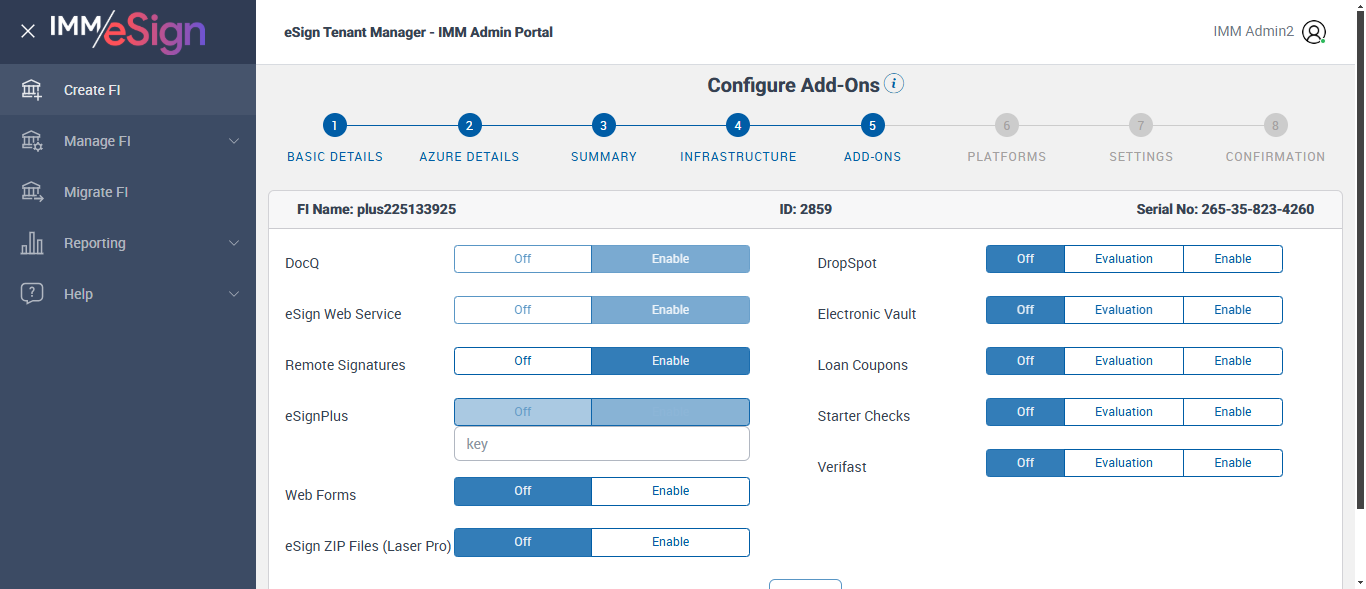 ({ZIP=08867, FiAdmin_FirstName=Bill,Jane, Dictionary=TeSign;XPLN, StarterEvalDays=, Description=Create New eSignPlus FI, Login_User_ID=immadmin2@immesignqa.onmicrosoft.com, FiStatus=Submitted, StarterChecks=Off, eSignURL=, E-Vault=Off, FiAdmin_LastName=Teller,Doe, Filepath=, Name=plus, LocalDomain=immtestcu, TestID=createeSignPlusFI, FiAdmin_UserID=billteller@immtestcu.onmicrosoft.com,janedoe@immtestcu.onmicrosoft.com, Verifast=Off, eSignPlus=Enable, LacerPro=Off, RtmAuthTypes=, Notes=Test, Session URL=https://esignnonprod.immesign.com/qa/tenantmanager/, GlobalAdmin=cuadmin@immtestcu.onmicrosoft.com, RemoteSign=Enable, TypeOfUser=IMM Admin2, eValultDays=, DrpSpot=Off, ErrorMsg=, Address2=building 1, AZDomain=immtestcu.onmicrosoft.com, Address3=123, VerifastEDays=, Address1=2 City hall Plaza, City=Rahway, WrongAZDomain=, LCEvalDays=, State=NJ, LoanCoupon=Off, Login_Password=iMM@2024, WrongFIID=, DrpEvalDays=, Country=USA, ClientID=3AAABLblqZhCQLd3zpFZKjJbAHz9Iltx9H66PUQv34Itep5CnjFb_Ehcl4GOj6Tx0Y5dNSNcgnfoFtmjwvBuopeEtD4QtE_yU, FIID=Plus, Key=a958c406-5127-4d2e-9d24-d441b447fa6a})