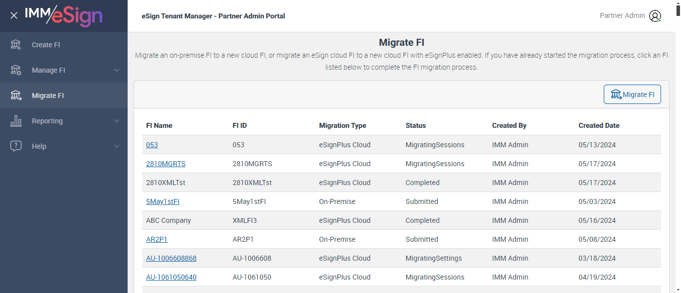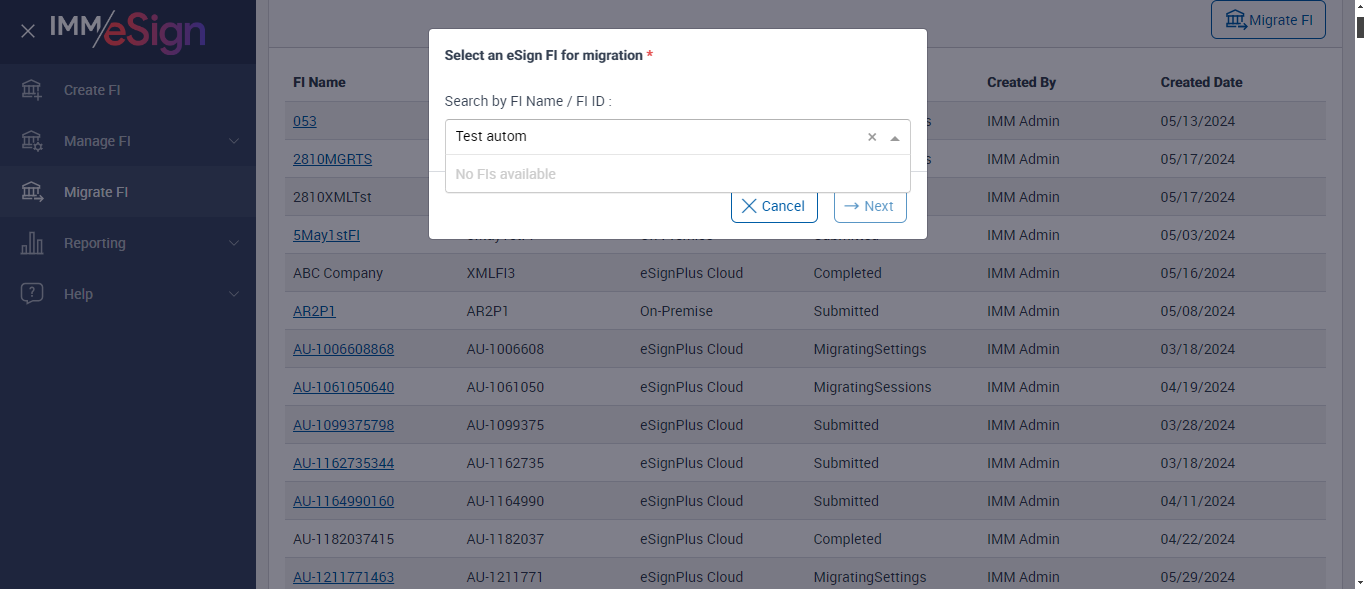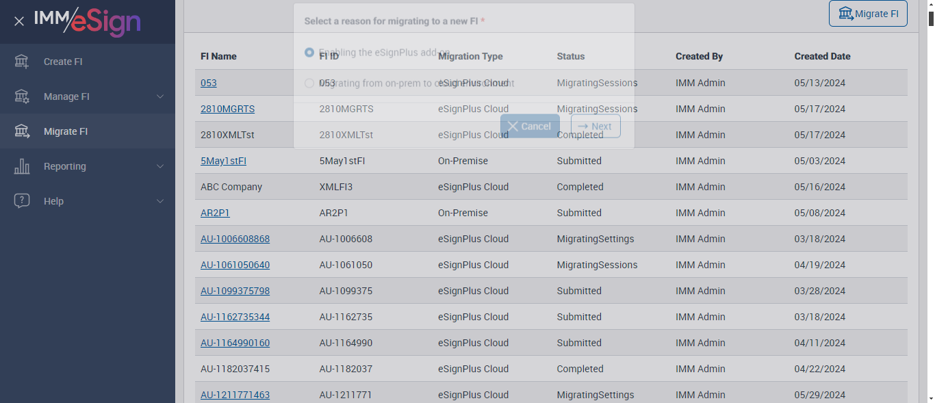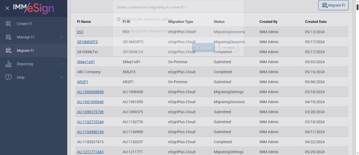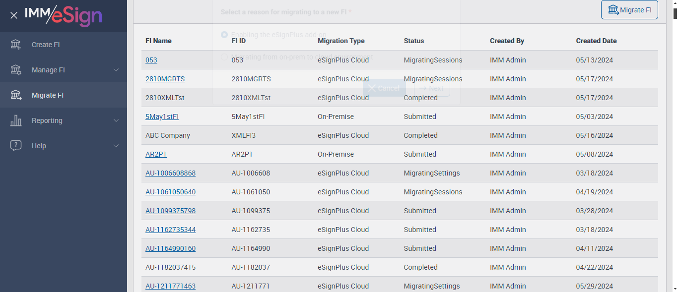 (verify that Manage FI display messages while migration is in progress for eSign and eSignPlus FI)