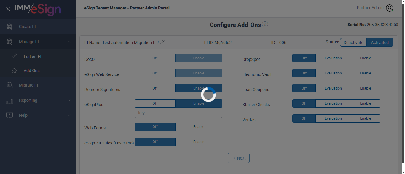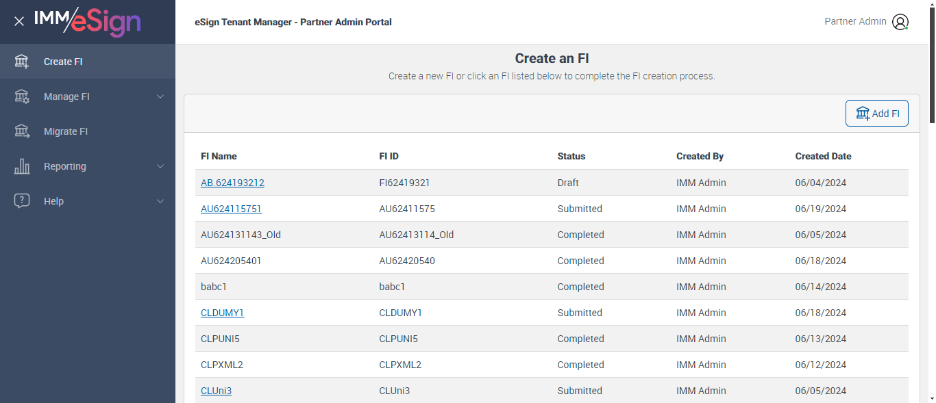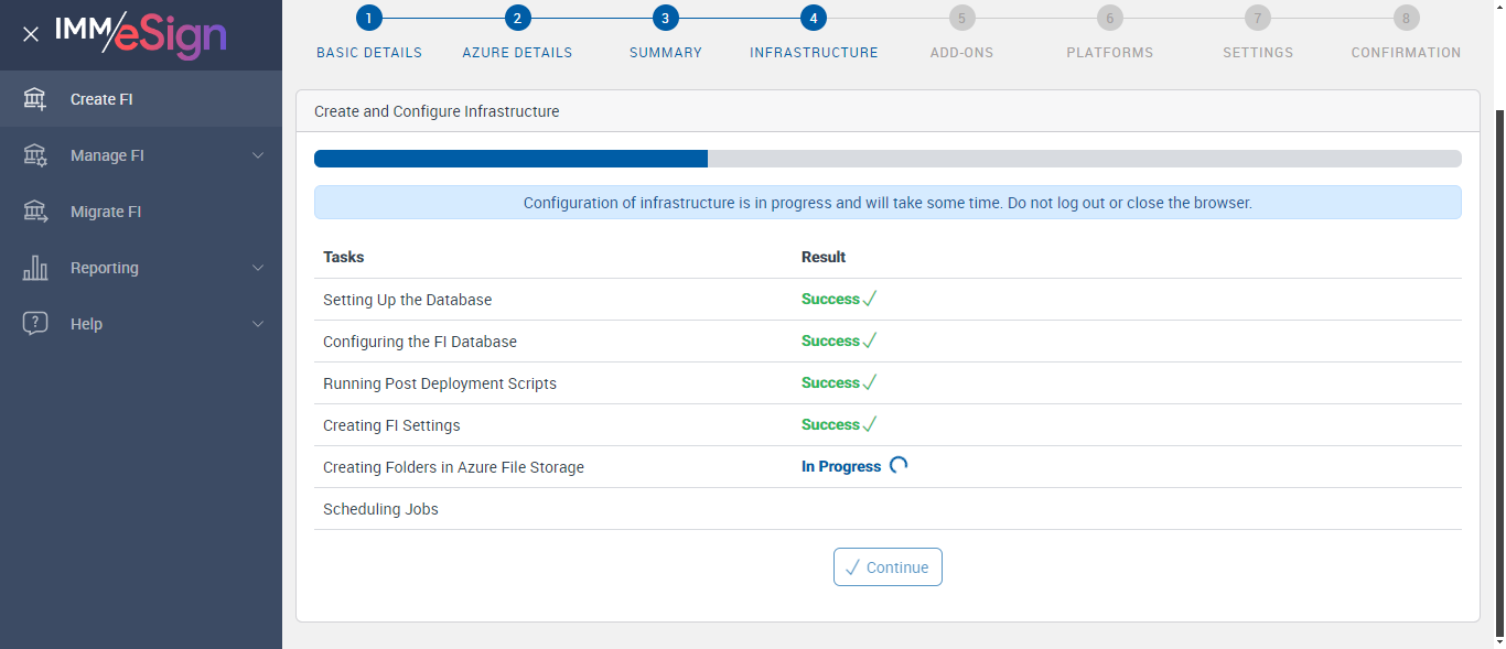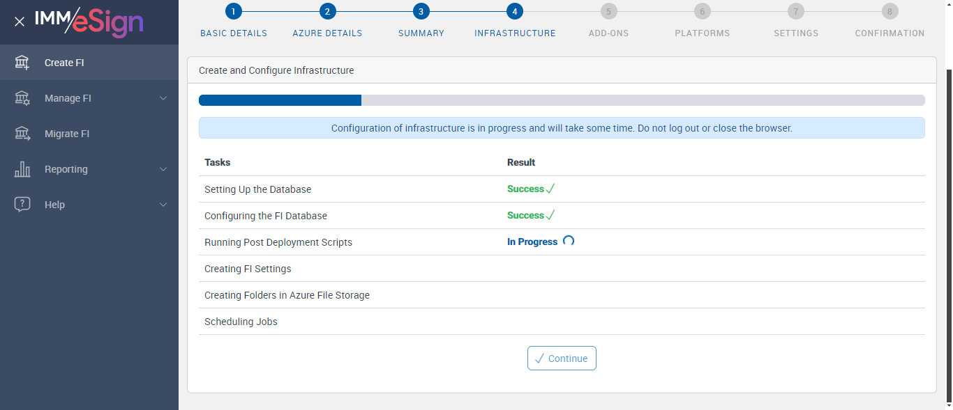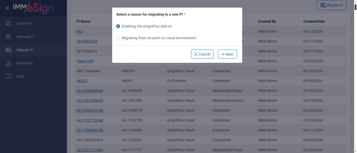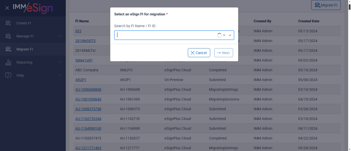 (verify that Manage FI display messages while migration is in progress for eSign and eSignPlus FI)