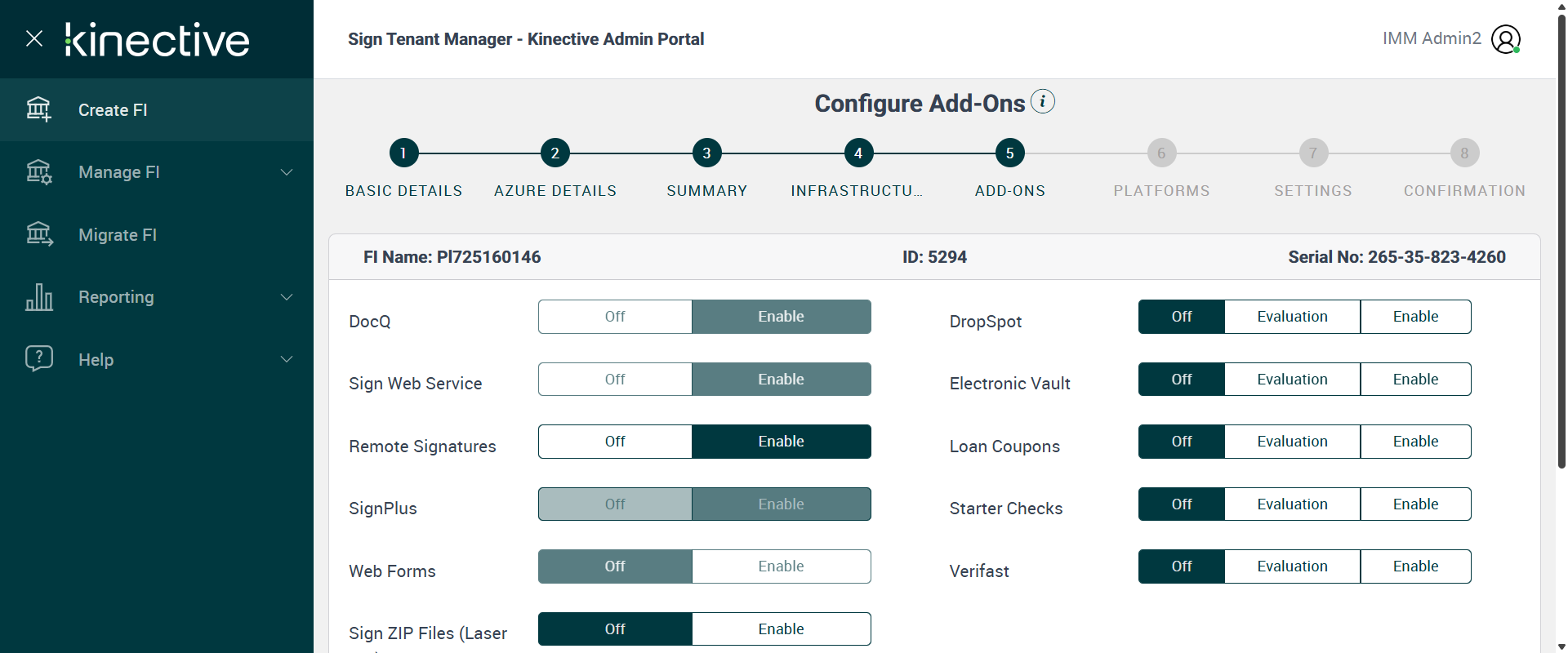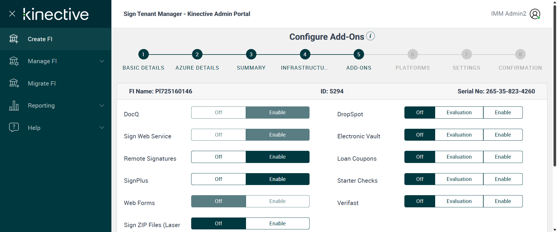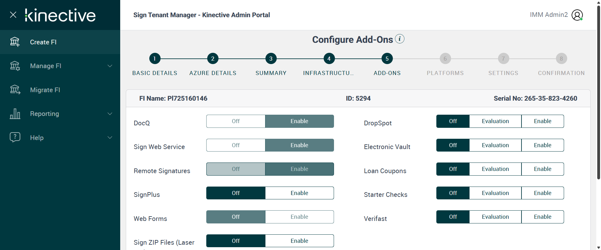 | {ZIP=08867, FiAdmin_FirstName=Bill,Jane, Dictionary=TeSign;XPLN, StarterEvalDays=, Description=Create New eSignPlus FI, Login_User_ID=immadmin2@immesignqa.onmicrosoft.com, FiStatus=Submitted, StarterChecks=Off, eSignURL=, E-Vault=Off, FiAdmin_LastName=Teller,Doe, Filepath=, Name=Pl, LocalDomain=immtestcu, TestID=createeSignPlusFI, FiAdmin_UserID=billteller@immtestcu.onmicrosoft.com,janedoe@immtestcu.onmicrosoft.com, Verifast=Off, eSignPlus=Enable, LacerPro=Off, RtmAuthTypes=, Notes=Test, Session URL=https://esignnonprod.immesign.com/qa/tenantmanager/, GlobalAdmin=cuadmin@immtestcu.onmicrosoft.com, RemoteSign=Enable, TypeOfUser=IMM Admin2, eValultDays=, DrpSpot=Off, ErrorMsg=, Address2=building 1, AZDomain=immtestcu.onmicrosoft.com, Address3=123, VerifastEDays=, Address1=2 City hall Plaza, City=Rahway, WrongAZDomain=, LCEvalDays=, State=NJ, LoanCoupon=Off, Login_Password=iMM@2022, WrongFIID=, DrpEvalDays=, Country=USA, ClientID=3AAABLblqZhCPfuU-npiCakOjy5Ut75_7222WMCDdpSBYYA0z9PZE7hXvVdJDXKIzDh0zkAVwUGLc4pVh3cU31w119aZm6Uu_, FIID=Pl, Key=a958c406-5127-4d2e-9d24-d441b447fa6a} |