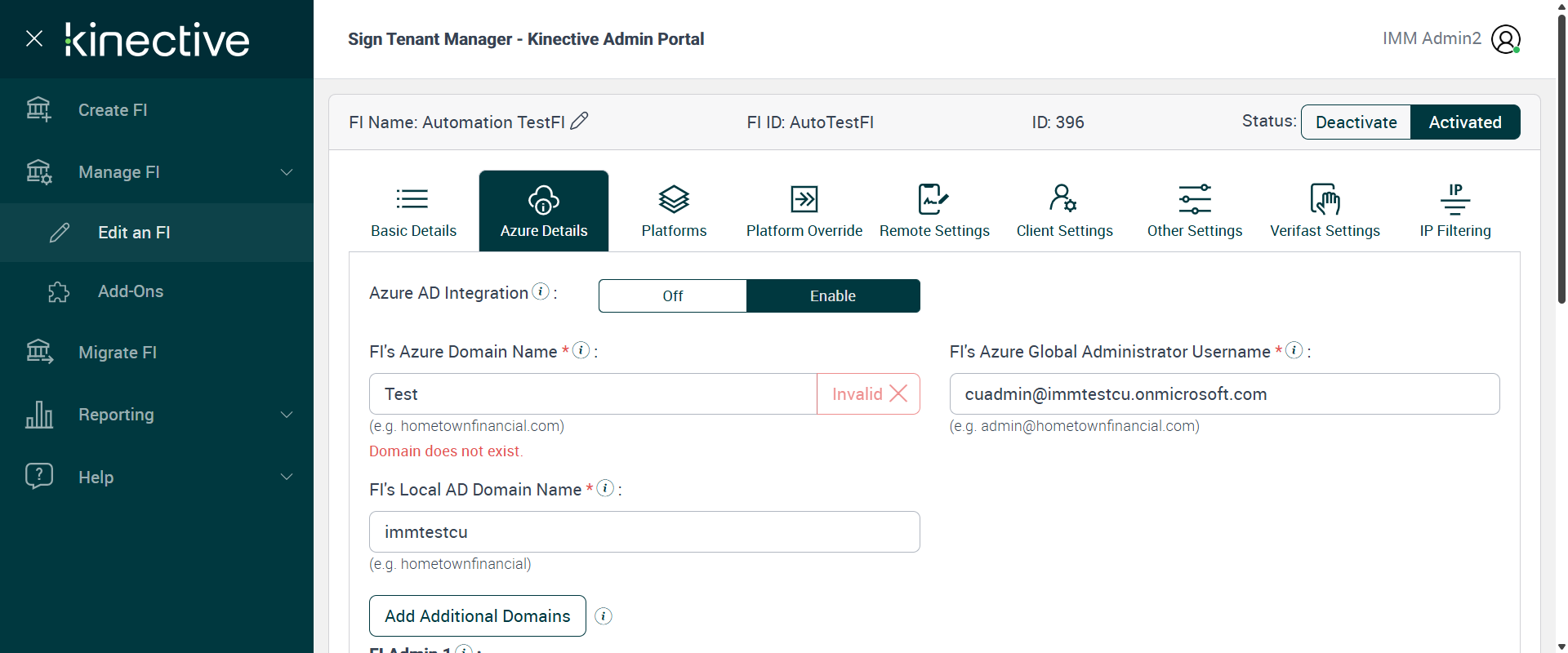 | {ZIP=, Description=verify Azure Details Tab, Login_User_ID=immadmin2@immesignqa.onmicrosoft.com, Platform=, ShortName=, Filepath=, Name=, LocalDomain=immtestcu, TestID=verifyAzureDetailsTabs, Dictionary Code=, createdFIStatus=, Notes=, Session URL=https://esignnonprod.immesign.com/qa/tenantmanager/, GlobalAdmin=test;test@123;admintestfi.com;cuadmin@immstestu.onmicrosoft.com, eSign URL=https://esignplusqa.immesign.com/teaasp/login.aspx, New Column=test;test@123;admintestfi.com;admin@yahoo.com, TypeOfUser=HostAdmin, ErrorMsg=FI Id already exists;Must be up to 10 characters with no spaces and special characters.;Must be up to 10 characters with no spaces and special characters.;;, Address2=, AZDomain=yahoo.com, Address3=, FI_ID=AutoTestFI, Address1=, City=, Dictionary Description=, Logo=, NameDescription=, WrongAZDomain=Test;hometown.com;yahoo.com, Tab=Basic Details,Azure Details,Platforms,Platform Override,Remote Settings,Client Settings,Other Settings,Verifast Settings,IP Filtering, State=, Login_Password=iMM@2022, FullName=, Country=, Dictionaries To Be Select=, ButtonToClick=, FIID=} |