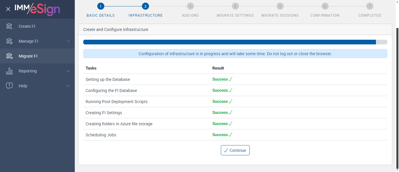 Loading... [ScreenShot] Successfully Configured 'Configuring the FI Template Defination' Successfully Configured 'Migrate Users and Groups Info' Successfully Configured 'Institution Settings' Successfully Configured 'Migrate Other Miscellaneous Settings' Successfully Configured 'Dictionaries and Field Mapping' Successfully Configured 'Preparing FI for Migration' Successfully Configured 'Webhook Creation' Retry Button is not showing --- 25 Apr 22:33:17 810 - Element is displayed:: [[RemoteWebDriver: chrome on Windows 10 (4cb1043af50703f2fca7574dff1111ae)] -> id: btnCompleteInfra] --- 25 Apr 22:33:24 911 - Element is displayed:: [[RemoteWebDriver: chrome on Windows 10 (4cb1043af50703f2fca7574dff1111ae)] -> id: btnCompleteInfra] --- 25 Apr 22:33:24 980 - Element is displayed:: [[RemoteWebDriver: chrome on Windows 10 (4cb1043af50703f2fca7574dff1111ae)] -> id: btnCompleteInfra] --- 25 Apr 22:33:25 130 - Page URL:: https://esignnonprod.immesign.com/qa/tenantmanager/#/fi/migrate/sessions/info --- 25 Apr 22:33:25 130 - 0 - Page Load Wait: (Sync) - com.imm.support.Utils.waitForPageLoad(Utils.java:136) --- 25 Apr 22:33:25 196 - Element is displayed:: [[RemoteWebDriver: chrome on Windows 10 (4cb1043af50703f2fca7574dff1111ae)] -> xpath: //*[contains(text(),'Preparing for Session Migration')]] --- 25 Apr 22:33:25 290 - Page URL:: https://esignnonprod.immesign.com/qa/tenantmanager/#/fi/migrate/sessions/info --- 25 Apr 22:33:25 290 - 0 - Page Load Wait: (Sync) - com.imm.support.Utils.waitForPageLoad(Utils.java:136) --- 25 Apr 22:33:25 366 - Element is displayed:: [[RemoteWebDriver: chrome on Windows 10 (4cb1043af50703f2fca7574dff1111ae)] -> css selector: .header] Clicked on Next Button ............Migrate Sessions Page............... Successfully navigated to the 'migrateSessions Page' page [ScreenShot] --- 25 Apr 22:33:27 782 - Page URL:: https://esignnonprod.immesign.com/qa/tenantmanager/#/fi/migrate --- 25 Apr 22:33:27 782 - 0 - Page Load Wait: (Sync) - com.imm.support.Utils.waitForPageLoad(Utils.java:136) --- 25 Apr 22:33:27 842 - Element is displayed:: [[RemoteWebDriver: chrome on Windows 10 (4cb1043af50703f2fca7574dff1111ae)] -> id: btnMigrateFI] --- 25 Apr 22:33:27 931 - Page URL:: https://esignnonprod.immesign.com/qa/tenantmanager/#/fi/migrate --- 25 Apr 22:33:27 931 - 0 - Page Load Wait: (Sync) - com.imm.support.Utils.waitForPageLoad(Utils.java:136) --- 25 Apr 22:33:28 047 - Element is displayed:: [[RemoteWebDriver: chrome on Windows 10 (4cb1043af50703f2fca7574dff1111ae)] -> css selector: .header] --- 25 Apr 22:33:28 121 - Page URL:: https://esignnonprod.immesign.com/qa/tenantmanager/#/fi/migrate --- 25 Apr 22:33:28 121 - 0 - Page Load Wait: (Sync) - com.imm.support.Utils.waitForPageLoad(Utils.java:136) Successfully validated Migrated fi status is : MigratingSettings [ScreenShot] --- 25 Apr 22:33:33 598 - Page URL:: https://esignnonprod.immesign.com/qa/tenantmanager/#/fi/migrate --- 25 Apr 22:33:33 598 - 0 - Page Load Wait: (Sync) - com.imm.support.Utils.waitForPageLoad(Utils.java:136) --- 25 Apr 22:33:33 988 - Page URL:: https://esignnonprod.immesign.com/qa/tenantmanager/#/fi/migrate --- 25 Apr 22:33:33 988 - 0 - Page Load Wait: (Sync) - com.imm.support.Utils.waitForPageLoad(Utils.java:136) --- 25 Apr 22:33:34 381 - Page URL:: https://esignnonprod.immesign.com/qa/tenantmanager/#/fi/migrate --- 25 Apr 22:33:34 381 - 0 - Page Load Wait: (Sync) - com.imm.support.Utils.waitForPageLoad(Utils.java:136) --- 25 Apr 22:33:34 767 - Page URL:: https://esignnonprod.immesign.com/qa/tenantmanager/#/fi/migrate --- 25 Apr 22:33:34 767 - 0 - Page Load Wait: (Sync) - com.imm.support.Utils.waitForPageLoad(Utils.java:136) --- 25 Apr 22:33:35 140 - Page URL:: https://esignnonprod.immesign.com/qa/tenantmanager/#/fi/migrate --- 25 Apr 22:33:35 140 - 0 - Page Load Wait: (Sync) - com.imm.support.Utils.waitForPageLoad(Utils.java:136) --- 25 Apr 22:33:35 548 - Page URL:: https://esignnonprod.immesign.com/qa/tenantmanager/#/fi/migrate --- 25 Apr 22:33:35 548 - 0 - Page Load Wait: (Sync) - com.imm.support.Utils.waitForPageLoad(Utils.java:136) --- 25 Apr 22:33:35 975 - Page URL:: https://esignnonprod.immesign.com/qa/tenantmanager/#/fi/migrate --- 25 Apr 22:33:35 975 - 0 - Page Load Wait: (Sync) - com.imm.support.Utils.waitForPageLoad(Utils.java:136) --- 25 Apr 22:33:36 499 - Page URL:: https://esignnonprod.immesign.com/qa/tenantmanager/#/fi/migrate --- 25 Apr 22:33:36 501 - 0 - Page Load Wait: (Sync) - com.imm.support.Utils.waitForPageLoad(Utils.java:136) --- 25 Apr 22:33:36 904 - Page URL:: https://esignnonprod.immesign.com/qa/tenantmanager/#/fi/migrate --- 25 Apr 22:33:36 904 - 0 - Page Load Wait: (Sync) - com.imm.support.Utils.waitForPageLoad(Utils.java:136) --- 25 Apr 22:33:37 275 - Page URL:: https://esignnonprod.immesign.com/qa/tenantmanager/#/fi/migrate --- 25 Apr 22:33:37 275 - 0 - Page Load Wait: (Sync) - com.imm.support.Utils.waitForPageLoad(Utils.java:136) --- 25 Apr 22:33:37 620 - Page URL:: https://esignnonprod.immesign.com/qa/tenantmanager/#/fi/migrate --- 25 Apr 22:33:37 621 - 0 - Page Load Wait: (Sync) - com.imm.support.Utils.waitForPageLoad(Utils.java:136) --- 25 Apr 22:33:37 968 - Page URL:: https://esignnonprod.immesign.com/qa/tenantmanager/#/fi/migrate --- 25 Apr 22:33:37 969 - 0 - Page Load Wait: (Sync) - com.imm.support.Utils.waitForPageLoad(Utils.java:136) --- 25 Apr 22:33:38 538 - Page URL:: https://esignnonprod.immesign.com/qa/tenantmanager/#/fi/migrate --- 25 Apr 22:33:38 539 - 0 - Page Load Wait: (Sync) - com.imm.support.Utils.waitForPageLoad(Utils.java:136) --- 25 Apr 22:33:38 990 - Page URL:: https://esignnonprod.immesign.com/qa/tenantmanager/#/fi/migrate --- 25 Apr 22:33:38 990 - 0 - Page Load Wait: (Sync) - com.imm.support.Utils.waitForPageLoad(Utils.java:136) --- 25 Apr 22:33:39 369 - Page URL:: https://esignnonprod.immesign.com/qa/tenantmanager/#/fi/migrate --- 25 Apr 22:33:39 370 - 0 - Page Load Wait: (Sync) - com.imm.support.Utils.waitForPageLoad(Utils.java:136) --- 25 Apr 22:33:39 882 -