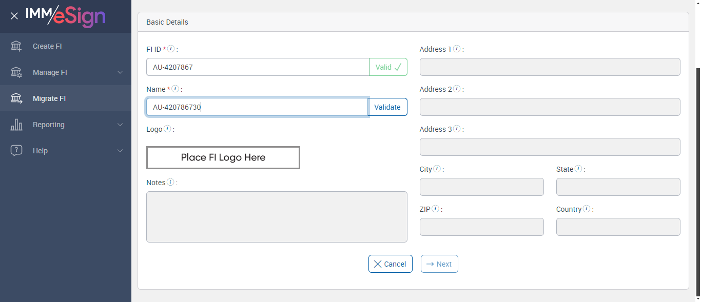 The name will display on the Help > About page. This is meant for saving extra notes about the Financial Institution. Financial Institution's address. Financial Institution's address (contd.) Financial Institution's address (contd.) Financial Institution's City. Financial Institution's State. [FI ID * :, Name * :, Logo :, Notes :, Address 1 :, Address 2 :, Address 3 :, City :, State :, ZIP :, Country :] [The Financial Institution Logo is used throughout eSign.