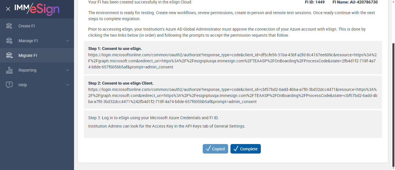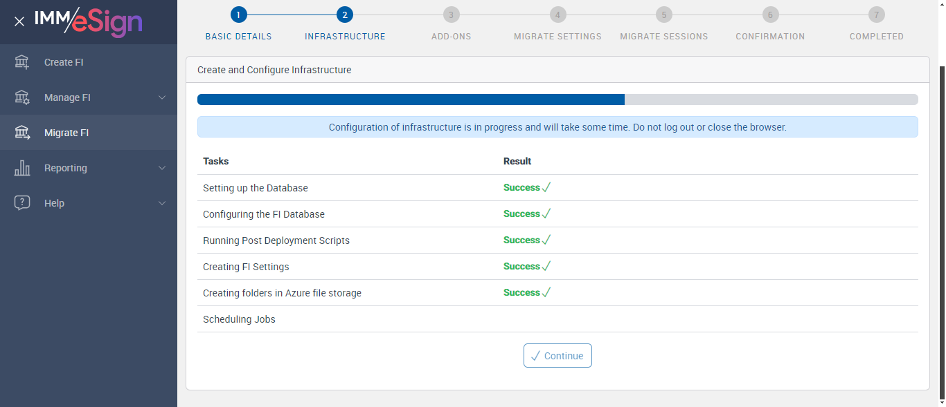 The name will display on the Help > About page., , This is meant for saving extra notes about the Financial Institution., Financial Institution's address., Financial Institution's address (contd.), Financial Institution's address (contd.), Financial Institution's City., Financial Institution's State., ] * * FI ID * : equals FI ID * : Name * : equals Name * : Logo : equals Logo : Notes : equals Notes : Address 1 : equals Address 1 : Address 2 : equals Address 2 : Address 3 : equals Address 3 : City : equals City : State : equals State : ZIP : equals ZIP : Country : equals Country : Successfully validated Basic Details labels [ScreenShot] ...........Migration - Infrastructure Page.............. --- 25 Apr 22:46:30 462 - Element is displayed:: [[RemoteWebDriver: chrome on Windows 10 (49fd26bf052ad7c881635e32e7081158)] -> id: btnNext] --- 25 Apr 22:46:32 755 - Page URL:: https://esignnonprod.immesign.com/qa/tenantmanager/#/fi/migrate/basic --- 25 Apr 22:46:32 755 - 0 - Page Load Wait: (Sync) - com.imm.support.Utils.waitForPageLoad(Utils.java:136) --- 25 Apr 22:46:32 835 - Page URL:: https://esignnonprod.immesign.com/qa/tenantmanager/#/fi/migrate/basic --- 25 Apr 22:46:32 835 - 0 - Page Load Wait: (Sync) - com.imm.support.Utils.waitForPageLoad(Utils.java:136) --- 25 Apr 22:46:34 028 - Element is displayed:: [[RemoteWebDriver: chrome on Windows 10 (49fd26bf052ad7c881635e32e7081158)] -> xpath: //*[contains(text(),'Configure Infrastructure')]] --- 25 Apr 22:46:34 101 - Page URL:: https://esignnonprod.immesign.com/qa/tenantmanager/#/fi/migrate/infrastructure --- 25 Apr 22:46:34 101 - 0 - Page Load Wait: (Sync) - com.imm.support.Utils.waitForPageLoad(Utils.java:136) --- 25 Apr 22:46:34 183 - Element is displayed:: [[RemoteWebDriver: chrome on Windows 10 (49fd26bf052ad7c881635e32e7081158)] -> css selector: .header] Successfully navigated to the 'InfrastructurePage' page [ScreenShot] --- 25 Apr 22:46:34 478 - Element is displayed:: [[RemoteWebDriver: chrome on Windows 10 (49fd26bf052ad7c881635e32e7081158)] -> id: infraMessage] Verified Configuration message Continue button is disabled Found Result for Setting up the Database - Success [ScreenShot] Successfully Configured 'Setting up the Databse' FoundResult for Configuring the FI Database -Success [ScreenShot] Successfully Configured 'Configuring the FI Database' Found Result for Running Post Deployment ScriptsSuccess [ScreenShot] Successfully Configured 'Running Post Deployment Scripts' Found Result for Creating FI SettingsSuccess [ScreenShot] Successfully Configured 'Creating FI Settings' Found Result fotr Creating folders in Azure file storageSuccess [ScreenShot] Successfully Configured 'Creating folders in Azure file storage' Found Result for Scheduling JobsSuccess [ScreenShot] Successfully Configured 'Scheduling Jobs' Retry Button is not showing --- 25 Apr 22:50:10 440 - Element is displayed:: [[RemoteWebDriver: chrome on Windows 10 (49fd26bf052ad7c881635e32e7081158)] -> id: btnCompleteInfra] --- 25 Apr 22:50:17 553 - Element is displayed:: [[RemoteWebDriver: chrome on Windows 10 (49fd26bf052ad7c881635e32e7081158)] -> id: btnCompleteInfra] --- 25 Apr 22:50:17 630 - Element is displayed:: [[RemoteWebDriver: chrome on Windows 10 (49fd26bf052ad7c881635e32e7081158)] -> id: btnCompleteInfra] --- 25 Apr 22:50:17 818 - Page URL:: https://esignnonprod.immesign.com/qa/tenantmanager/#/fi/migrate/addons --- 25 Apr 22:50:17 818 - 0 - Page Load Wait: (Sync) - com.imm.support.Utils.waitForPageLoad(Utils.java:136) --- 25 Apr 22:50:17 882 - Element is displayed:: [[RemoteWebDriver: chrome on Windows 10 (49fd26bf052ad7c881635e32e7081158)] -> id: step_title] --- 25 Apr 22:50:17 983 - Page URL:: https://esignnonprod.immesign.com/qa/tenantmanager/#/fi/migrate/addons --- 25 Apr 22:50:17 983 - 0 - Page Load Wait: (Sync) - com.imm.support.Utils.waitForPageLoad(Utils.java:136) --- 25 Apr 22:50:18 061 - Element is displayed:: [[RemoteWebDriver: chrome on Windows 10 (49fd26bf052ad7c881635e32e7081158)] -> css selector: .header] Clicked 'Next' button .......Migration - Add-Ons Page.......... --- 25 Apr 22:50:18 147 - Page URL:: https://esignnonprod.immesign.com/qa/tenantmanager/#/fi/migrate/addons --- 25 Apr 22:50:18 147 - 0 - Page Load Wait: (Sync) - com.imm.support.Utils.waitForPageLoad(Utils.java:136) --- 25 Apr 22:50:18 196 - Element is displayed:: [[RemoteWebDriver: chrome on Windows 10 (49fd26bf052ad7c881635e32e7081158)] -> id: step_title] --- 25 Apr 22:50:18 301 - Page URL:: https://esignnonprod.immesign.com/qa/tenantmanager/#/fi/migrate/addons --- 25 Apr 22:50:18 301 - 0 - Page Load Wait: (Sync) - com.imm.support.Utils.waitForPageLoad(Utils.java:136) --- 25 Apr 22:50:18 377 - Element is displayed:: [[RemoteWebDriver: chrome on Windows 10 (49fd26bf052ad7c881635e32e7081158)] -> css selector: .header] Successfully navigated to the 'Add-Ons Page' page [ScreenShot] --- 25 Apr 22:50:18 616 - Page URL:: https://esignnonprod.immesign.com/qa/tenantmanager/#/fi/migrate/addons --- 25 Apr 22:50:18 616 - 0 - Page Load Wait: (Sync) - com.imm.support.Utils.waitForPageLoad(Utils.java:136) --- 25 Apr 22:50:20 934 - Page URL:: https://esignnonprod.immesign.com/qa/tenantmanager/#/fi/migrate --- 25 Apr 22:50:20 934 - 0 - Page Load Wait: (Sync) - com.imm.support.Utils.waitForPageLoad(Utils.java:136) --- 25 Apr 22:50:20 990 - Element is displayed:: [[RemoteWebDriver: chrome on Windows 10 (49fd26bf052ad7c881635e32e7081158)] -> id: btnMigrateFI] --- 25 Apr 22:50:21 048 - Page URL:: https://esignnonprod.immesign.com/qa/tenantmanager/#/fi/migrate --- 25 Apr 22:50:21 048 - 0 - Page Load Wait: (Sync) - com.imm.support.Utils.waitForPageLoad(Utils.java:136) --- 25 Apr 22:50:21 123 - Element is displayed:: [[RemoteWebDriver: chrome on Windows 10 (49fd26bf052ad7c881635e32e7081158)] -> css selector: .header] --- 25 Apr 22:50:21 180 - Page URL:: https://esignnonprod.immesign.com/qa/tenantmanager/#/fi/migrate --- 25 Apr 22:50:21 180 - 0 - Page Load Wait: (Sync) - com.imm.support.Utils.waitForPageLo