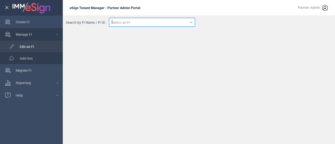 'Search by FI Name/Host FIID' displayed in 'Manage FI' page [ScreenShot]