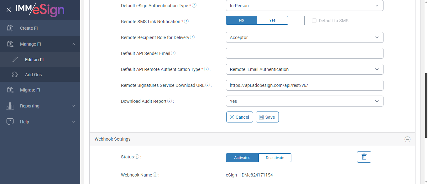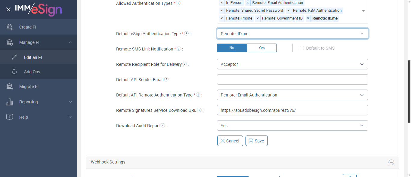 Default eSign Authentication Type values 'Remote: ID.Me' in ManageFI [In-Person, Remote: Email Authentication, Remote: Shared Secret Password, Remote: KBA Authentication, Remote: Phone, Remote: Government ID, Remote: ID.me] |