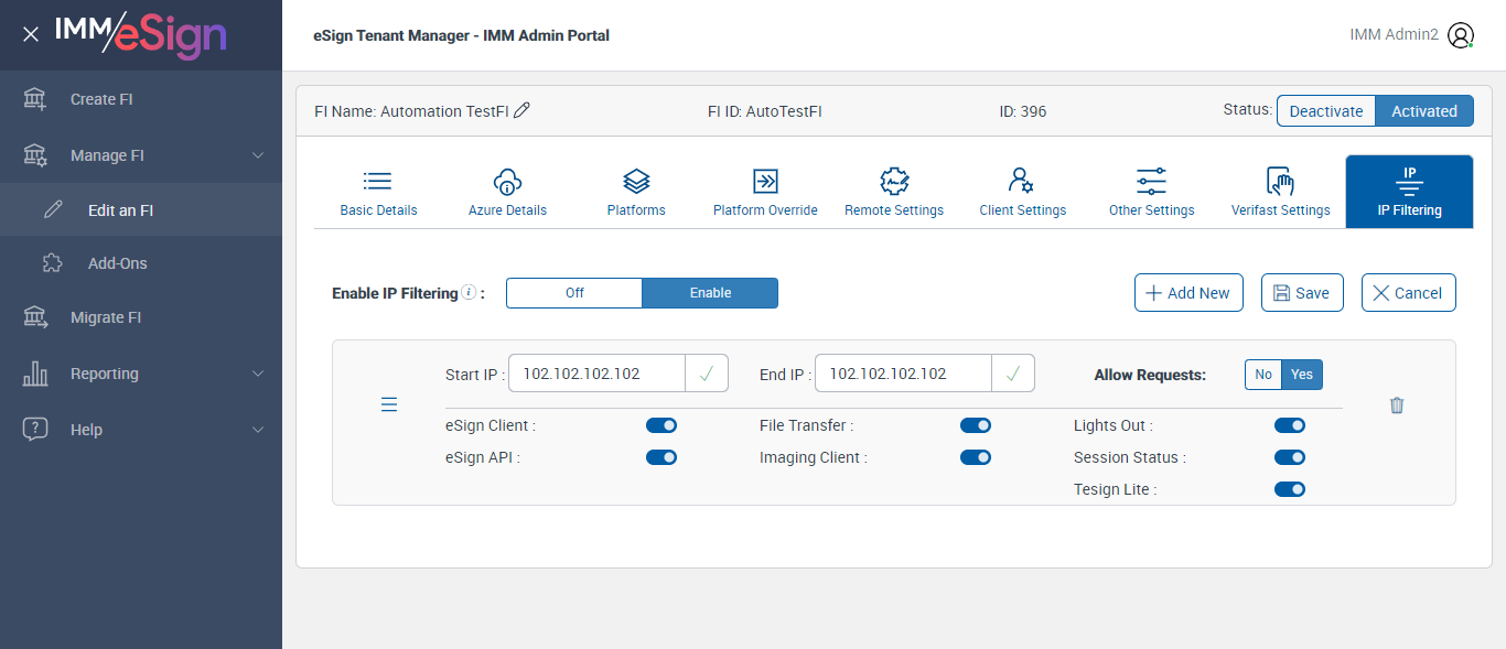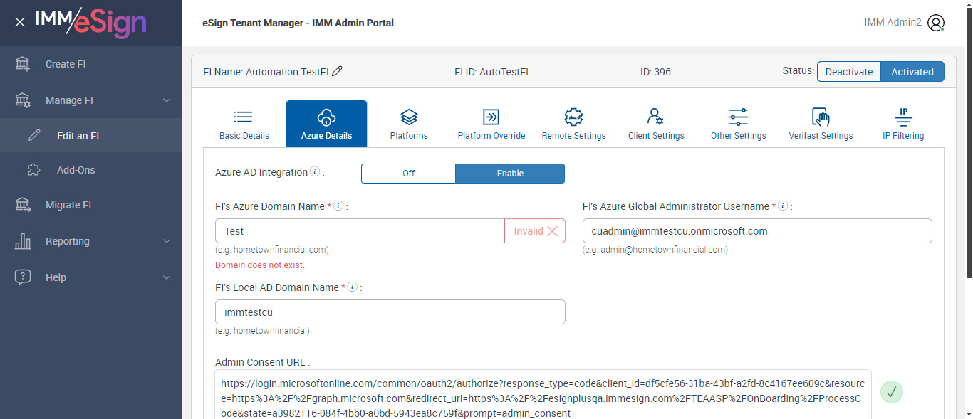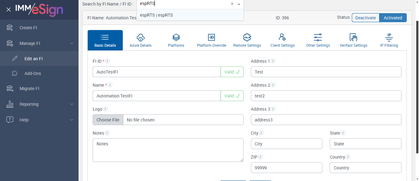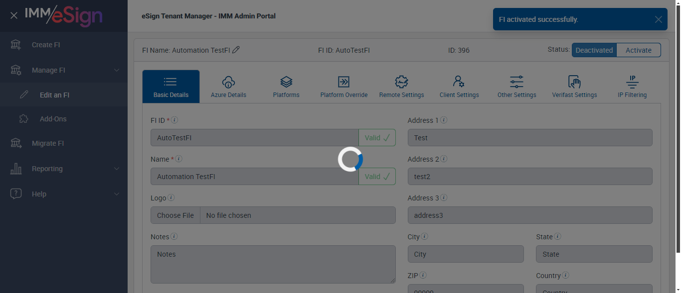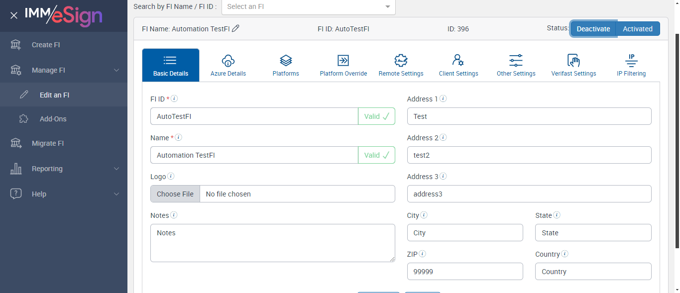 ({ZIP=0756, Description=Verify Activate and Deactivate FI, Login_User_ID=immadmin2@immesignqa.onmicrosoft.com, Platform=, ShortName=, Filepath=, Name=AUTest, LocalDomain=, TestID=verifyActivateAndDeactivateFI, Dictionary Code=, createdFIStatus=Draft, Notes=Test, Session URL=https://esignnonprod.immesign.com/qa/tenantmanager/, GlobalAdmin=, eSign URL=https://esignplusqa.immesign.com/teaasp/login.aspx, New Column=, TypeOfUser=HostAdmin, ErrorMsg=FI Id already exists;Must be up to 10 characters with no spaces and special characters.;Must be up to 10 characters with no spaces and special characters.;;, Address2=building 1, AZDomain=, Address3=123, FI_ID=AutoTestFI, Address1=2 City hall Plaza, City=Rahway, Dictionary Description=, Logo=, NameDescription=, WrongAZDomain=, Tab=Basic Details,Azure Details,Platforms,Platform Override,Remote Settings,Client Settings,Other Settings,Verifast Settings,IP Filtering, State=NJ, Login_Password=iMM@2022, FullName=, Country=USA, Dictionaries To Be Select=, ButtonToClick=Save, FIID=espxml;Test Fi;Fi&2;ABCDCompany})