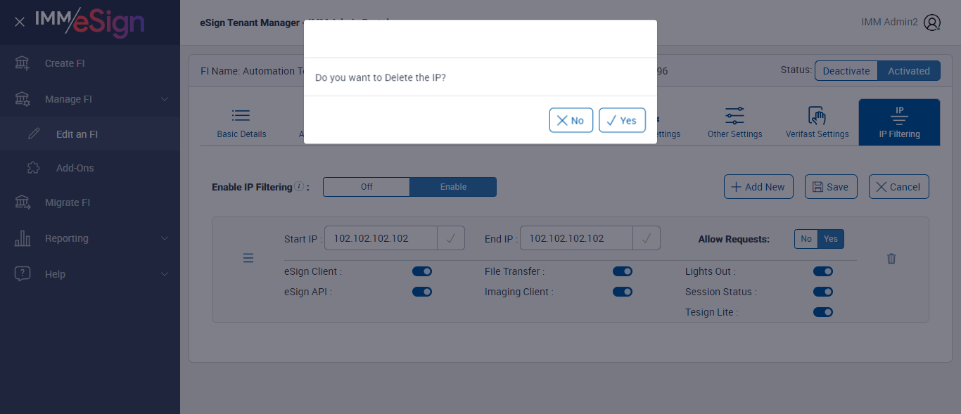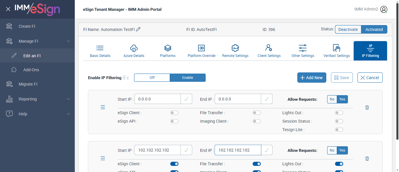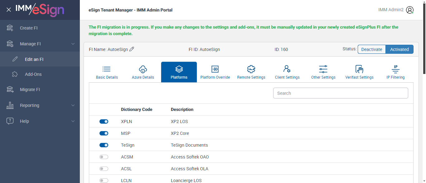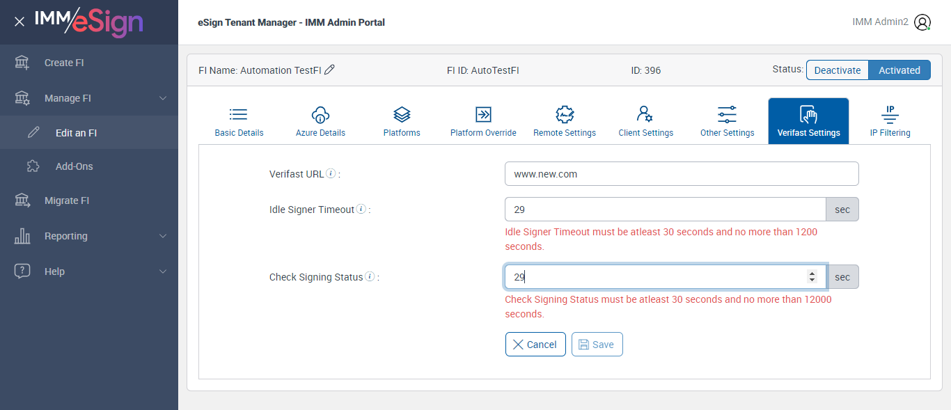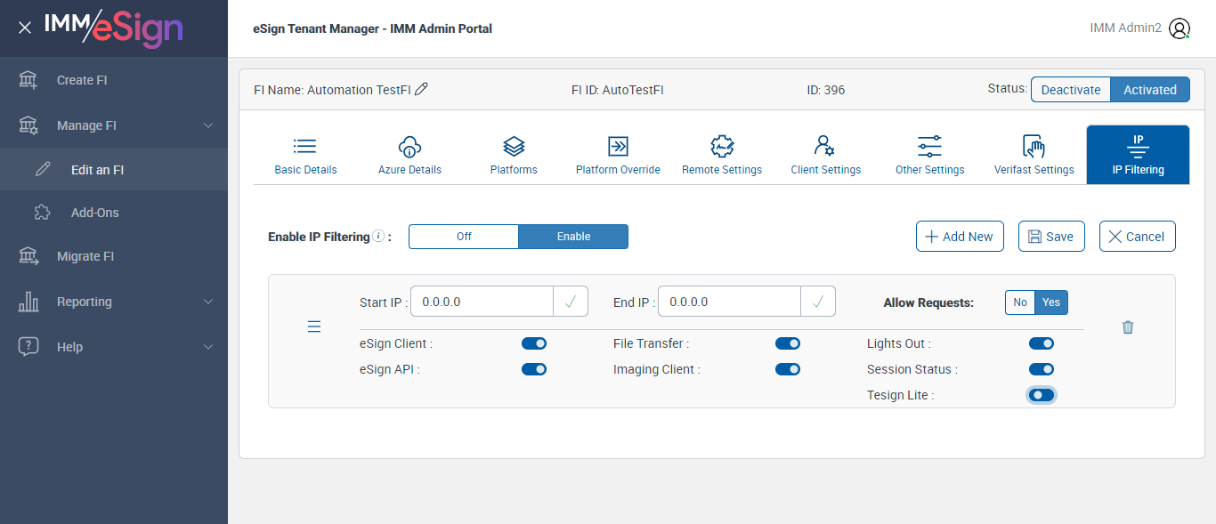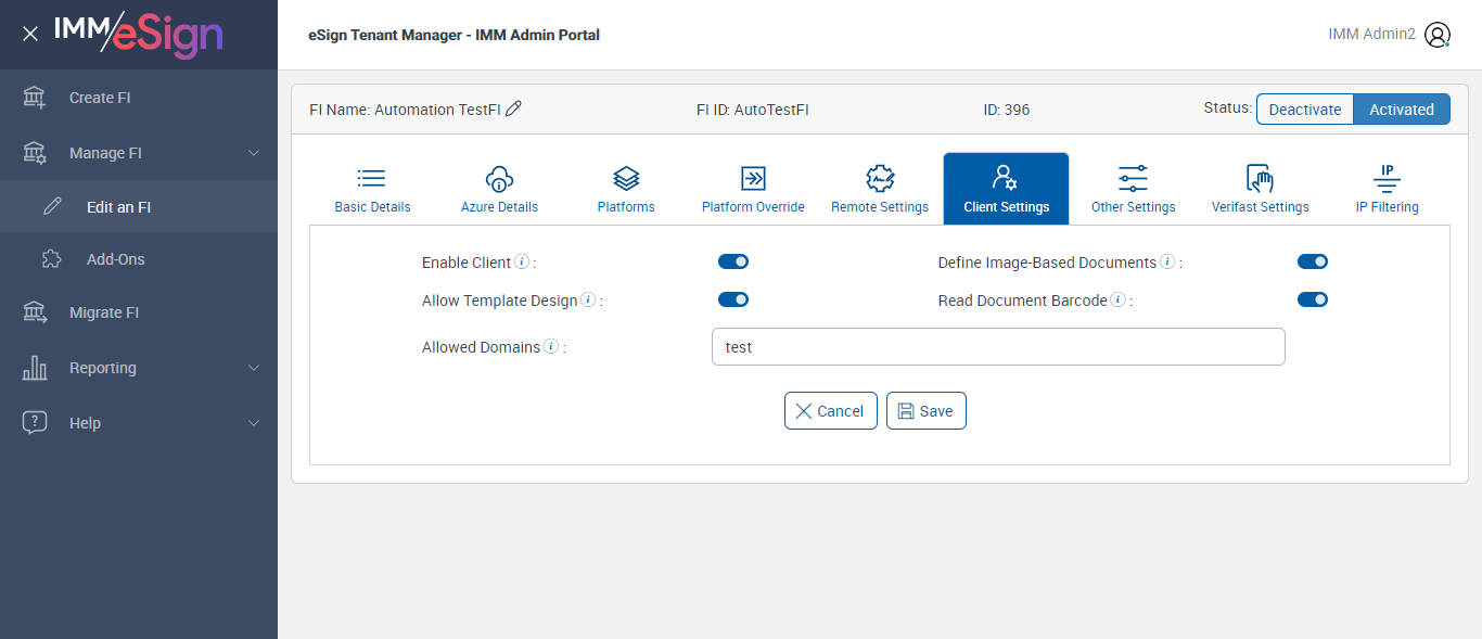 ({ZIP=0756, Description=Verify Activate and Deactivate FI, Login_User_ID=immadmin2@immesignqa.onmicrosoft.com, Platform=, ShortName=, Filepath=, Name=AUTest, LocalDomain=, TestID=verifyActivateAndDeactivateFI, Dictionary Code=, createdFIStatus=Draft, Notes=Test, Session URL=https://esignnonprod.immesign.com/qa/tenantmanager/, GlobalAdmin=, eSign URL=https://esignplusqa.immesign.com/teaasp/login.aspx, New Column=, TypeOfUser=HostAdmin, ErrorMsg=FI Id already exists;Must be up to 10 characters with no spaces and special characters.;Must be up to 10 characters with no spaces and special characters.;;, Address2=building 1, AZDomain=, Address3=123, FI_ID=AutoTestFI, Address1=2 City hall Plaza, City=Rahway, Dictionary Description=, Logo=, NameDescription=, WrongAZDomain=, Tab=Basic Details,Azure Details,Platforms,Platform Override,Remote Settings,Client Settings,Other Settings,Verifast Settings,IP Filtering, State=NJ, Login_Password=iMM@2022, FullName=, Country=USA, Dictionaries To Be Select=, ButtonToClick=Save, FIID=espxml;Test Fi;Fi&2;ABCDCompany})