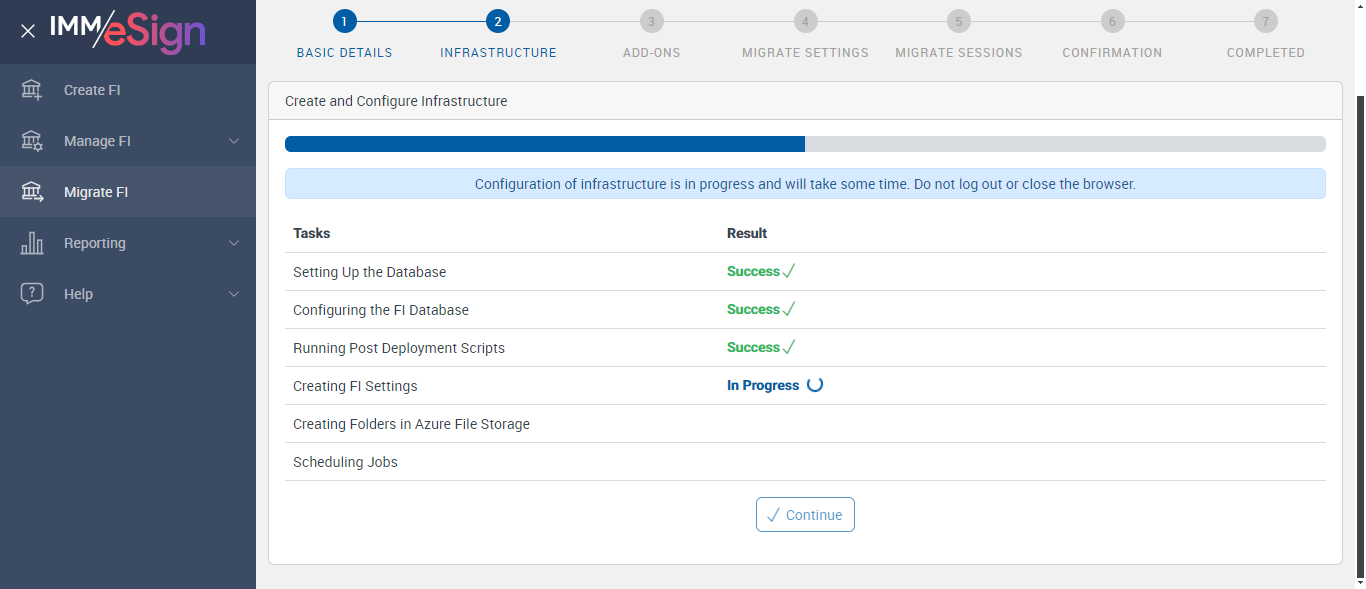 Must be in 99999 or 99999-9999 format.] * * FI ID * : equals FI ID * : Name * : equals Name * : Logo : equals Logo : Notes : equals Notes : Address 1 : equals Address 1 : Address 2 : equals Address 2 : Address 3 : equals Address 3 : City : equals City : State : equals State : ZIP : equals ZIP : Country : equals Country : Successfully validated Basic Details labels [ScreenShot] ...........Migration - Infrastructure Page.............. --- 30 May 13:12:52 012 - Element is displayed:: [[RemoteWebDriver: chrome on Windows 10 (a93e0a0d5f5311c6e9f335fddc8e0130)] -> id: btnNext] --- 30 May 13:12:54 277 - Page URL:: https://esignnonprod.immesign.com/qa/tenantmanager/#/fi/migrate/basic --- 30 May 13:12:54 278 - 0 - Page Load Wait: (Sync) - com.imm.support.Utils.waitForPageLoad(Utils.java:136) --- 30 May 13:12:54 365 - Page URL:: https://esignnonprod.immesign.com/qa/tenantmanager/#/fi/migrate/basic --- 30 May 13:12:54 365 - 0 - Page Load Wait: (Sync) - com.imm.support.Utils.waitForPageLoad(Utils.java:136) --- 30 May 13:12:56 094 - Element is displayed:: [[RemoteWebDriver: chrome on Windows 10 (a93e0a0d5f5311c6e9f335fddc8e0130)] -> xpath: //*[contains(text(),'Configure Infrastructure')]] --- 30 May 13:12:56 154 - Page URL:: https://esignnonprod.immesign.com/qa/tenantmanager/#/fi/migrate/infrastructure --- 30 May 13:12:56 155 - 0 - Page Load Wait: (Sync) - com.imm.support.Utils.waitForPageLoad(Utils.java:136) --- 30 May 13:12:56 227 - Element is displayed:: [[RemoteWebDriver: chrome on Windows 10 (a93e0a0d5f5311c6e9f335fddc8e0130)] -> css selector: .header] Successfully navigated to the 'InfrastructurePage' page [ScreenShot] --- 30 May 13:12:56 409 - Element is displayed:: [[RemoteWebDriver: chrome on Windows 10 (a93e0a0d5f5311c6e9f335fddc8e0130)] -> id: infraMessage] Verified Configuration message Continue button is disabled Found Result for Setting up the Database - Success [ScreenShot] Successfully Configured 'Setting up the Databse' FoundResult for Configuring the FI Database -Success [ScreenShot] Successfully Configured 'Configuring the FI Database' Found Result for Running Post Deployment ScriptsSuccess [ScreenShot] Successfully Configured 'Running Post Deployment Scripts' Found Result for Creating FI SettingsSuccess [ScreenShot] Successfully Configured 'Creating FI Settings' Found Result fotr Creating folders in Azure file storageSuccess [ScreenShot] Successfully Configured 'Creating folders in Azure file storage' Found Result for Scheduling JobsSuccess [ScreenShot] Successfully Configured 'Scheduling Jobs' Boolean values true Successfully validated all Jobs titles [ScreenShot] Retry Button is not showing --- 30 May 13:16:41 617 - Element is displayed:: [[RemoteWebDriver: chrome on Windows 10 (a93e0a0d5f5311c6e9f335fddc8e0130)] -> id: btnCompleteInfra] --- 30 May 13:16:48 767 - Element is displayed:: [[RemoteWebDriver: chrome on Windows 10 (a93e0a0d5f5311c6e9f335fddc8e0130)] -> id: btnCompleteInfra] --- 30 May 13:16:48 834 - Element is displayed:: [[RemoteWebDriver: chrome on Windows 10 (a93e0a0d5f5311c6e9f335fddc8e0130)] -> id: btnCompleteInfra] --- 30 May 13:16:49 008 - Page URL:: https://esignnonprod.immesign.com/qa/tenantmanager/#/fi/migrate/addons --- 30 May 13:16:49 008 - 0 - Page Load Wait: (Sync) - com.imm.support.Utils.waitForPageLoad(Utils.java:136) --- 30 May 13:16:49 063 - Element is displayed:: [[RemoteWebDriver: chrome on Windows 10 (a93e0a0d5f5311c6e9f335fddc8e0130)] -> id: step_title] --- 30 May 13:16:49 150 - Page URL:: https://esignnonprod.immesign.com/qa/tenantmanager/#/fi/migrate/addons --- 30 May 13:16:49 150 - 0 - Page Load Wait: (Sync) - com.imm.support.Utils.waitForPageLoad(Utils.java:136) --- 30 May 13:16:49 221 - Element is displayed:: [[RemoteWebDriver: chrome on Windows 10 (a93e0a0d5f5311c6e9f335fddc8e0130)] -> css selector: .header] Clicked 'Next' button .......Migration - Add-Ons Page.......... --- 30 May 13:16:49 299 - Page URL:: https://esignnonprod.immesign.com/qa/tenantmanager/#/fi/migrate/addons --- 30 May 13:16:49 299 - 0 - Page Load Wait: (Sync) - com.imm.support.Utils.waitForPageLoad(Utils.java:136) --- 30 May 13:16:49 348 - Element is displayed:: [[RemoteWebDriver: chrome on Windows 10 (a93e0a0d5f5311c6e9f335fddc8e0130)] -> id: step_title] --- 30 May 13:16:49 427 - Page URL:: https://esignnonprod.immesign.com/qa/tenantmanager/#/fi/migrate/addons --- 30 May 13:16:49 427 - 0 - Page Load Wait: (Sync) - com.imm.support.Utils.waitForPageLoad(Utils.java:136) --- 30 May 13:16:49 492 - Element is displayed:: [[RemoteWebDriver: chrome on Windows 10 (a93e0a0d5f5311c6e9f335fddc8e0130)] -> css selector: .header] Successfully navigated to the 'Add-Ons Page' page [ScreenShot] --- 30 May 13:16:49 717 - Page URL:: https://esignnonprod.immesign.com/qa/tenantmanager/#/fi/migrate/addons --- 30 May 13:16:49 717 - 0 - Page Load Wait: (Sync) - com.imm.support.Utils.waitForPageLoad(Utils.java:136) --- 30 May 13:16:52 047 - Page URL:: https://esignnonprod.immesign.com/qa/tenantmanager/#/fi/migrate --- 30 May 13:16:52 048 - 0 - Page Load Wait: (Sync) - com.imm.support.Utils.waitForPageLoad(Utils.java:136) --- 30 May 13:16:55 613 - Page URL:: https://esignnonprod.immesign.com/qa/tenantmanager/#/fi/migrate --- 30 May 13:16:55 613 - 0 - Page Load Wait: (Sync) - com.imm.support.Utils.waitForPageLoad(Utils.java:136) --- 30 May 13:16:55 667 - Element is displayed:: [[RemoteWebDriver: chrome on Windows 10 (a93e0a0d5f5311c6e9f335fddc8e0130)] -> id: createdFIList] --- 30 May 13:16:55 723 - Element is displayed:: [[RemoteWebDriver: chrome on Windows 10 (a93e0a0d5f5311c6e9f335fddc8e0130)] -> id: btnMigrateFI] Migrate FI Page open up [ScreenShot] --- 30 May 13:16:56 321 - Page URL:: https://esignnonprod.immesign.com/qa/tenantmanager/#/fi/migrate --- 30 May 13:16:56 321 - 0 - Page Load Wait: (Sync) - com.imm.support.Utils.waitForPageLoad(Utils.java:136) --- 30 May 13:16:56 388 - Element is displayed:: [[RemoteWebDriver: chrome on Windows 10 (a93e0a0d5f5311c6e9f335fddc8e0130)] -> css selector:
